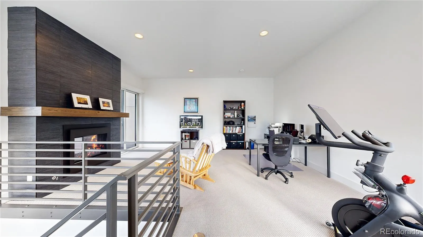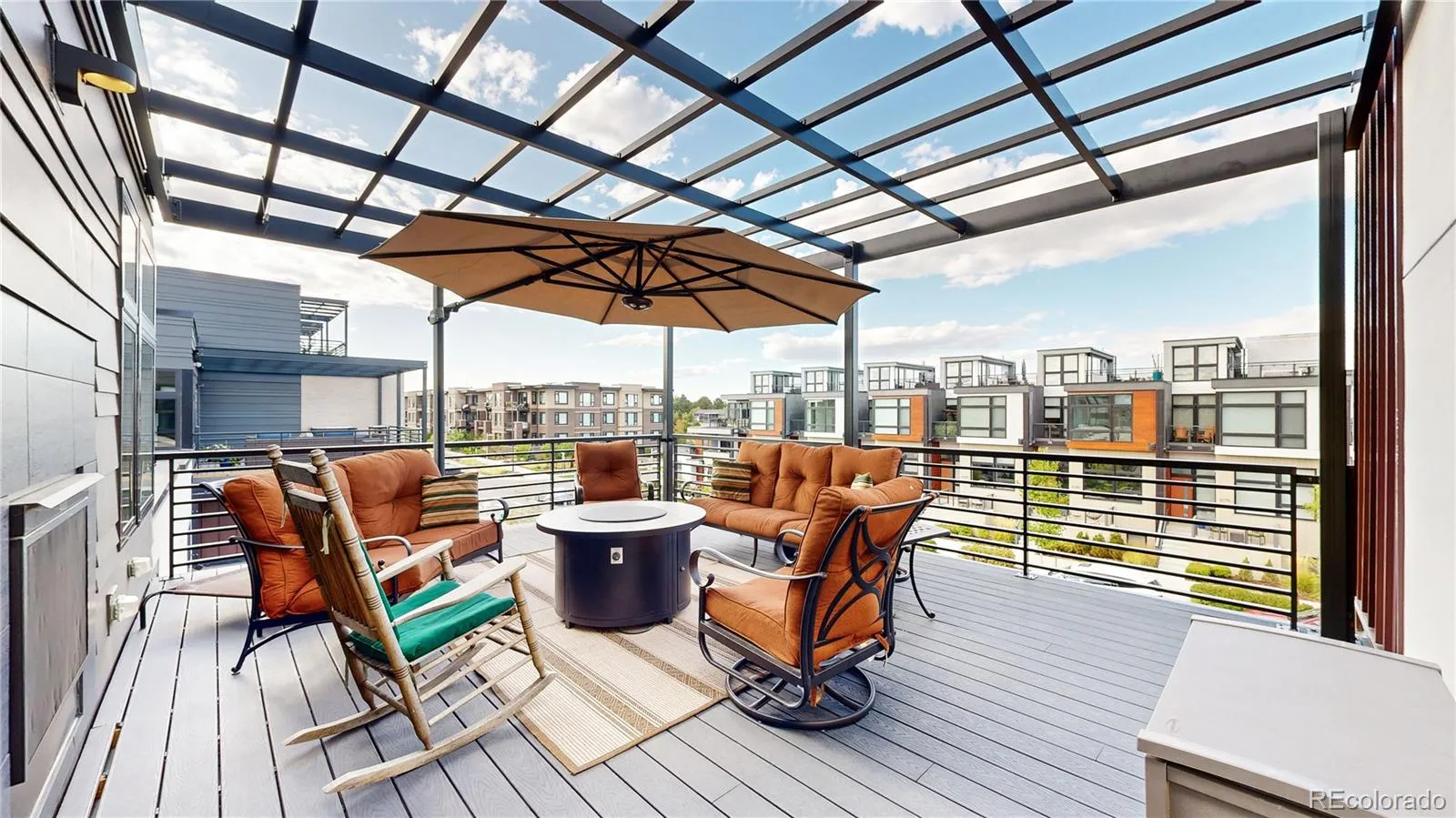 Upstairs you’ll find two additional bedrooms with two baths (1 en-suite), a flexible loft space plus balconies at both the front and back of the home. The top level offers a dramatic open loft with a two-sided indoor/outdoor fireplace and a 320 sq ft rooftop deck—west- and north-facing views, plumbed for natural gas and perfect for entertaining.
