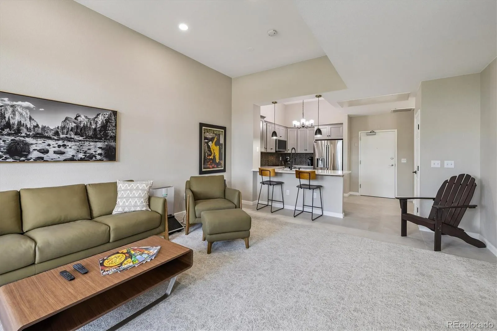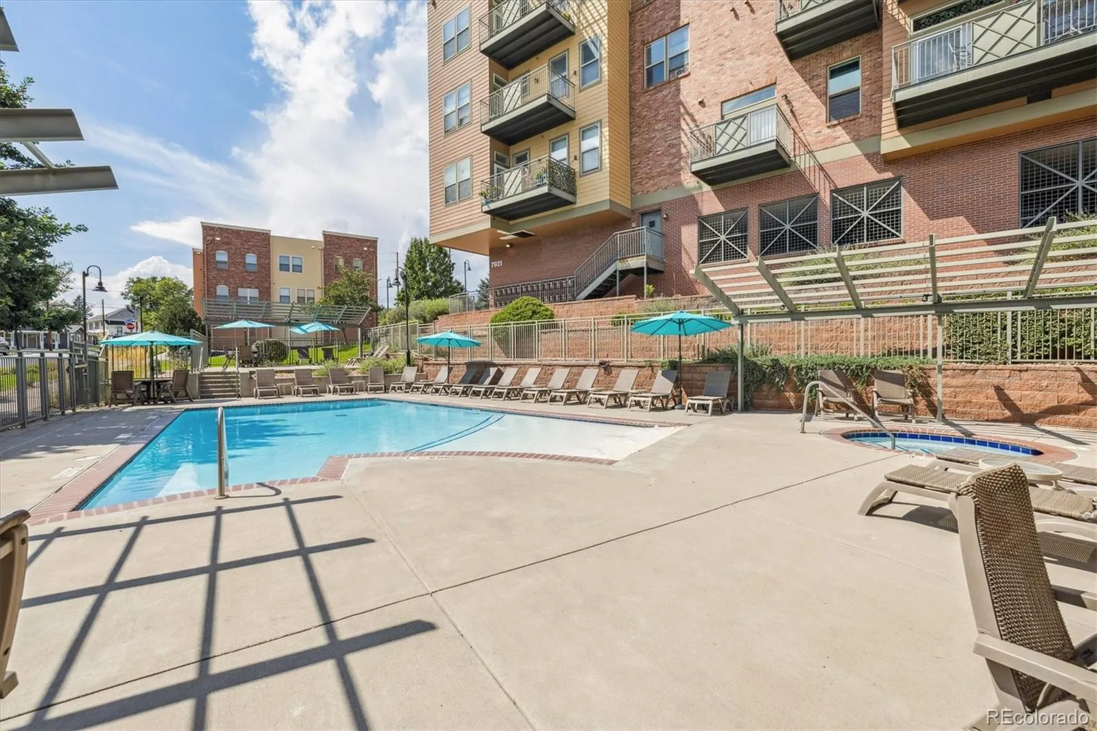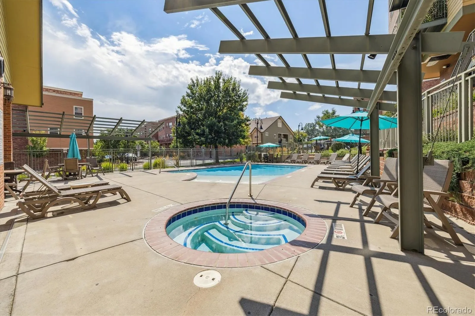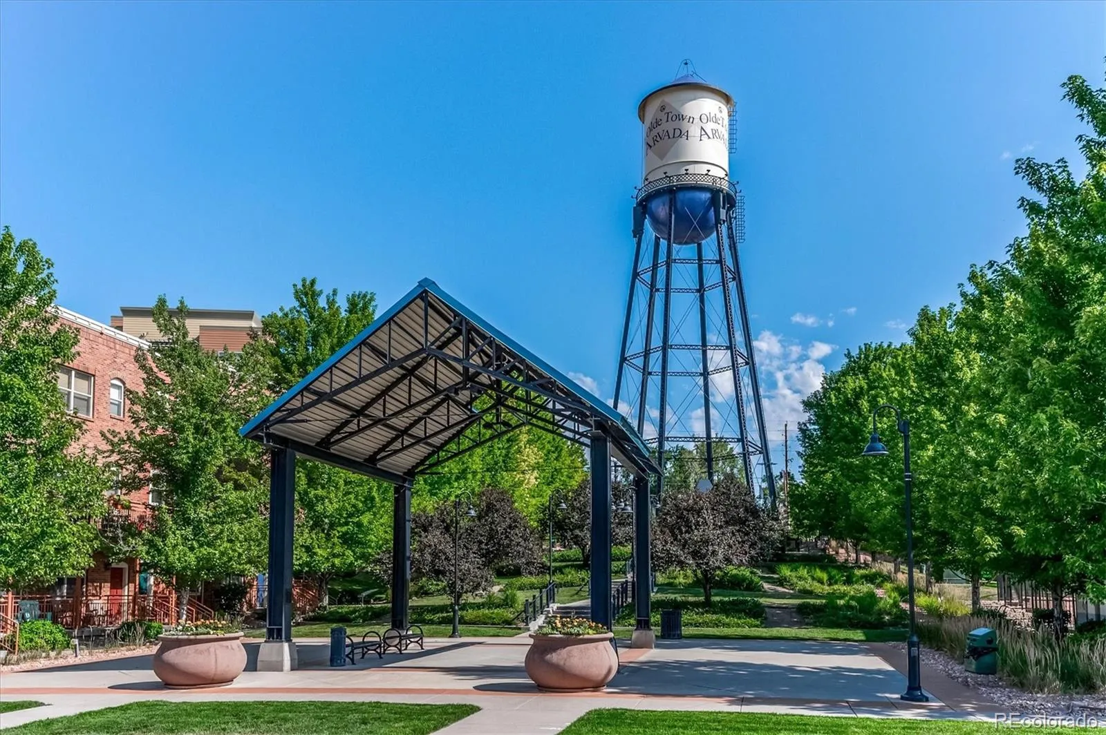 Perched atop Water Tower Village is an opportunity for a unique lifestyle that is the product of location, luxury, and convenient transportation. Located in the heart of Olde Town Arvada, unit 316 has been completely updated with the finest choices in flooring, counters, cabinetry, and more. The kitchen was rebuilt starting with the Thomasville soft close cabinetry. Two-tiered kitchen counters were replaced with a modern eat-in area with level 4 quartz countertops. New LG appliances have been installed including refrigerator with in-door ice and water service. Under foot, you will find large 30” porcelain tiles in the kitchen and extending into the bathroom. Proceed into the calming atmosphere of the fully updated bathroom equipped with a dual basin vanity, porcelain floor to ceiling shower walls, and the hand lain charcoal river rock shower floor. While passing through the laundry and closet area to the bedroom you’ll notice the warm tone of the freshly painted walls throughout the home. Bare feet will hug the high grade Karistan carpet with upgraded padding in both the bedroom and living room. High ceilings in the living room and ample light from the balcony windows and glass door make this entire space feel spacious and bright. Step out to the balcony for mountain views and your beverage of choice to wind down in the evening. Quality dining options abound in Olde Town, just steps away. Additional dining options can be accessed in downtown Denver using the light rail station just a few minutes walk to the east. Denver International Airport is also within reach by light rail for your next trip. When the champagne powder of the Colorado Rocky Mountains calls, you may answer by taking the elevator down to the secure garage, loading your ski equipment from your private locker, and heading west for a modest drive to all your favorite resorts. This one-of-a-kind home pairs everyday comfort with unmatched lifestyle opportunities.