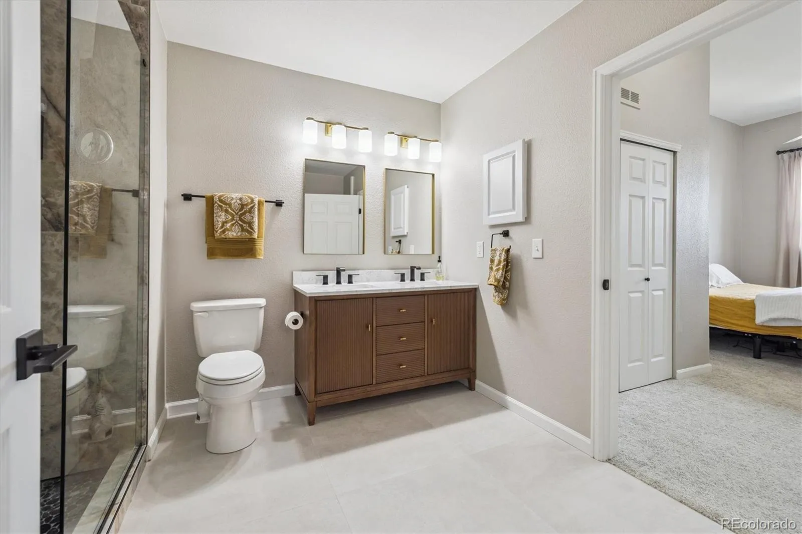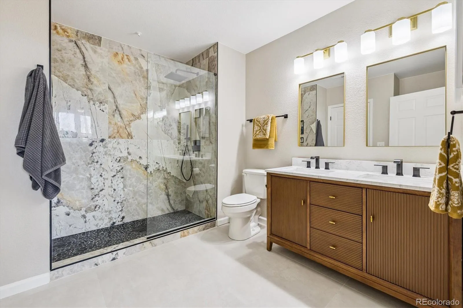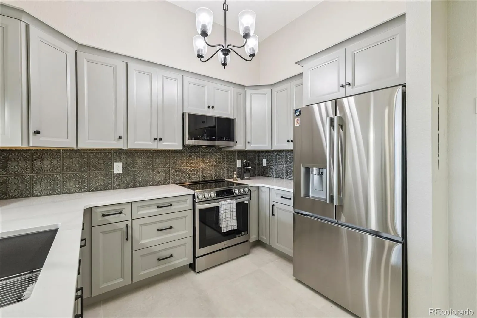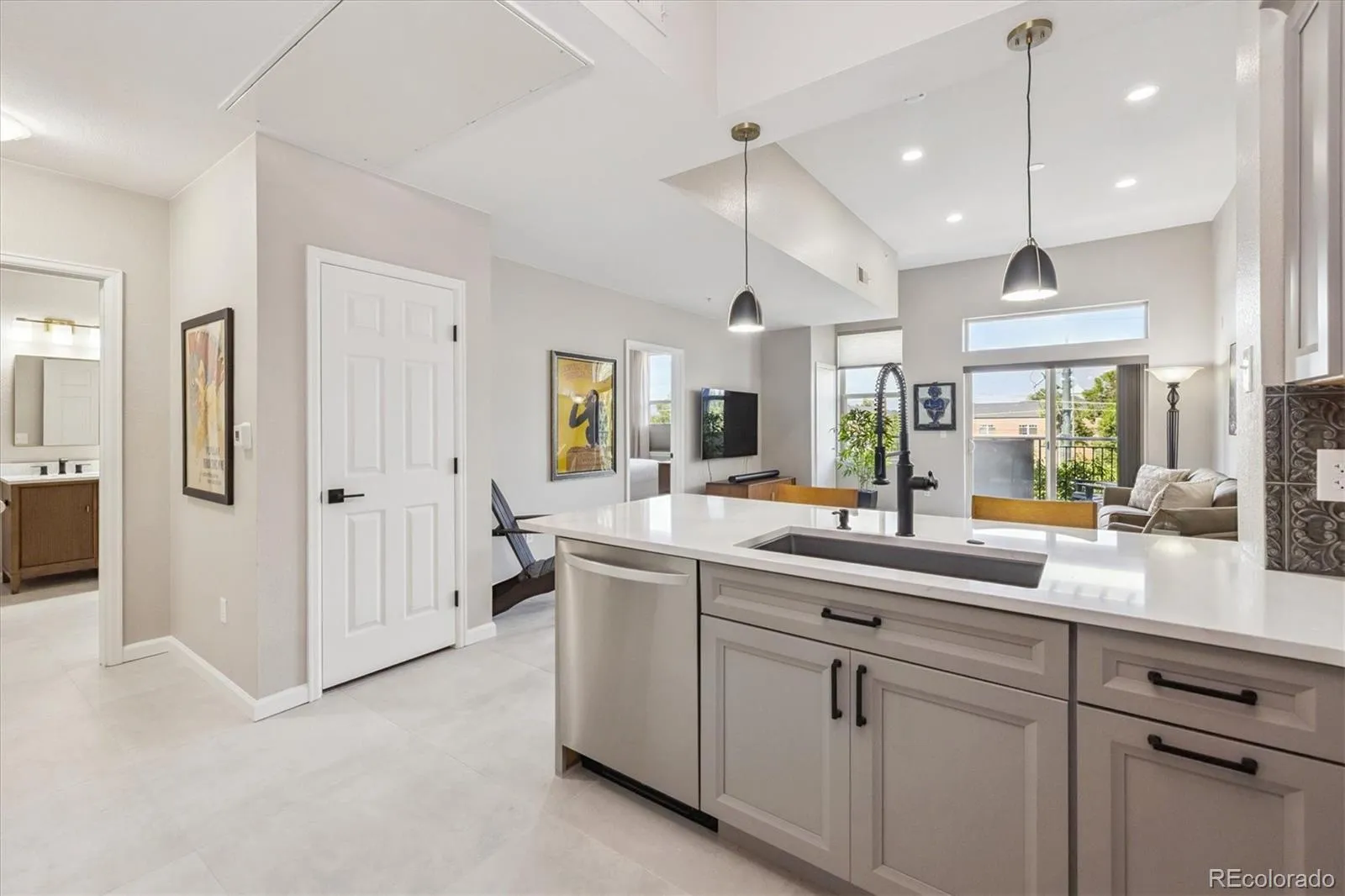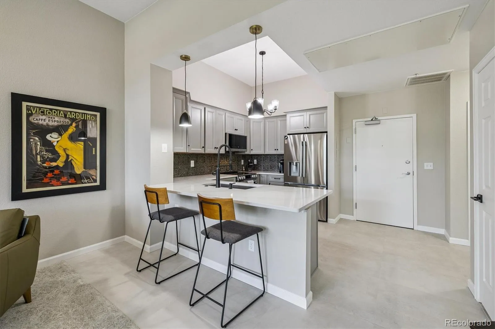 Perched atop Water Tower Village is an opportunity for a unique lifestyle that is the product of location, luxury, and convenient transportation. Located in the heart of Olde Town Arvada, unit 316 has been completely updated with the finest choices in flooring, counters, cabinetry, and more. The kitchen was rebuilt starting with the Thomasville soft close cabinetry. Two-tiered kitchen counters were replaced with a modern eat-in area with level 4 quartz countertops. New LG appliances have been installed including refrigerator with in-door ice and water service. Under foot, you will find large 30” porcelain tiles in the kitchen and extending into the bathroom. Proceed into the calming atmosphere of the fully updated bathroom equipped with a dual basin vanity, porcelain floor to ceiling shower walls, and the hand lain charcoal river rock shower floor. While passing through the laundry and closet area to the bedroom you’ll notice the warm tone of the freshly painted walls throughout the home. Bare feet will hug the high grade Karistan carpet with upgraded padding in both the bedroom and living room. High ceilings in the living room and ample light from the balcony windows and glass door make this entire space feel spacious and bright. Step out to the balcony for mountain views and your beverage of choice to wind down in the evening. Quality dining options abound in Olde Town, just steps away. Additional dining options can be accessed in downtown Denver using the light rail station just a few minutes walk to the east. Denver International Airport is also within reach by light rail for your next trip. When the champagne powder of the Colorado Rocky Mountains calls, you may answer by taking the elevator down to the secure garage, loading your ski equipment from your private locker, and heading west for a modest drive to all your favorite resorts. This one-of-a-kind home pairs everyday comfort with unmatched lifestyle opportunities.