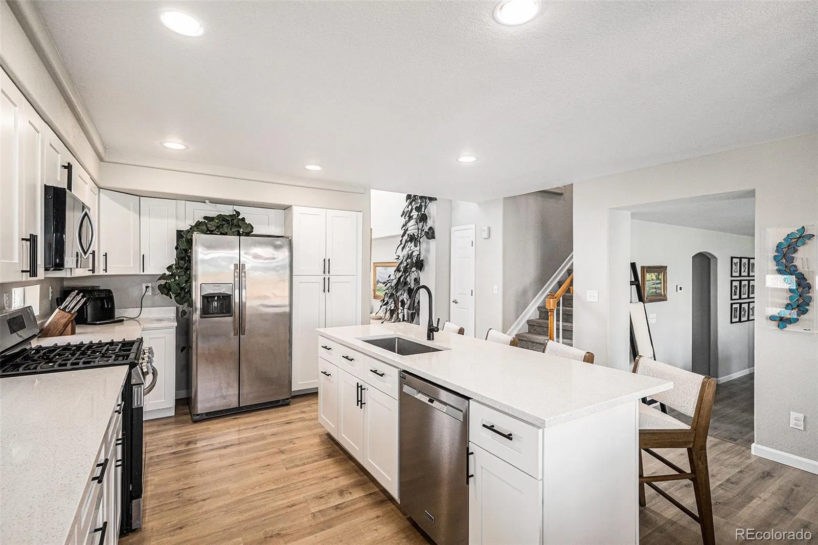 It’s appointed with a gorgeous (and huge!) chef-inspired kitchen, sleek cabinetry, a gas cooktop and oversized windows that flood the home with natural light. The bright, airy floor plan continues with light-colored flooring, designer tile work in all three bathrooms, and new blinds throughout. A new HVAC system (2021) and fresh exterior paint (2022) ensure efficiency and peace of mind for years to come. And we couldn’t forget to mention the incredibly desirable south-facing driveway for those snowy Colorado winters!
