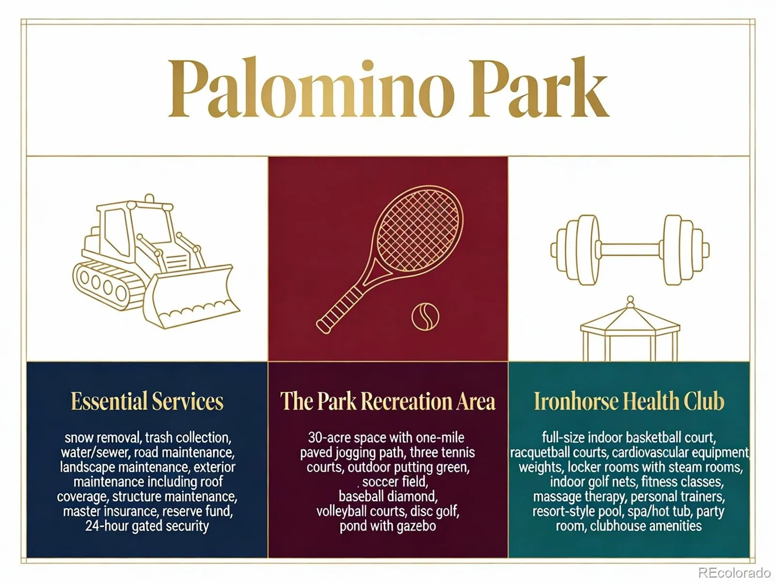 At Palomino Park, you’ll enjoy unmatched resort-style amenities: a clubhouse and pool with cabanas and spa, tennis and racquetball courts, sports fields, an indoor golf driving range, a full fitness center with personal training, multiple jacuzzis, walking trails, dog park, massage therapy rooms, and more.