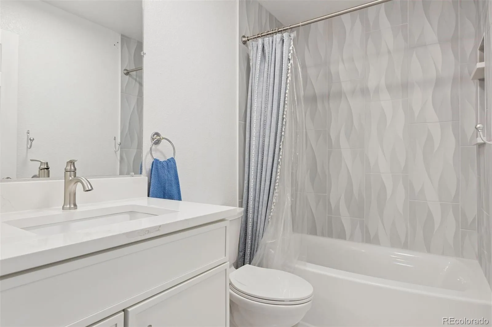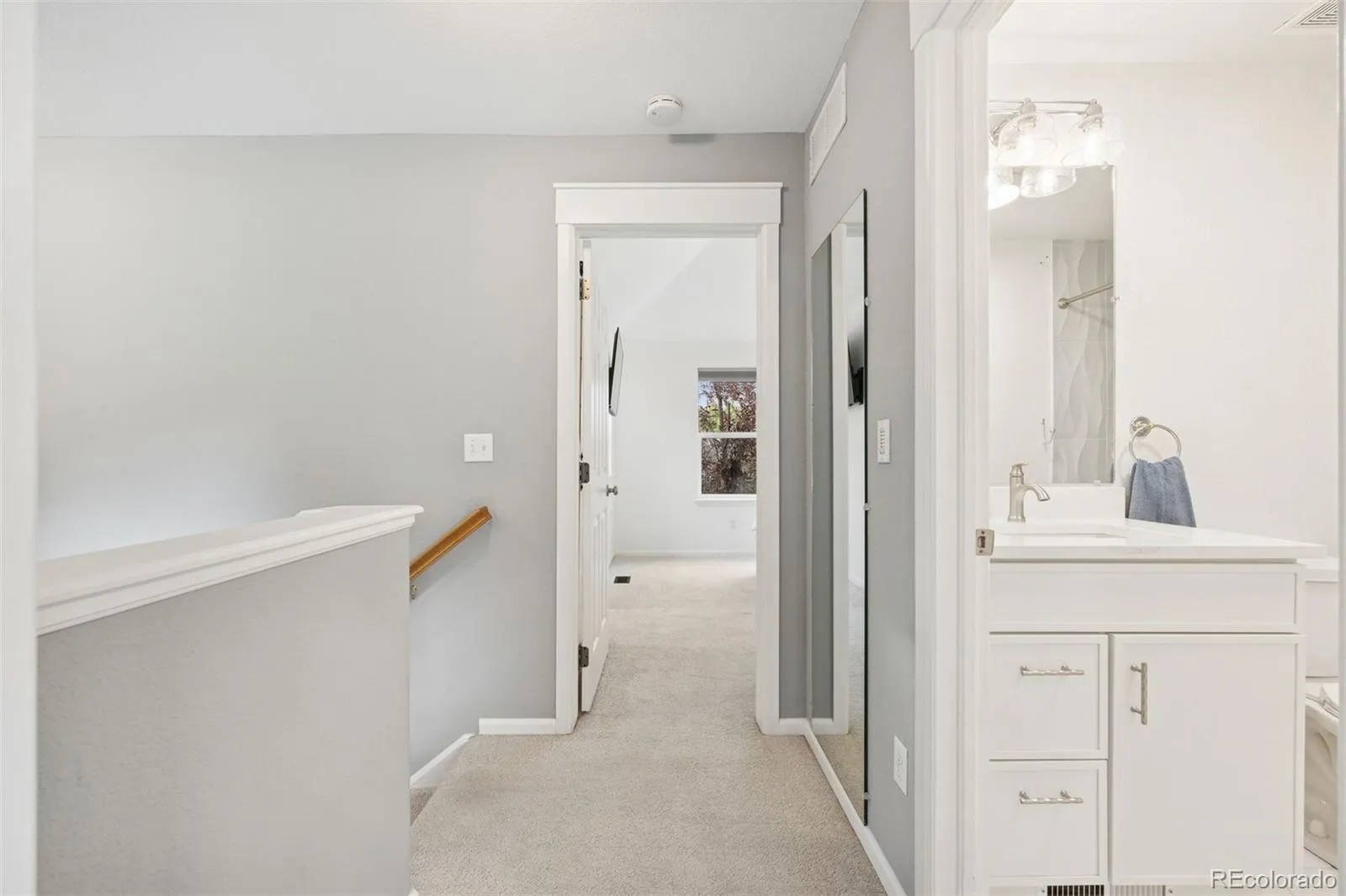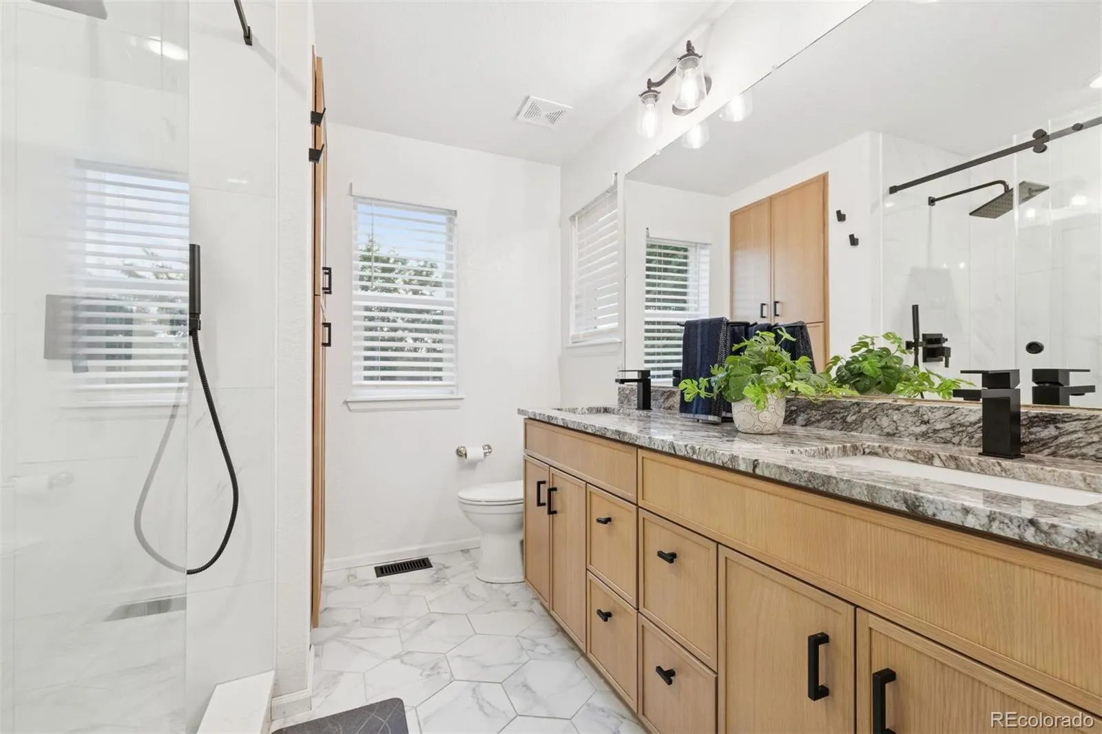 Hardwood floors grace the main level, while the upper level showcases a serene primary suite. A vaulted ceiling with a wood beam detail and a new designer fan add architectural character, complemented by the updated en-suite bath with dual sinks, striking hexagon floor tile, and a walk-in shower lined with coordinating smaller-format hex tiles. The secondary bathroom has been stylishly refreshed with a new tub/shower combo, tile, sink, and toilet. A third bath on the main level enhances convenience for guests.