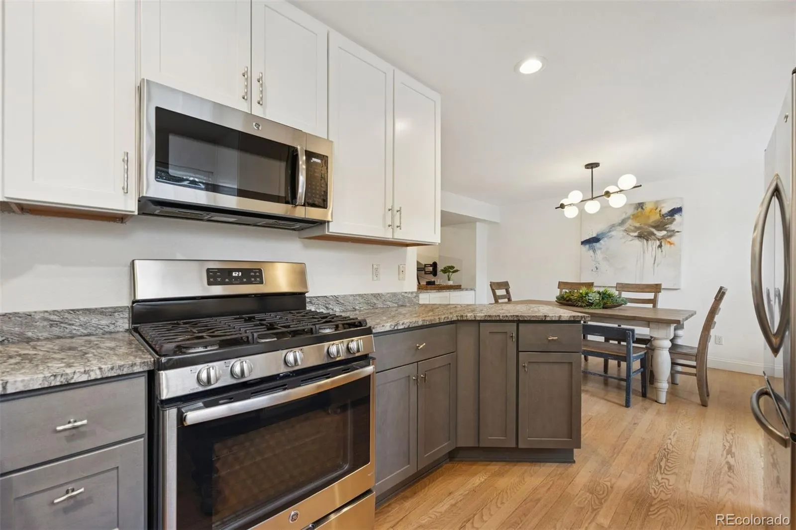 The remodeled kitchen is a true highlight, featuring brand-new upper and lower cabinetry, leathered granite countertops, and a stainless steel single-basin sink perfectly positioned beneath a window that frames the pergola and park across the street. Seamless indoor-outdoor flow extends to a spacious deck off the dining area, ideal for entertaining or quiet evenings at home.