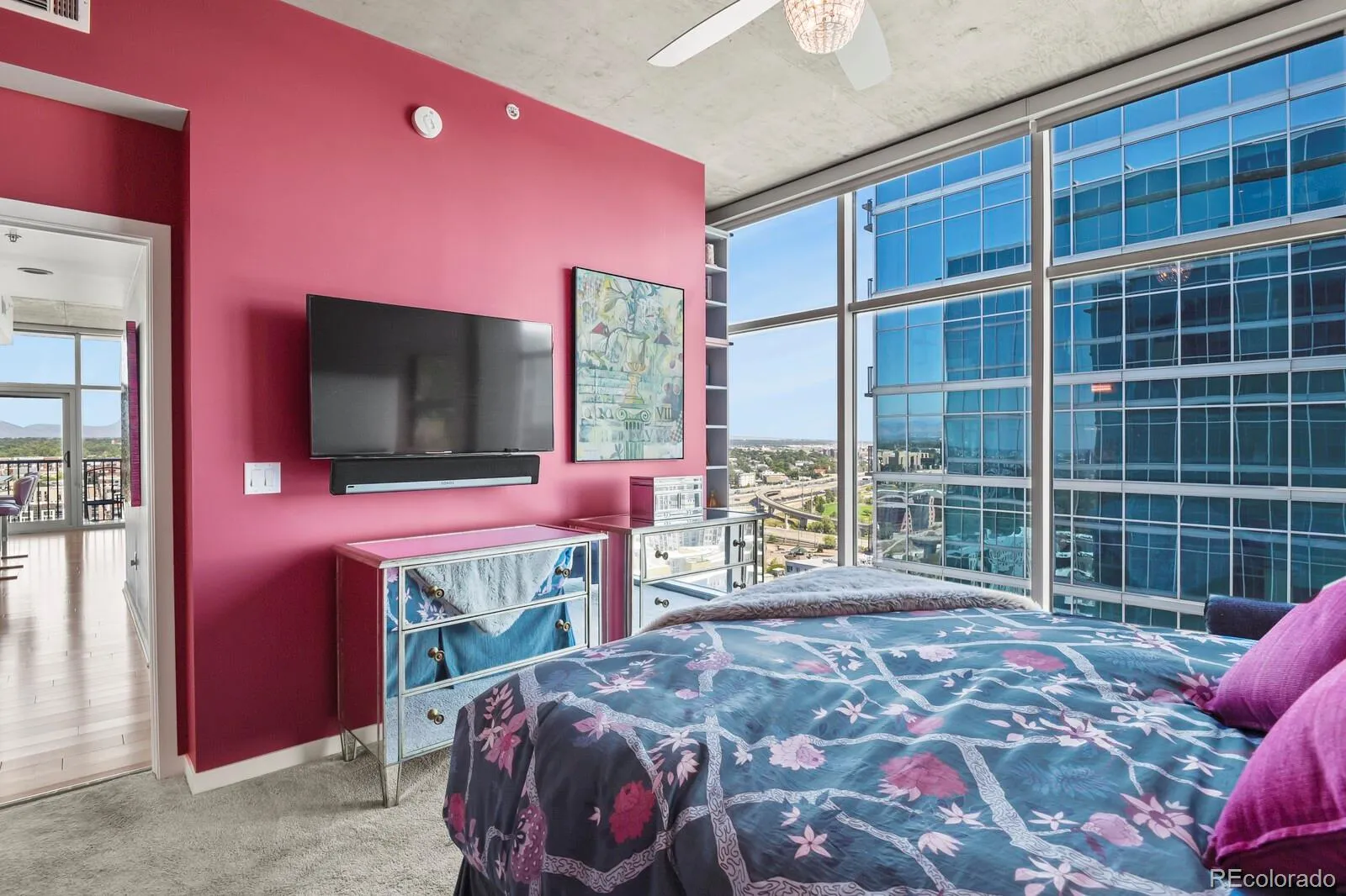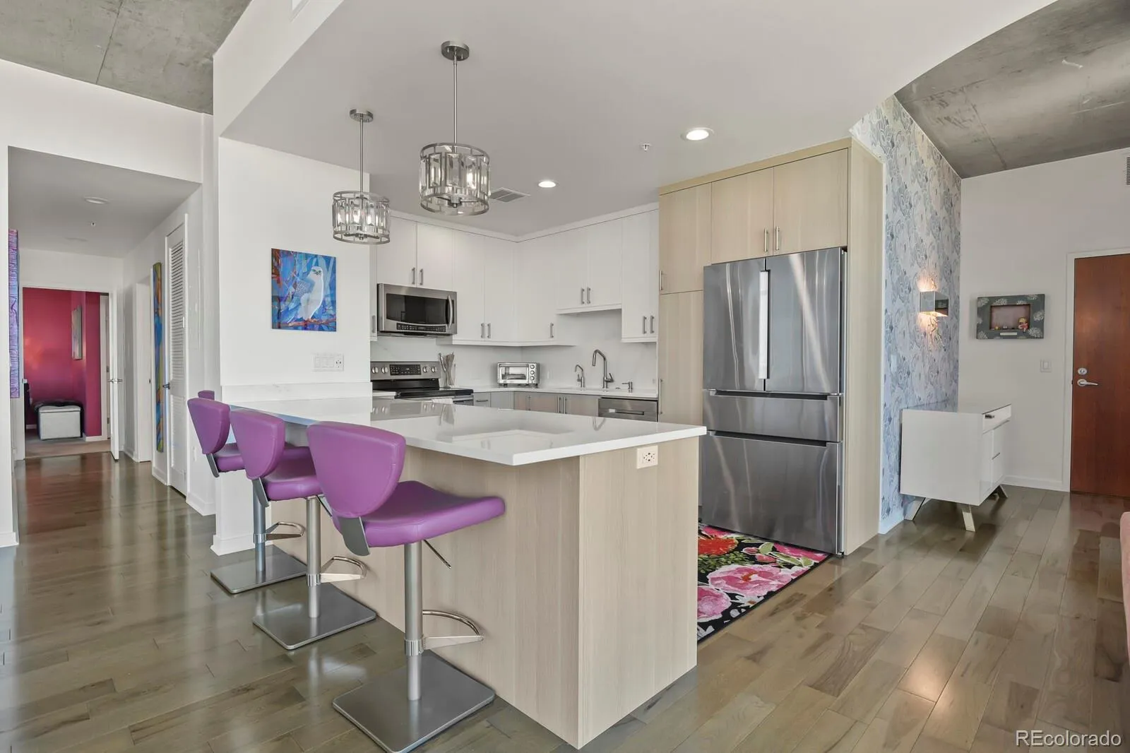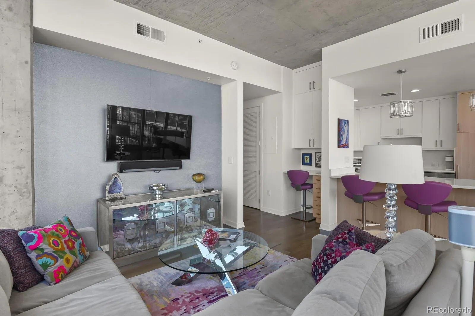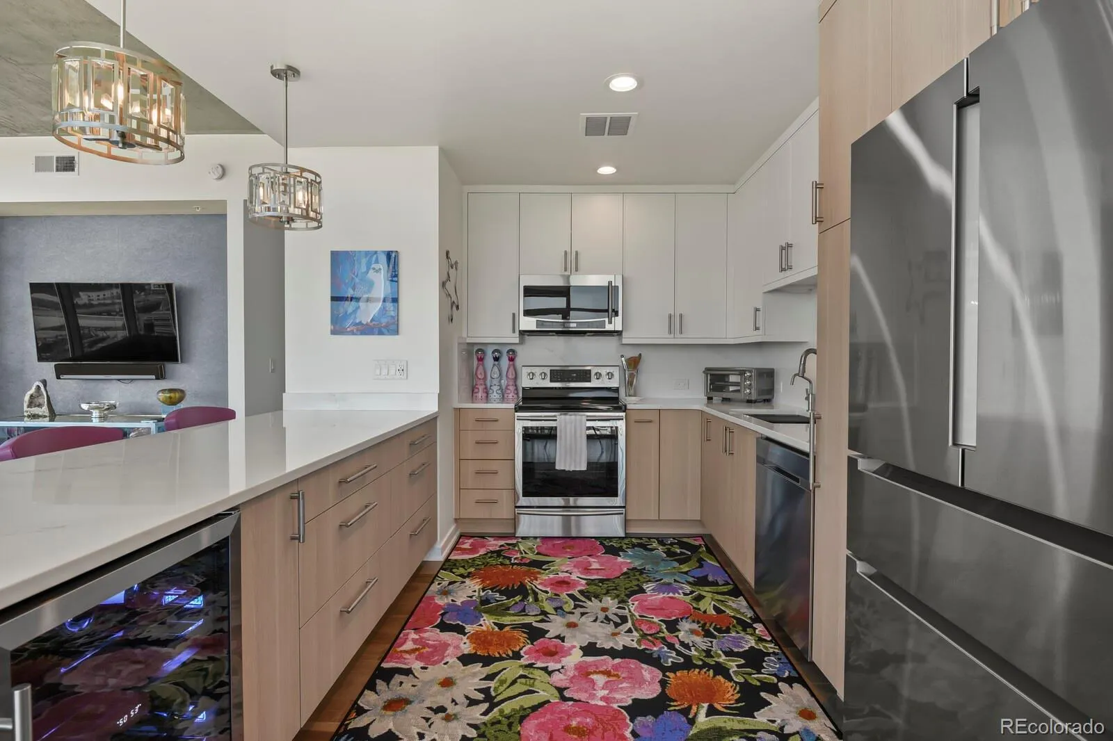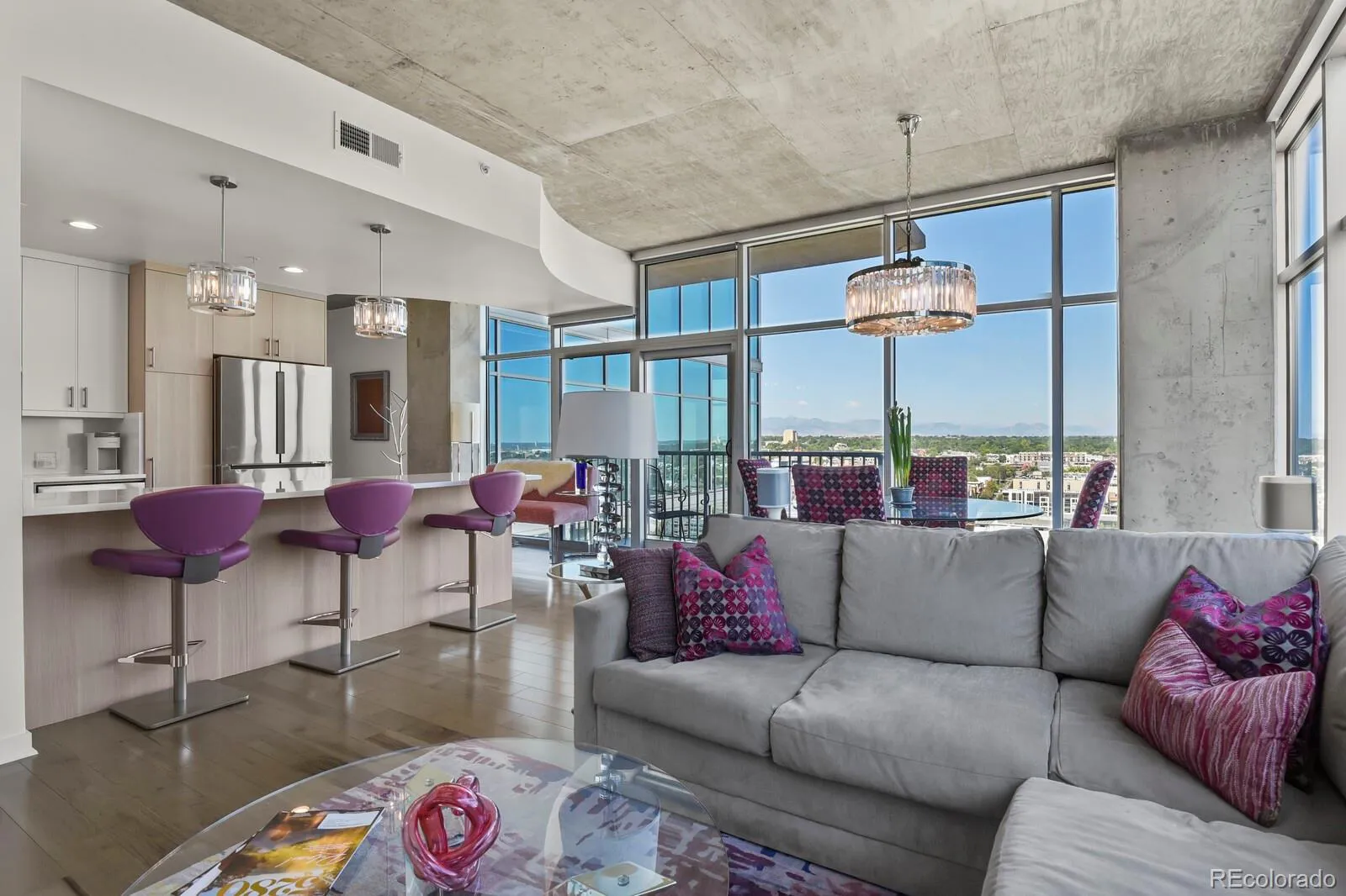 Wrapped in glass high on the 20th floor, this recently renovated corner gem at the Glass House showcases panoramic mountain and city views that provide the perfect backdrop for both everyday living and entertaining. This two-bedroom, two-bath home delivers modern luxury with timeless design. The updated kitchen features quartz countertops, custom under-lit cabinetry, and a wine fridge — blending sleek design with everyday function.