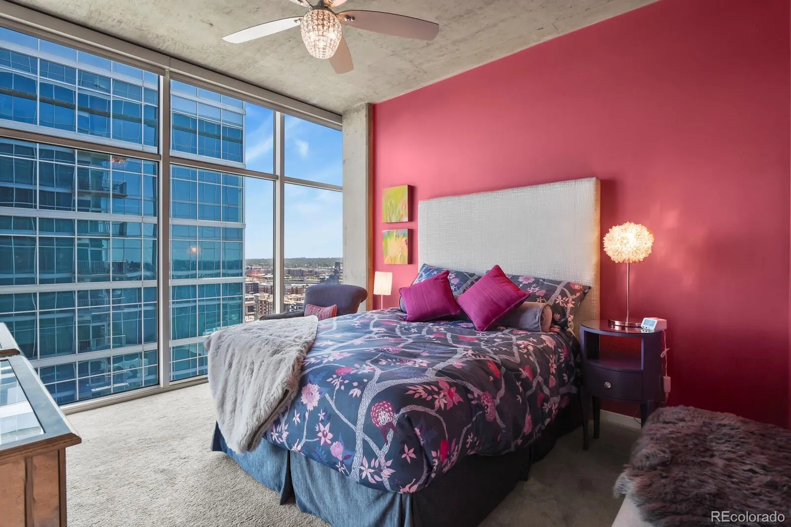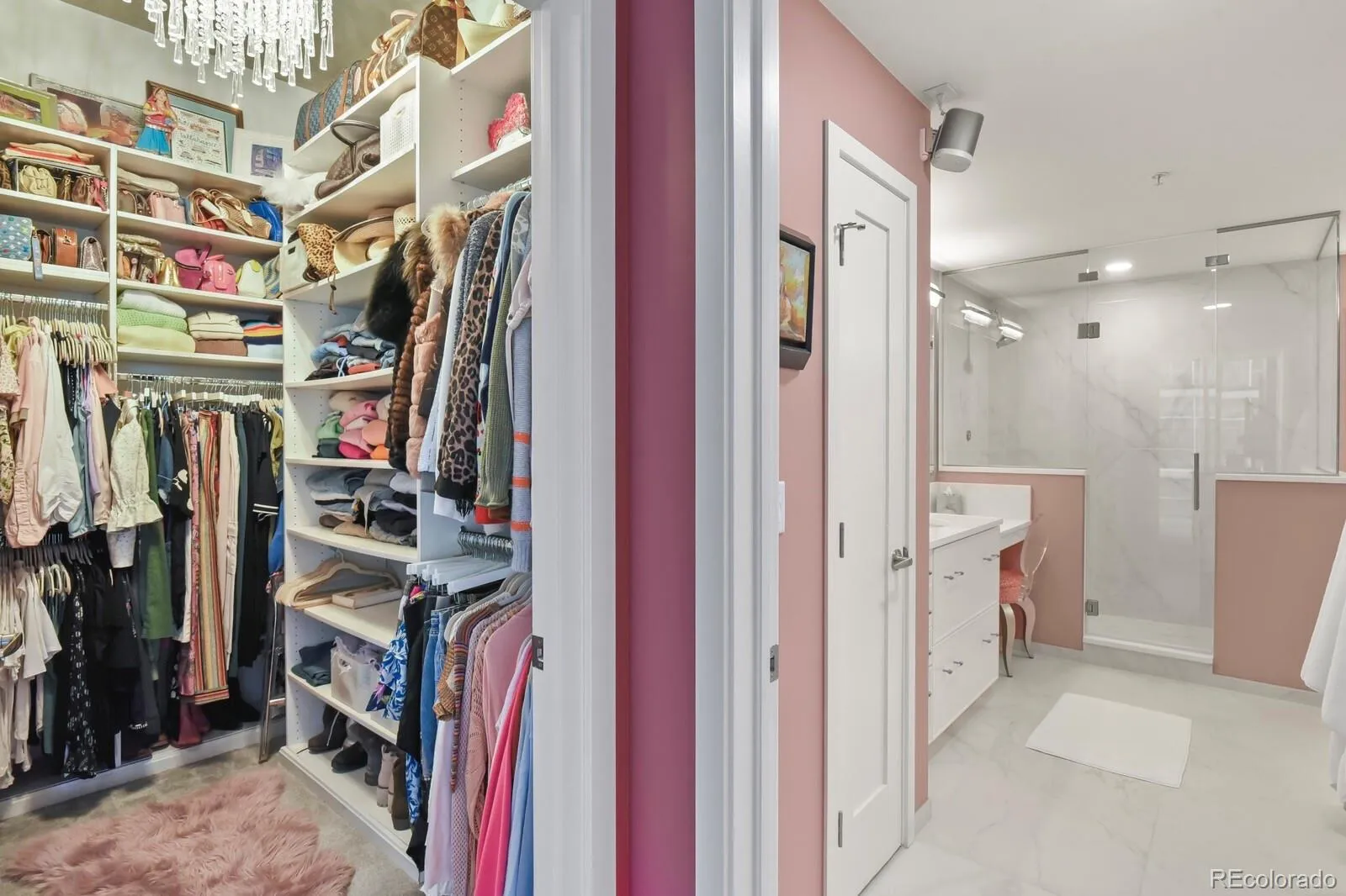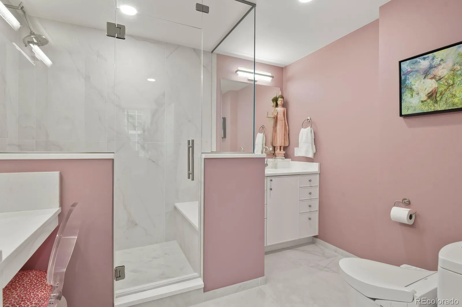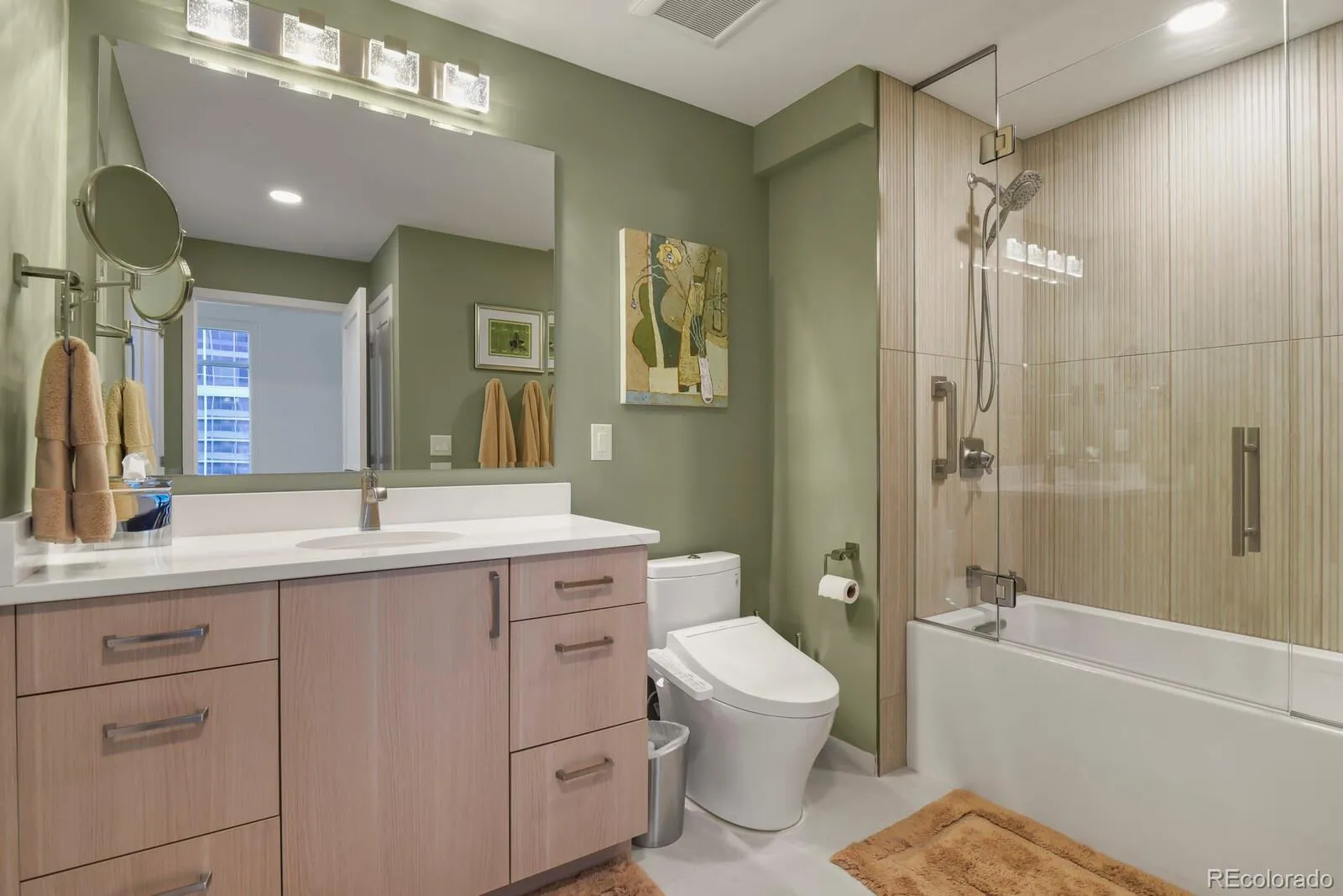 In the primary suite, automated shades frame the city views from the comfort of bed. The spa-like bathroom pampers with heated floors, a shower with jetted and steam functions, a heated bidet, and dual sinks with quartz counters. A walk-in closet, crowned by its own chandelier, adds a distinctive touch of luxury.
