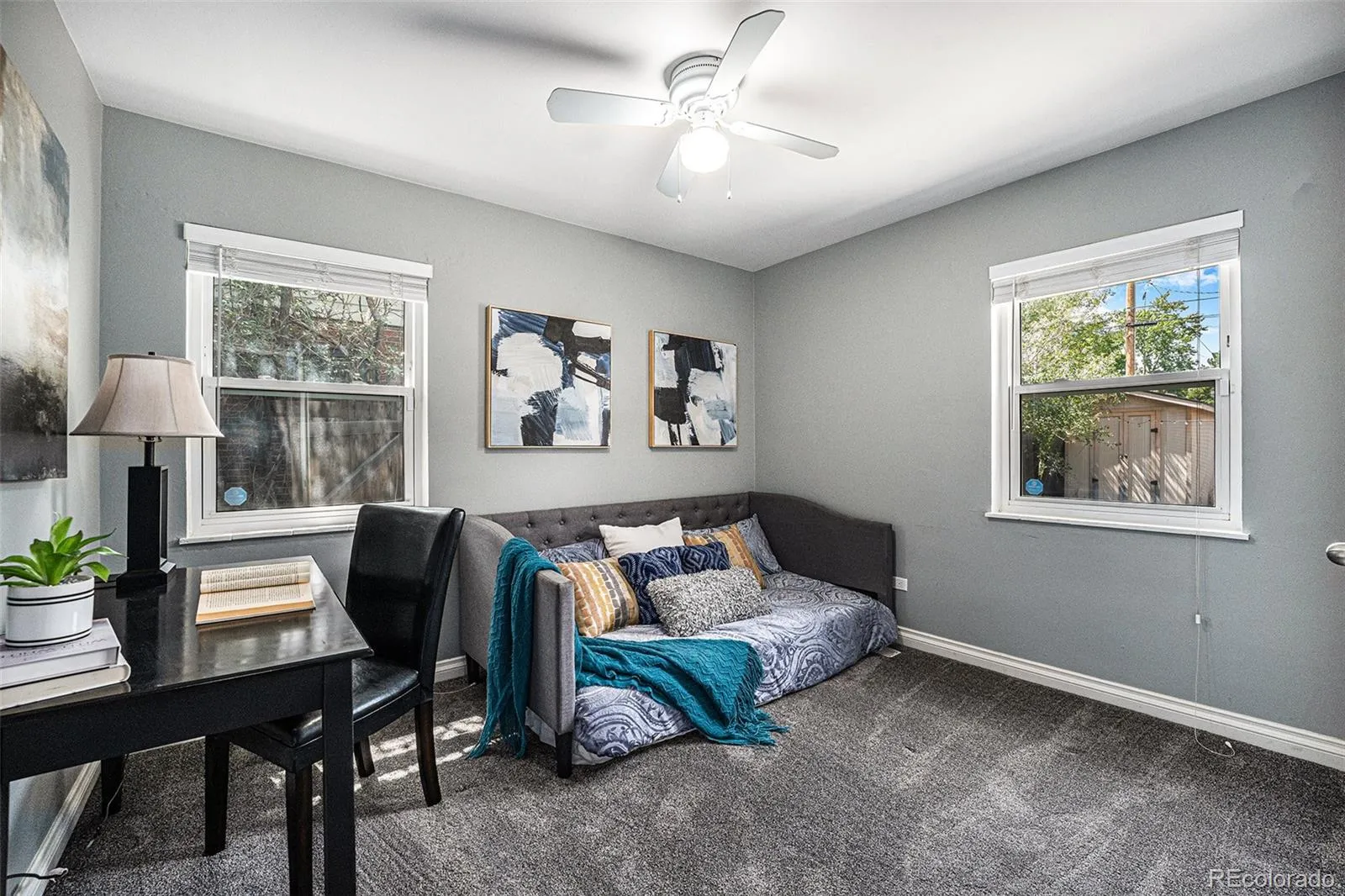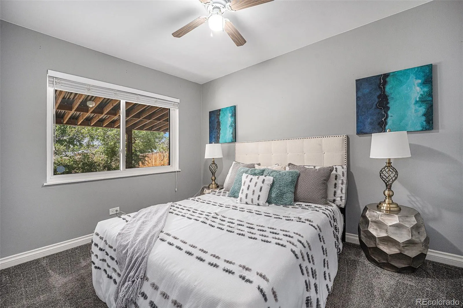 Welcome to this charming brick home in Denver’s desirable Park Hill neighborhood, offering a blend of comfort, functionality, and thoughtful updates. The main floor features newer carpet and solid wood doors, creating a warm and inviting feel. The spacious living room is enhanced by recessed lighting, while the kitchen boasts granite counters, tile backsplash, tile flooring, and stainless steel appliances including a gas range. Enjoy meals in the bright eat-in kitchen area. Two main-floor bedrooms each offer lighted ceiling fans and walk-in closets, with a full bath featuring an upgraded pedestal sink and a beautifully tiled shower/tub. The finished basement expands your living space with newer carpet throughout, a versatile living area, two nonconforming bedrooms (one with an en suite full bath), an additional full bath, and a laundry area complete with washer, dryer, utility sink, and shelving. Outside, you’ll find a covered front porch, a covered concrete back patio, a fully fenced yard with rear sprinklers, and a storage shed. Parking is plentiful with a one-car attached garage with workbench, two additional rear parking spots, and alley access. This home is equipped with a radon mitigation system, security system, and room A/C units. Conveniently located near shops, restaurants, parks, and public transit, this home offers a fantastic opportunity to enjoy the best of Denver living.