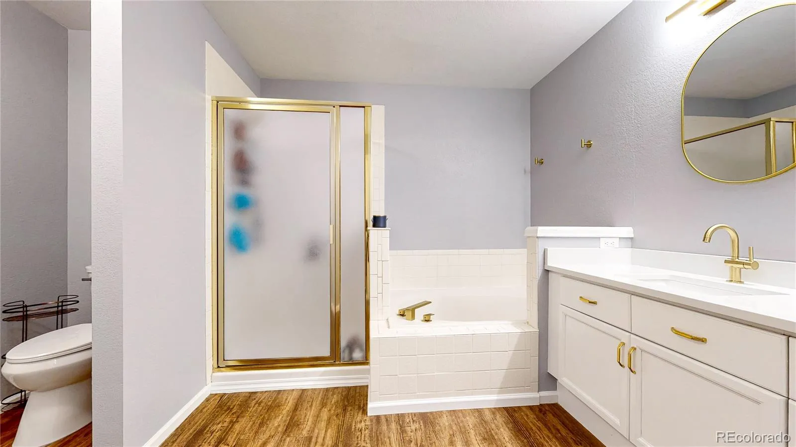 Welcome to this gorgeous light-filled 2-story townhouse ideally positioned in the heart of the vibrant and well kept community, opening to a serene courtyard with river rock landscaping. Just minutes from Cherry Creek Reservoir, Meadow Hills Golf Course, shopping, and dining, this home combines convenience with comfort. The main level boasts brand-new hardwood floors, soaring ceilings with a skylight, and a spacious living room flowing into the open dining area and kitchen featuring ample high quality cabinetry and a stylish design. Step outside from the dining room to a generous patio, perfect for BBQs, outdoor dining, or enjoying your morning cup of coffee. Upstairs, a versatile loft with built-ins makes a perfect media room or office. The primary suite features vaulted ceilings and a beautifully updated 5-piece ensuite, accompanied by a second large bedroom and another updated full bathroom. A 700 sq. ft. unfinished basement offers room for expansion with an extra bedroom and bathroom, and the attached 2-car garage includes bonus storage. Recent updates include the new water heater in 2023, new furnace and AC in 2019/2020, new exterior paint in Nov. 2023, new interior paint in 2025, new carpet in 2025, and more!