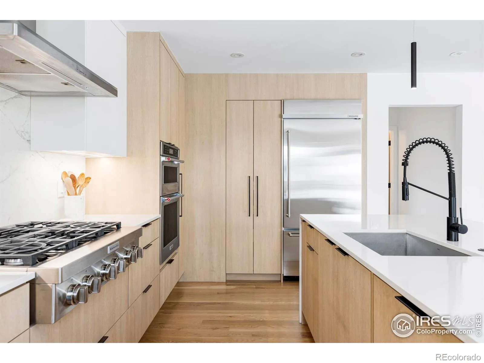Sophisticated modern design meets effortless luxury living in this stunning home in desirable Melody Heights. This residence showcases premium finishes and an exceptional indoor-outdoor flow that epitomizes Boulder living. Light-filled interiors welcome you into the main level, where wide-plank hardwood floors flow seamlessly through an open-concept great room. The living and dining areas are perfectly positioned to capture natural light through walls of large windows, while a sleek fireplace adds ambiance and warmth. The chef’s kitchen is a masterpiece of modern design, featuring custom flat-panel cabinetry in a sophisticated blend of white and natural wood tones, marble-inspired backsplash, and a waterfall island with additional cabinetry. Dramatic sliding glass doors extend the living space onto a generous deck, creating an ideal setting for indoor-outdoor entertaining. The upper level is a private retreat, crowned by a stunning primary suite with sweeping views of Mt. Sanitas across Boulder’s Front Range and private deck access. The pristine five-piece ensuite bathroom features a walk-in shower with designer tile, freestanding soaking tub, floating wall-mounted dual sinks, and windows that capture magnificent Flatirons views. Two additional bedrooms and a well-appointed bathroom complete this floor. The daylight lower level offers exceptional versatility with a spacious recreation room, two additional bedrooms, and a full bathroom. Set on a beautifully landscaped lot with a manicured backyard and fruit trees, this home enjoys a prime location in the Melody Heights neighborhood. Residents are a short distance to Lucky’s Market, and just minutes from North Boulder’s dining scene and Ideal Broadway Shops. The surrounding area offers abundant outdoor recreation opportunities, from Melody Park right across the street, to the scenic trails of Wonderland Lake and Mt. Sanitas.