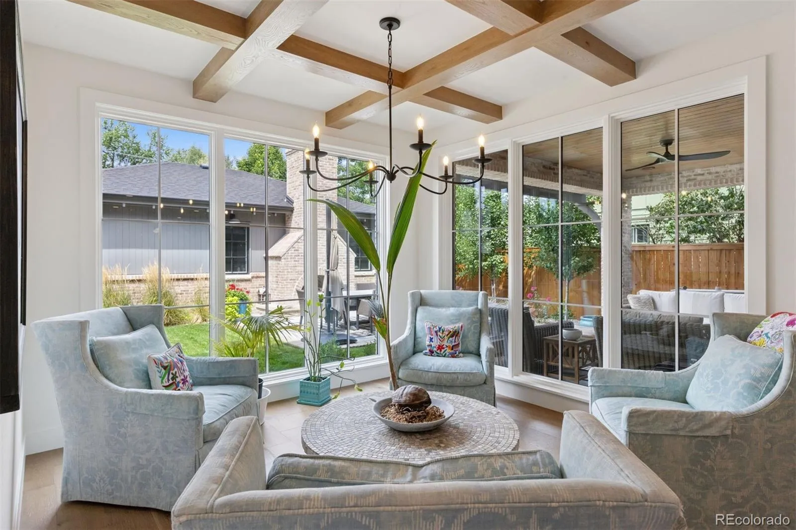A welcoming brick front porch and arched iron entry open to a sun-filled interior where details set the tone—herringbone inlay flooring, beamed ceilings, limestone accents, and warm oak cabinetry create a refined backdrop for daily living. At the heart of the home, a showcase kitchen features custom cabinetry, dual refrigeration, wine cooler, and an oversized waterfall island. A butler’s area connects seamlessly to a walk-in pantry, designed to keep appliances and storage tucked neatly out of sight. The adjoining breakfast nook and great room, framed by lattice beams and walls of windows, extend gracefully to the outdoors.