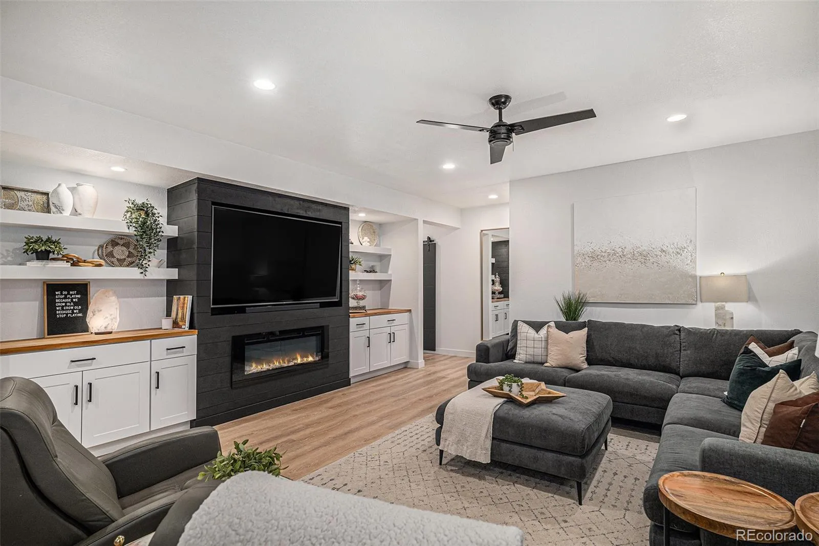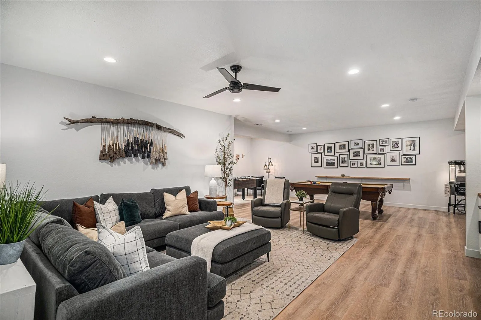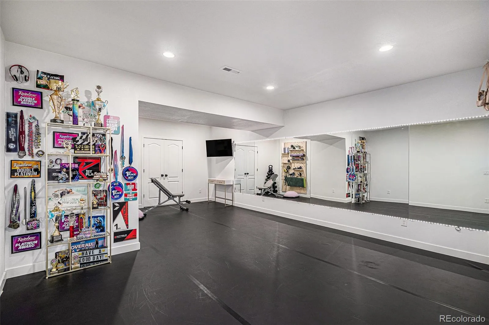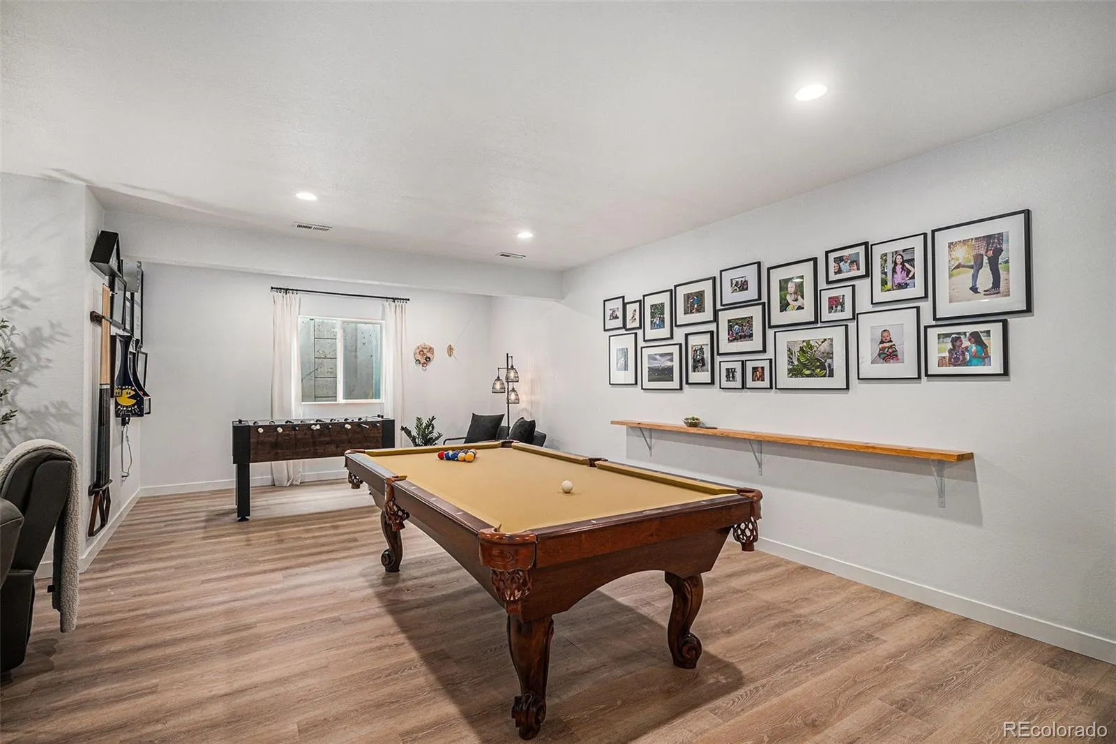 providing privacy for main level secondary ensuite bedroom with walk in closet. Office, bath, linen closet, mudroom & coat closet complete the first floor. Fully finished basement is spectacular – bedroom has huge walk-in closet & the full bath includes custom vanity. The playroom has a large walk-in closet & dance studio/gym with mirrored wall & Marley flooring make a perfect workout room. Second living area has a fireplace & built in cabinets open to bar & large game area & included pool table making this the perfect space to entertain. Pocket office with built-in desk & storage & 3 unfinished storage areas are a bonus. Secondary bedrooms, playroom, basement linen closet, coat closet & pocket office have custom Elfa closet systems from The Container Store. No shortage of storage in this home! Mountain views from front porch. Backyard is beautifully landscaped with tress for privacy &