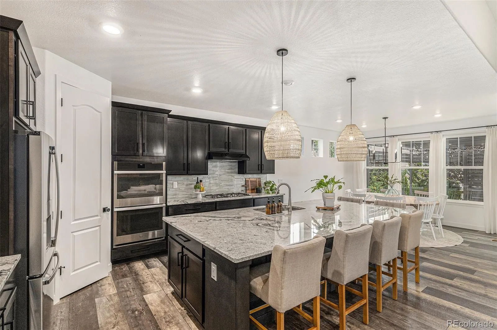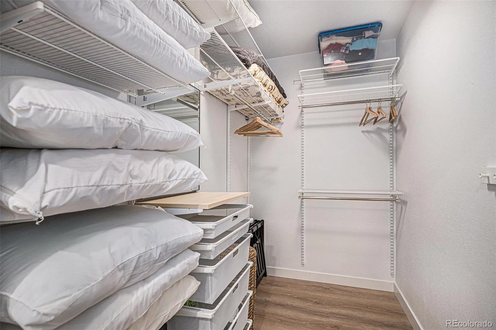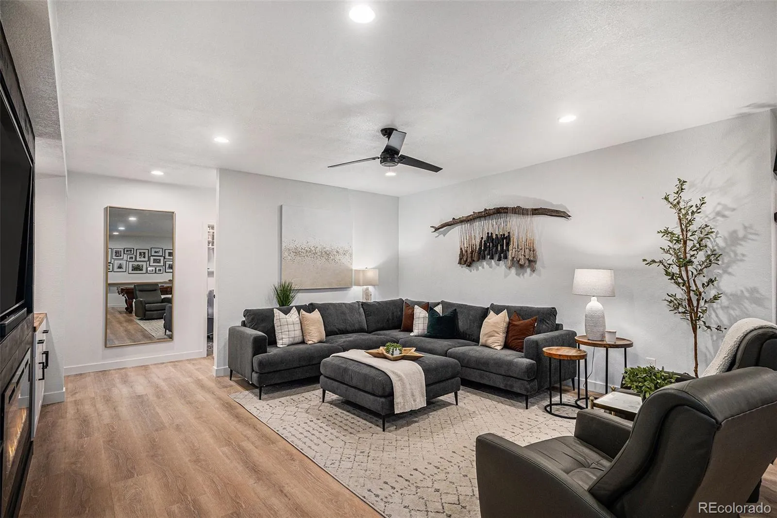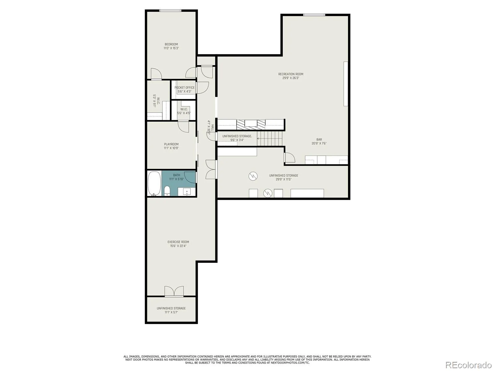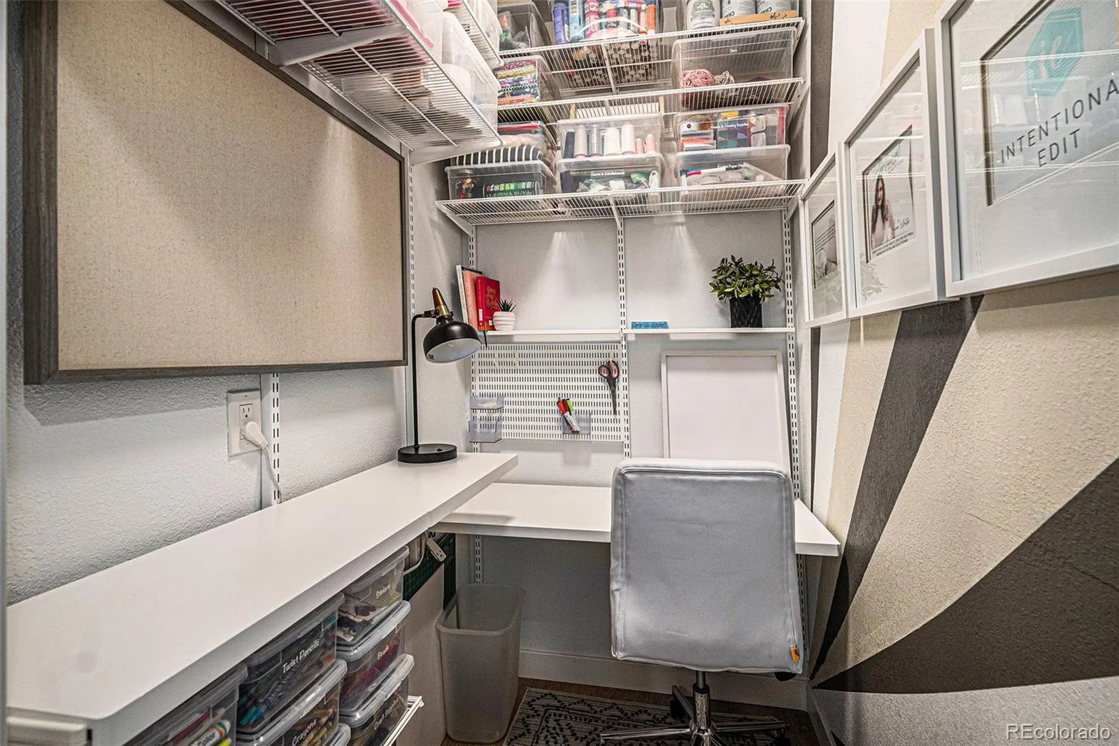 providing privacy for main level secondary ensuite bedroom with walk in closet. Office, bath, linen closet, mudroom & coat closet complete the first floor. Fully finished basement is spectacular – bedroom has huge walk-in closet & the full bath includes custom vanity. The playroom has a large walk-in closet & dance studio/gym with mirrored wall & Marley flooring make a perfect workout room. Second living area has a fireplace & built in cabinets open to bar & large game area & included pool table making this the perfect space to entertain. Pocket office with built-in desk & storage & 3 unfinished storage areas are a bonus. Secondary bedrooms, playroom, basement linen closet, coat closet & pocket office have custom Elfa closet systems from The Container Store. No shortage of storage in this home! Mountain views from front porch. Backyard is beautifully landscaped with tress for privacy &