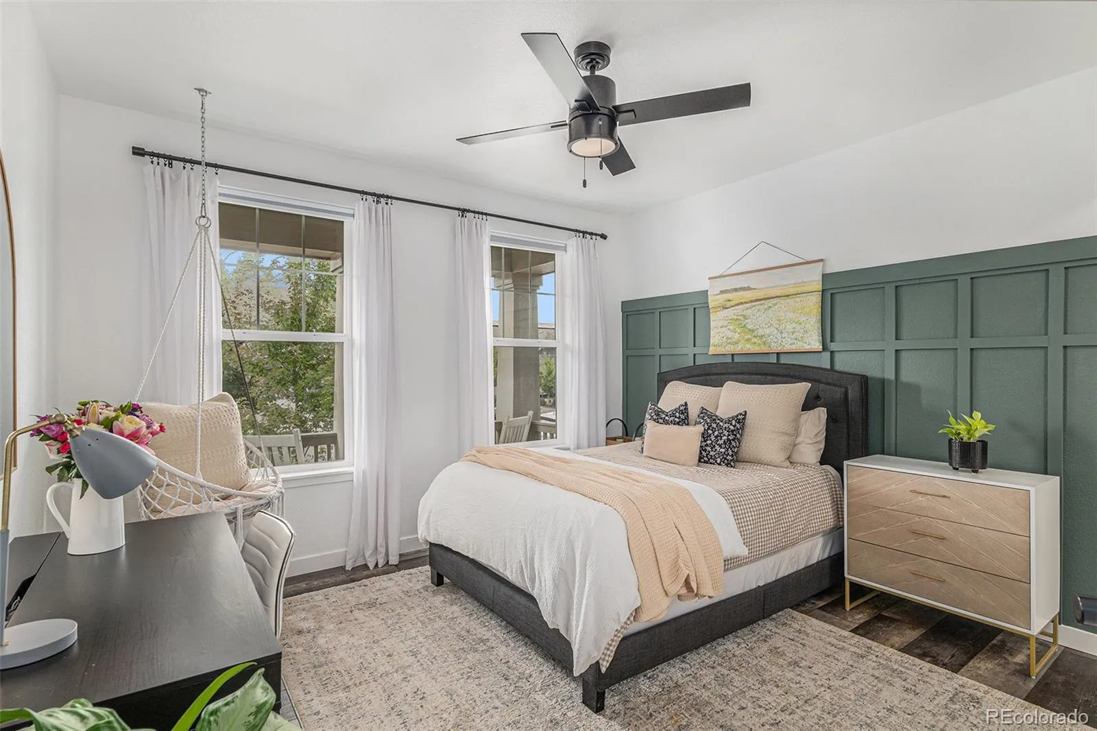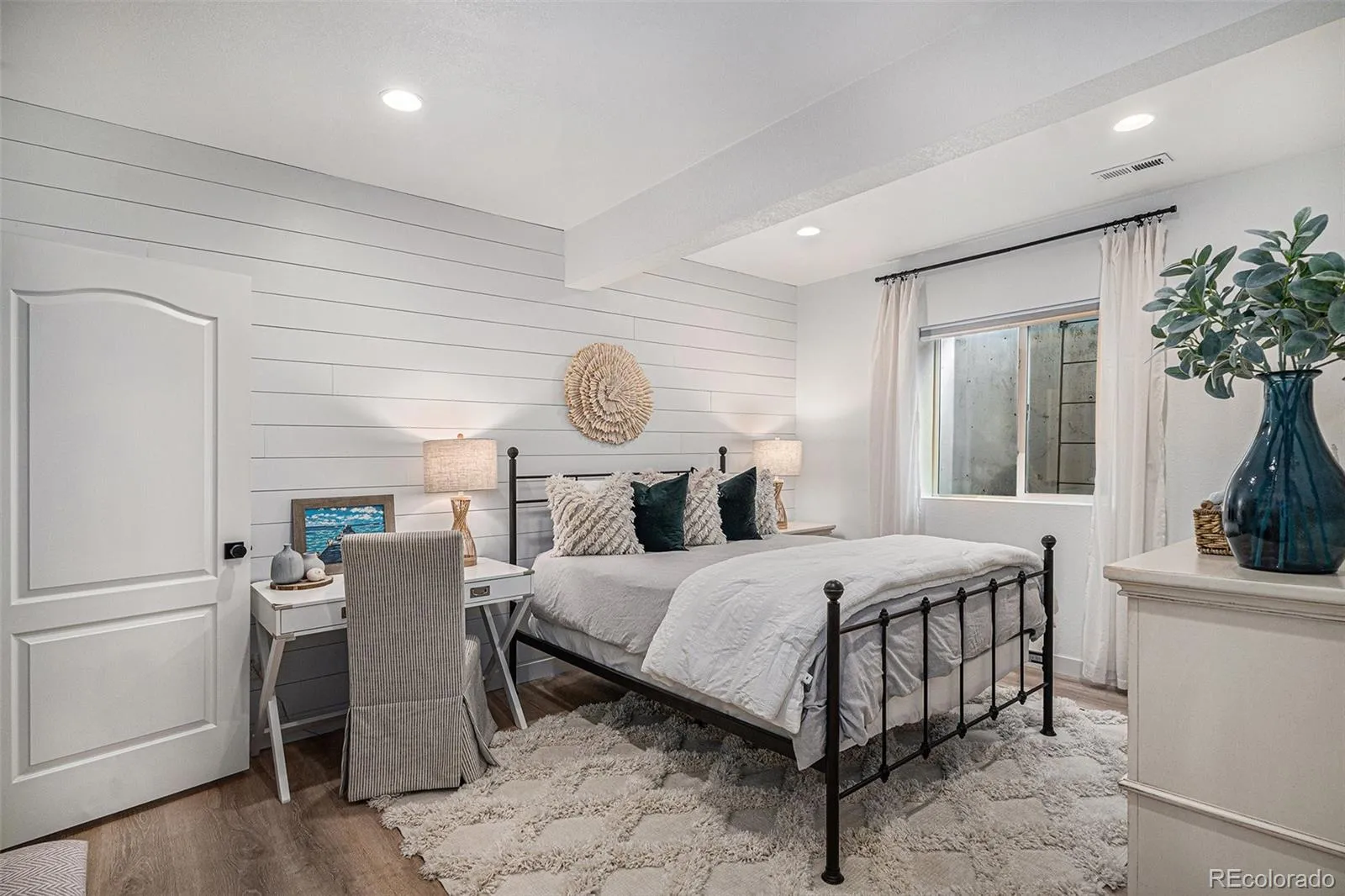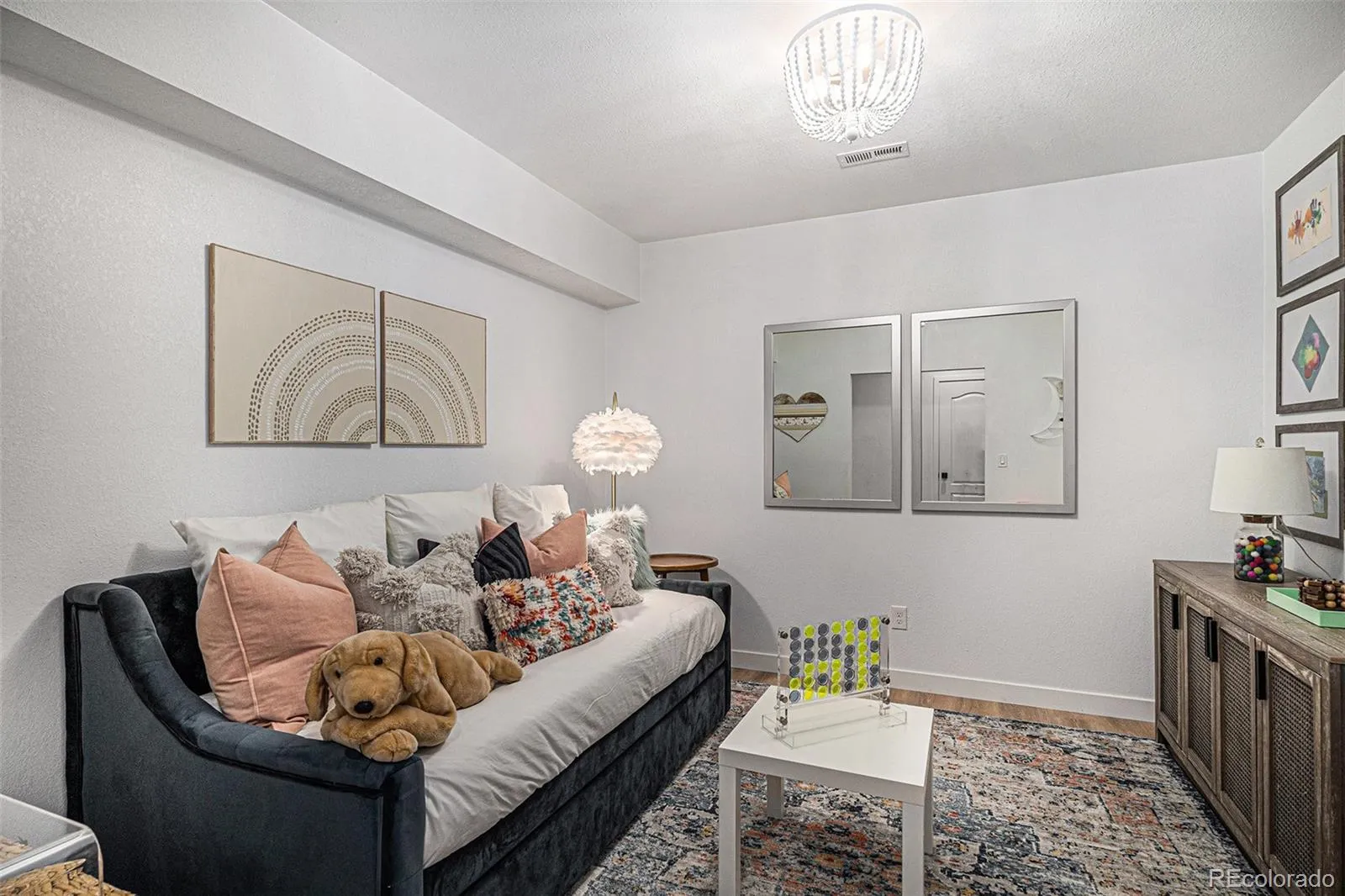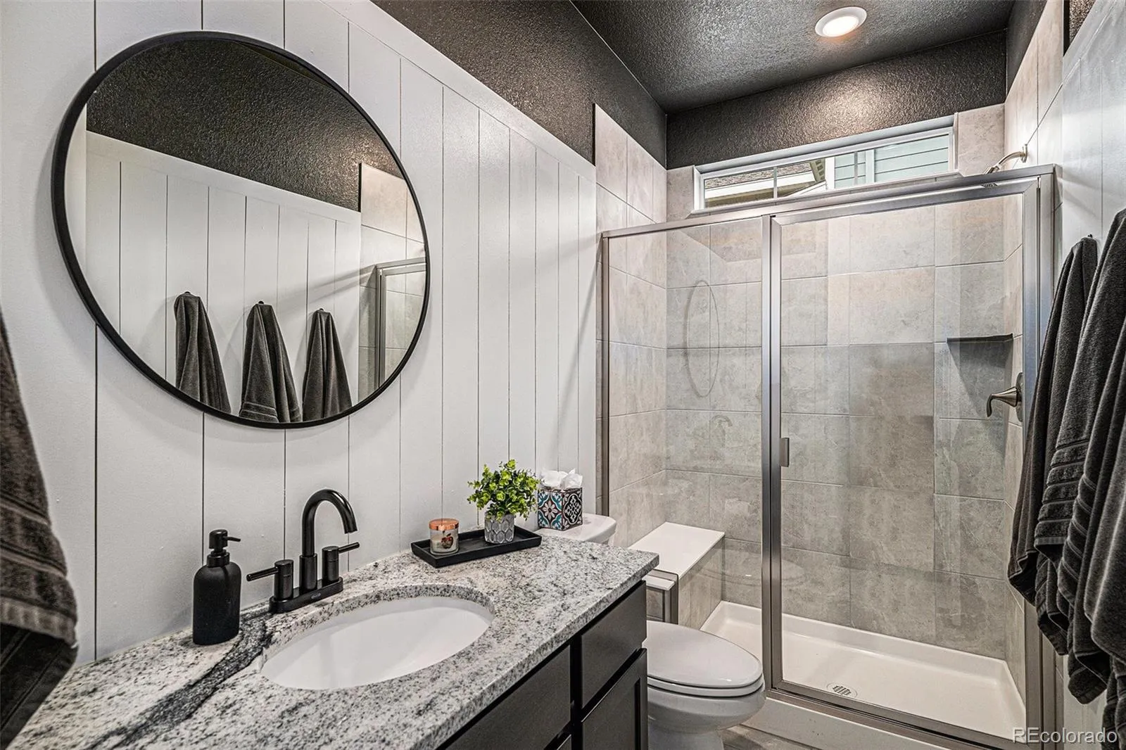 providing privacy for main level secondary ensuite bedroom with walk in closet. Office, bath, linen closet, mudroom & coat closet complete the first floor. Fully finished basement is spectacular – bedroom has huge walk-in closet & the full bath includes custom vanity. The playroom has a large walk-in closet & dance studio/gym with mirrored wall & Marley flooring make a perfect workout room. Second living area has a fireplace & built in cabinets open to bar & large game area & included pool table making this the perfect space to entertain. Pocket office with built-in desk & storage & 3 unfinished storage areas are a bonus. Secondary bedrooms, playroom, basement linen closet, coat closet & pocket office have custom Elfa closet systems from The Container Store. No shortage of storage in this home! Mountain views from front porch. Backyard is beautifully landscaped with tress for privacy &