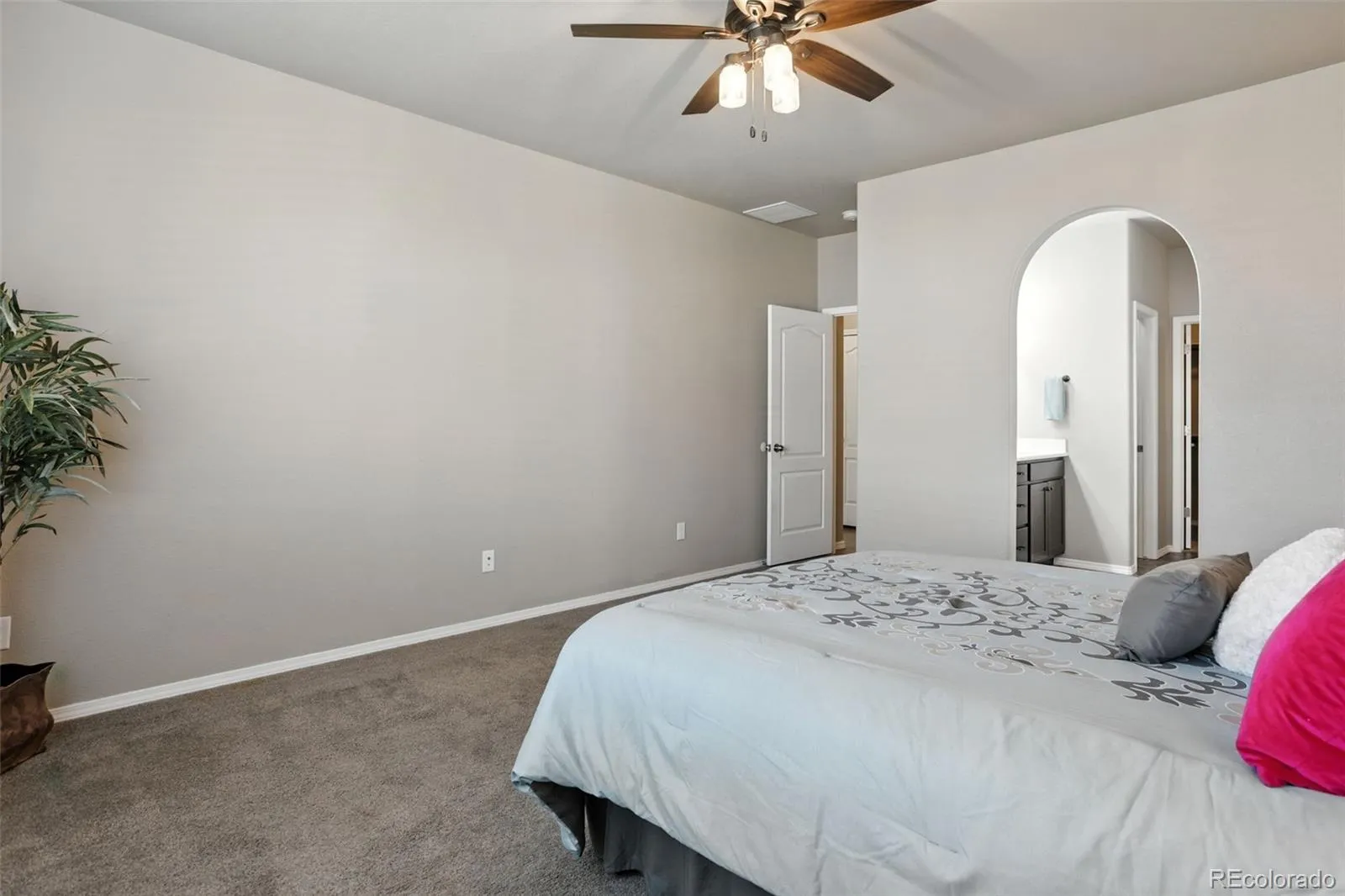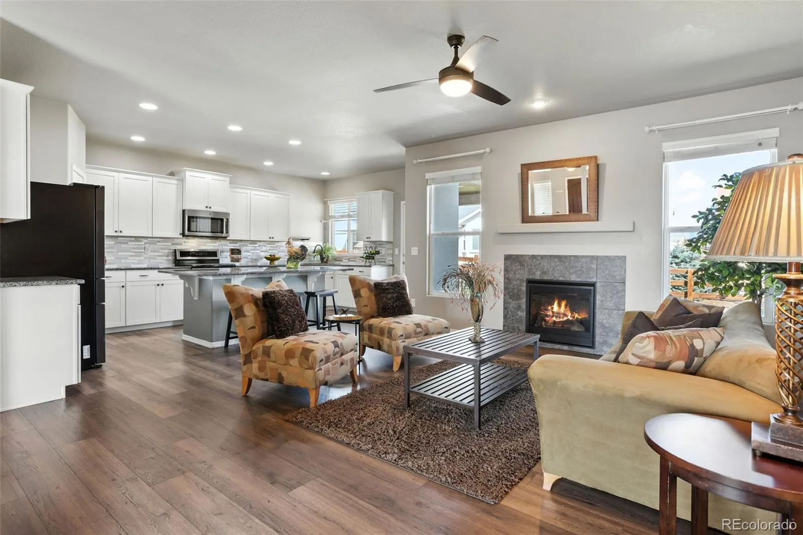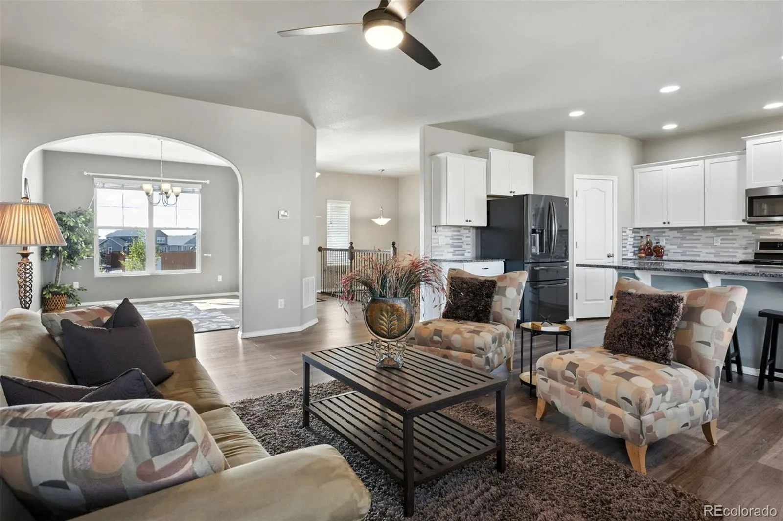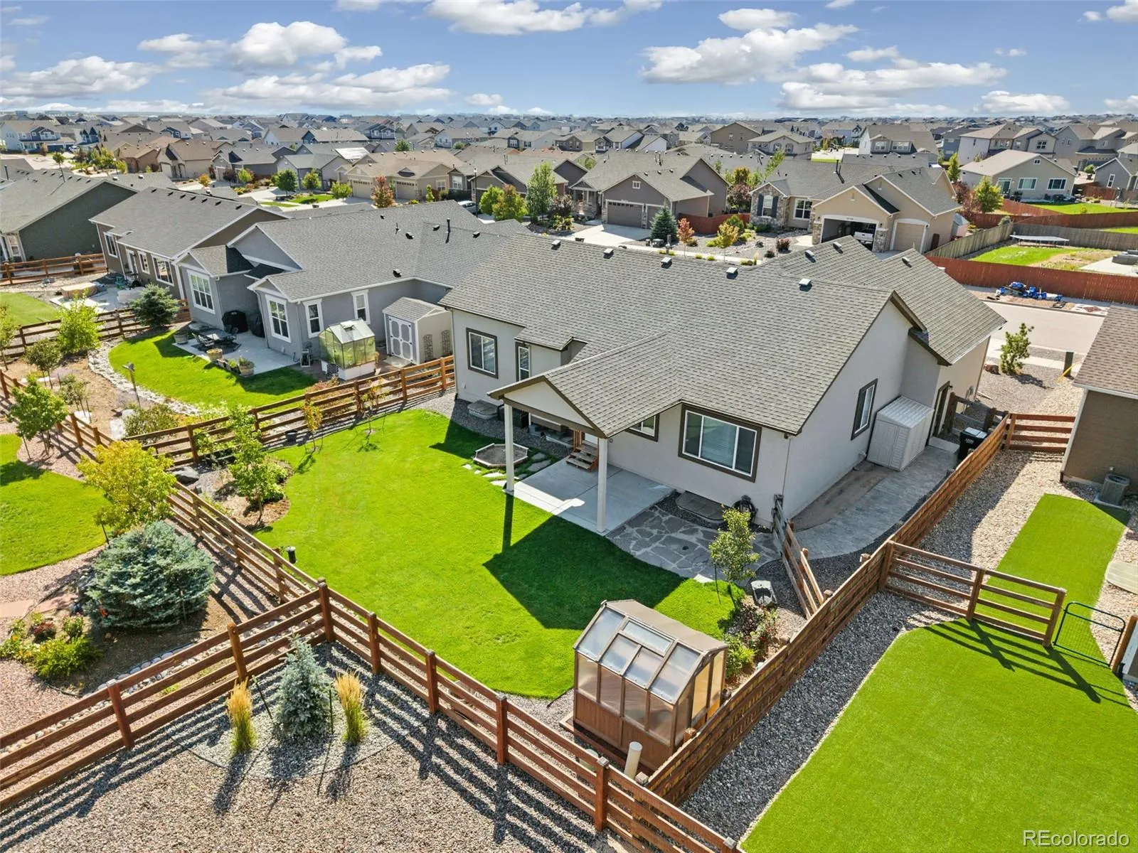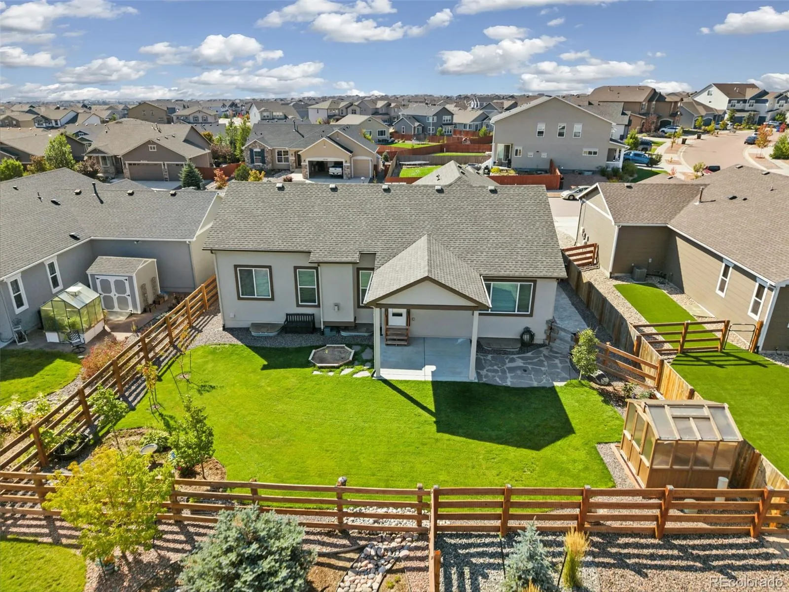 Welcome to this inviting Monarch floor plan by Campbell Homes, designed for easy main-level living with thoughtful finishes & plenty of space for gathering, relaxing, & entertaining. At the heart of the home, the kitchen boasts granite countertops, stainless appliances with gas range, tile backsplash, a spacious walk-in pantry, & an oversized island with barstool seating. A walk-out from the kitchen opens directly to the backyard, while a separate formal dining room with a large picture window offers the perfect spot for hosting. The open-concept living room centers around a cozy gas fireplace, with luxury vinyl plank flooring throughout the main level adding a rich, contemporary feel. The primary suite features a well-sized walk-in closet & a 5-piece bathroom with dual sinks, a soaking tub, & a walk-in tiled shower. Two additional bedrooms, a full hall bath, & laundry complete the main level. Additional touches include blinds throughout & a decorative iron stair railing that leads you to the finished basement. Downstairs, you’ll find a spacious family/rec room with newer carpet, overhead speaker wiring, & a fantastic wet bar complete with sink & mini fridge. The basement also offers two large bedrooms (one with its own walk-in closet), a full bath, & a dedicated theater room with tray ceiling, speaker wiring, & French doors for sound control. Thoughtful storage & multiple linen closets provide practical convenience throughout. The outdoor spaces are just as impressive, with beautifully maintained front & back lawns, colorful garden beds, trees & plantings, & a greenhouse. The side yard is fenced & ready to serve as a dog run, making the backyard both functional & serene. Located in the Meridian Ranch community, residents enjoy access to an outstanding rec center with indoor/outdoor pools, fitness facilities, a new field house, & year-round events. District 49 schools, parks, & miles of trails complete the package—offering not just a home, but a vibrant lifestyle.