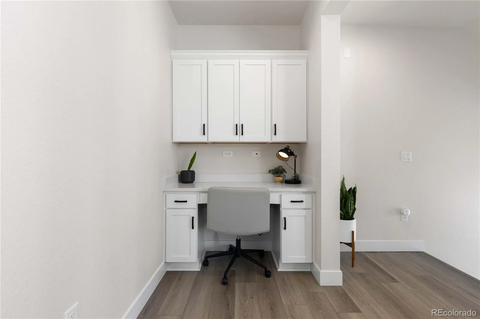 The entry level features a dedicated office and access to the attached 2-car garage, complete with electric vehicle charging capability. Upstairs, the open main living area is filled with natural light. The living room opens to a private balcony with stunning mountain views, while the kitchen and dining area boast quartz countertops, a huge island with seating and sink, stainless steel appliances, a walk-in pantry, and a convenient half bath. A built-in desk provides an additional work or study space.