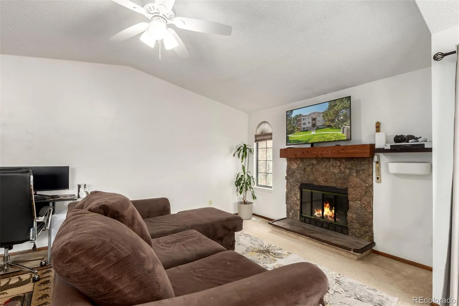 Fantastic opportunity to own this beautiful 2-bedroom top floor corner unit in the sought-after Wood Creek Condos! Step inside to a light and bright open floor plan with soaring vaulted ceilings and fresh interior paint through the home creates a warm, inviting atmosphere. The spacious living area is highlighted by a stunning stone fireplace—perfect for cozy nights in.