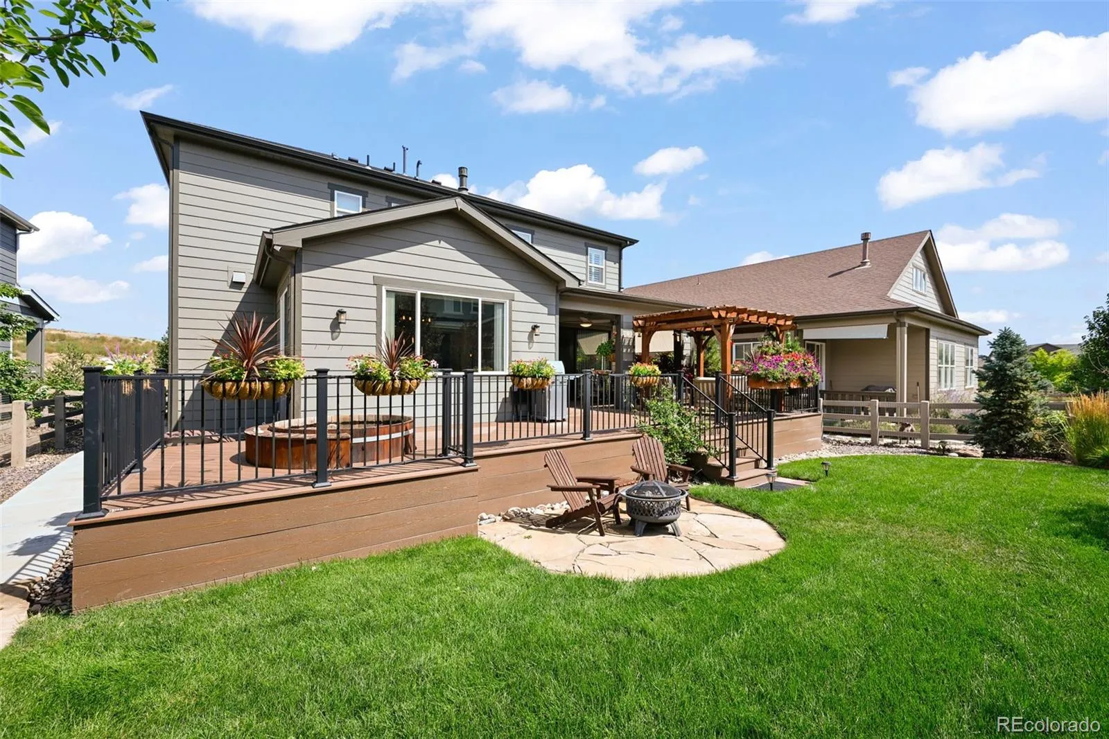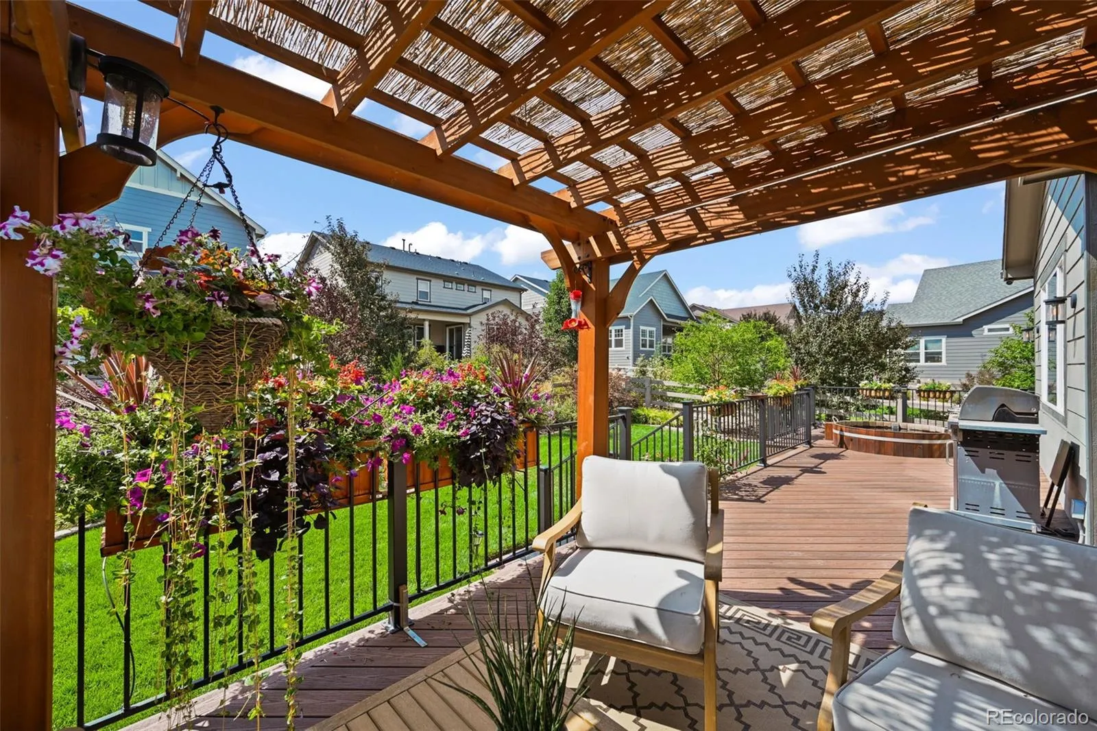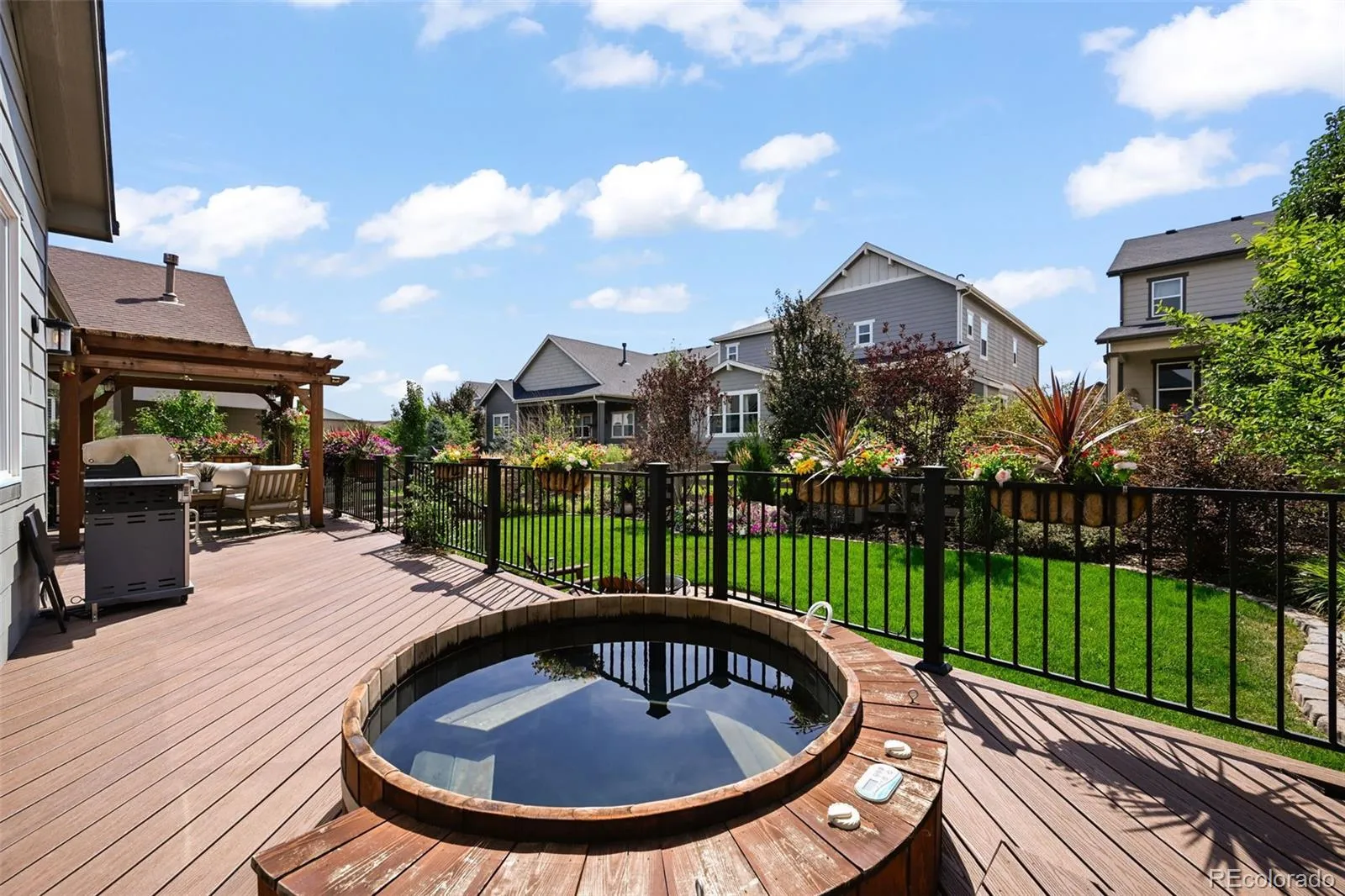 hot tub, a pergola overlooking stunning landscaping, and custom stone flowerbeds.