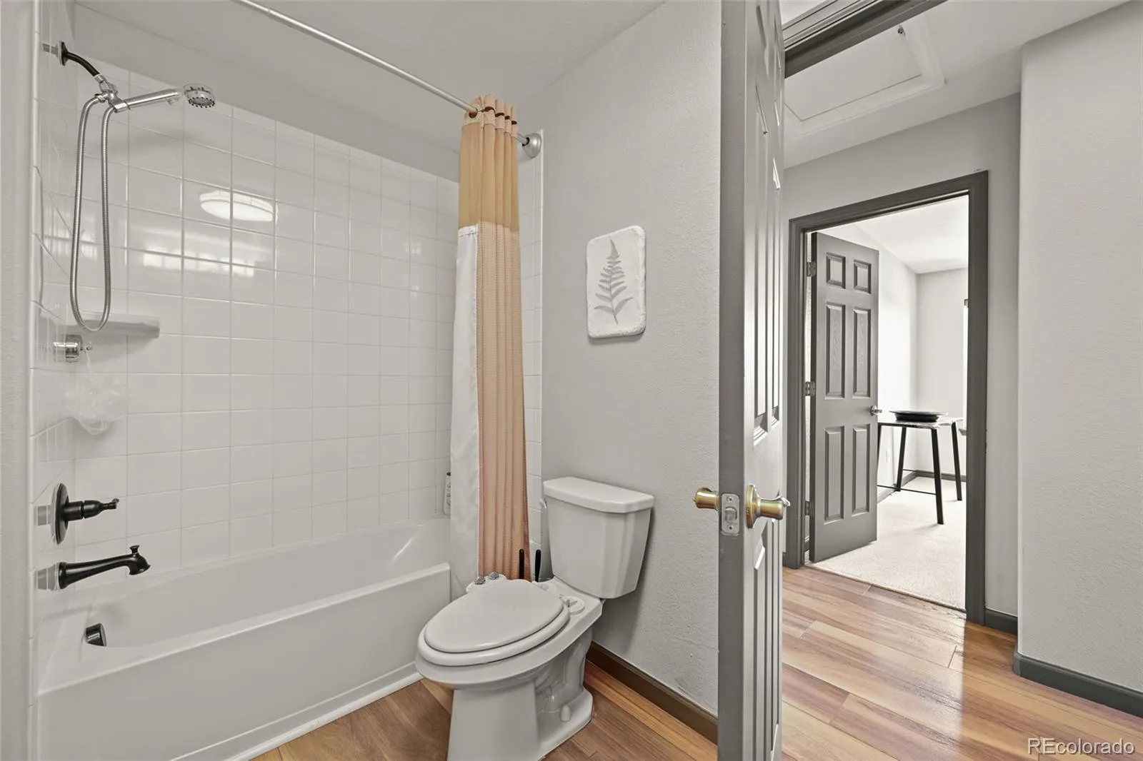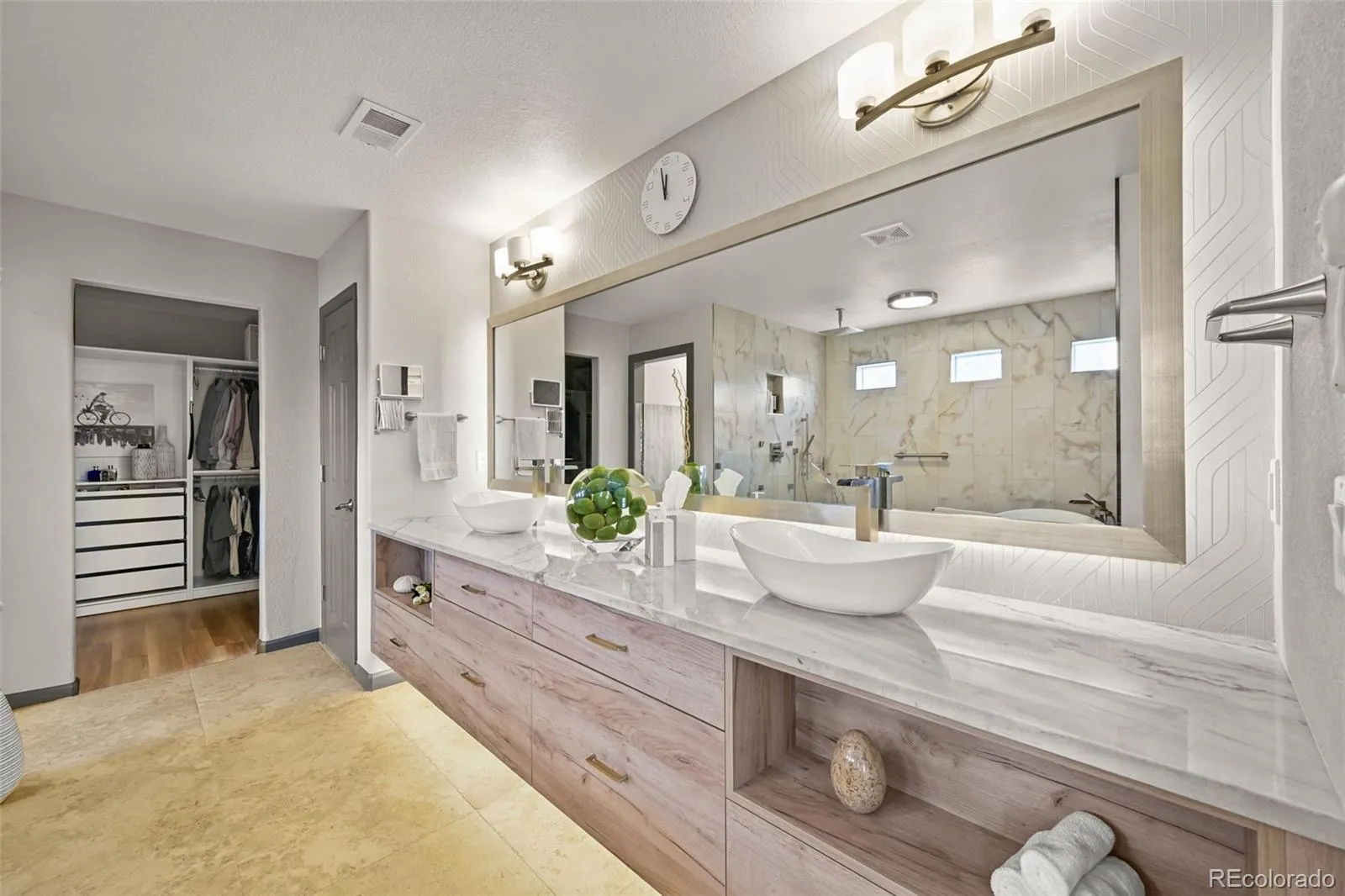 bathroom with a custom-built wardrobe. LVT flooring throughout, ceiling beams,
