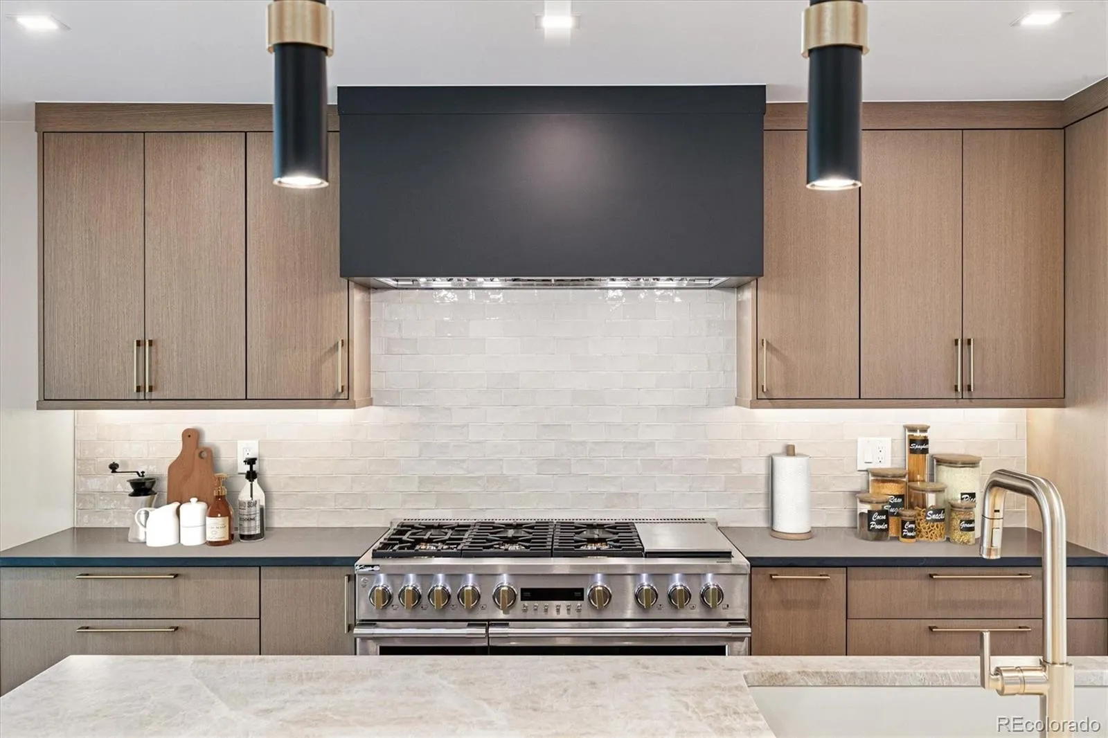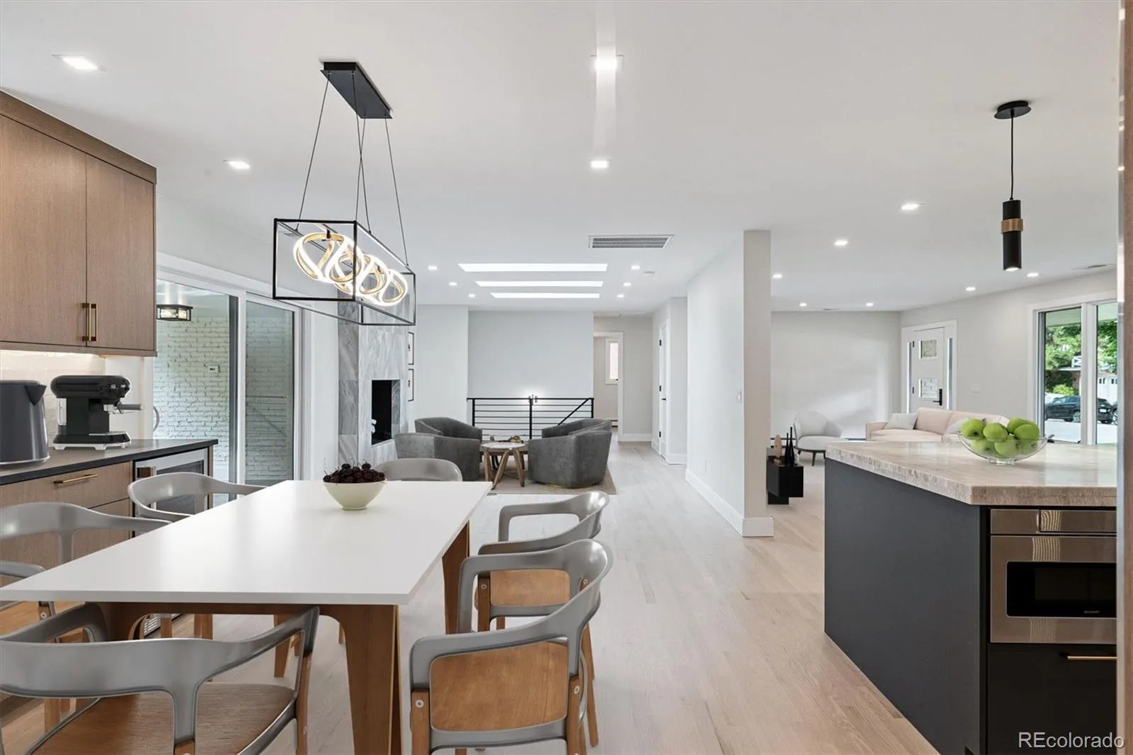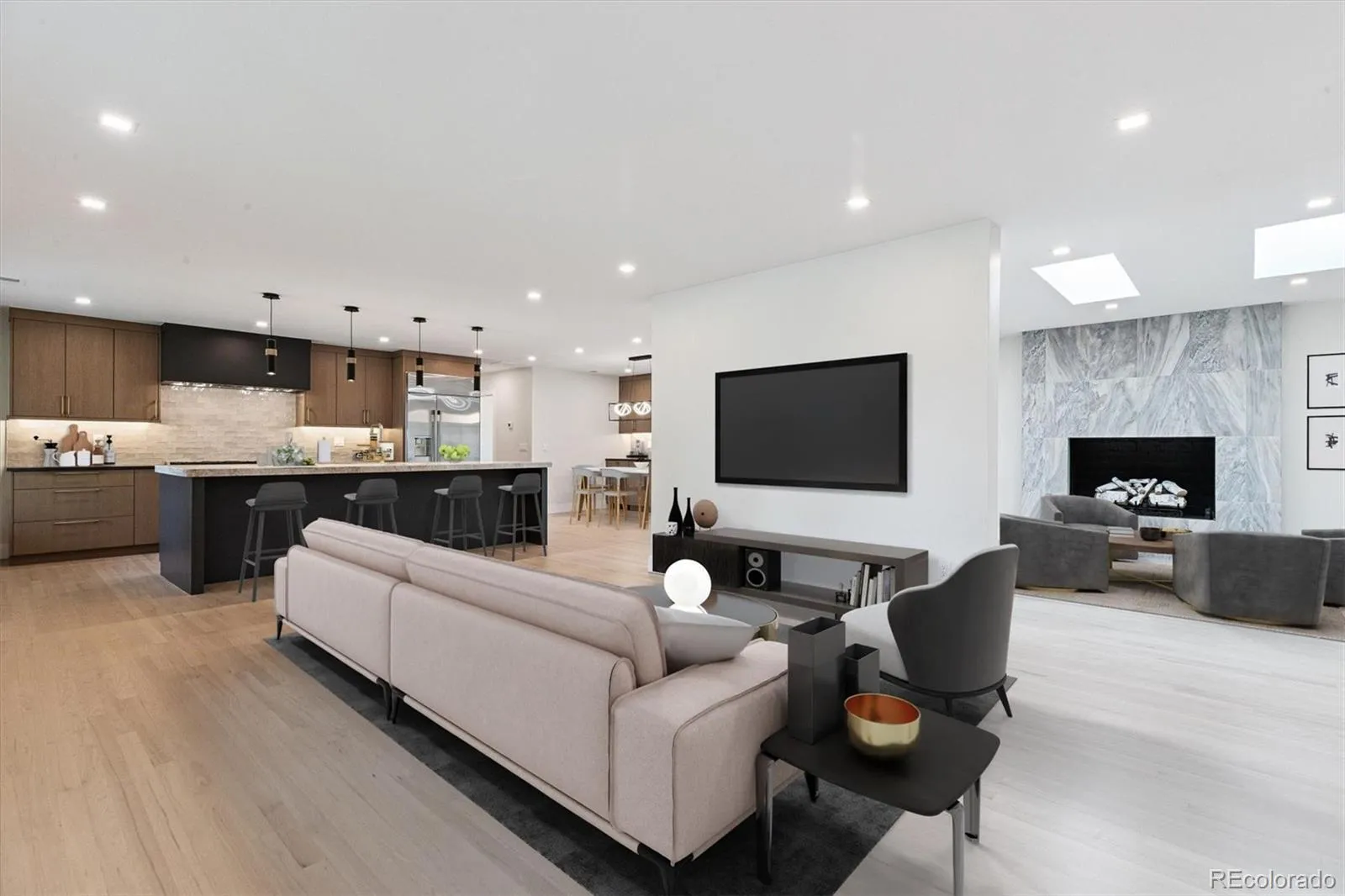 The open floor plan is filled with natural light from skylights and expansive windows, with extended white oak hardwood flooring throughout the main level. The chef’s kitchen is the centerpiece of the home, featuring a Monogram appliance package with 48″ range/double oven, 42″ built-in refrigerator, and custom 48″ hood. Custom white oak cabinetry by Artisan, Brizo fixtures, and a Taj Mahal quartzite island with seating for six combines functionality with designer style. A beverage center and wet bar complete the space.