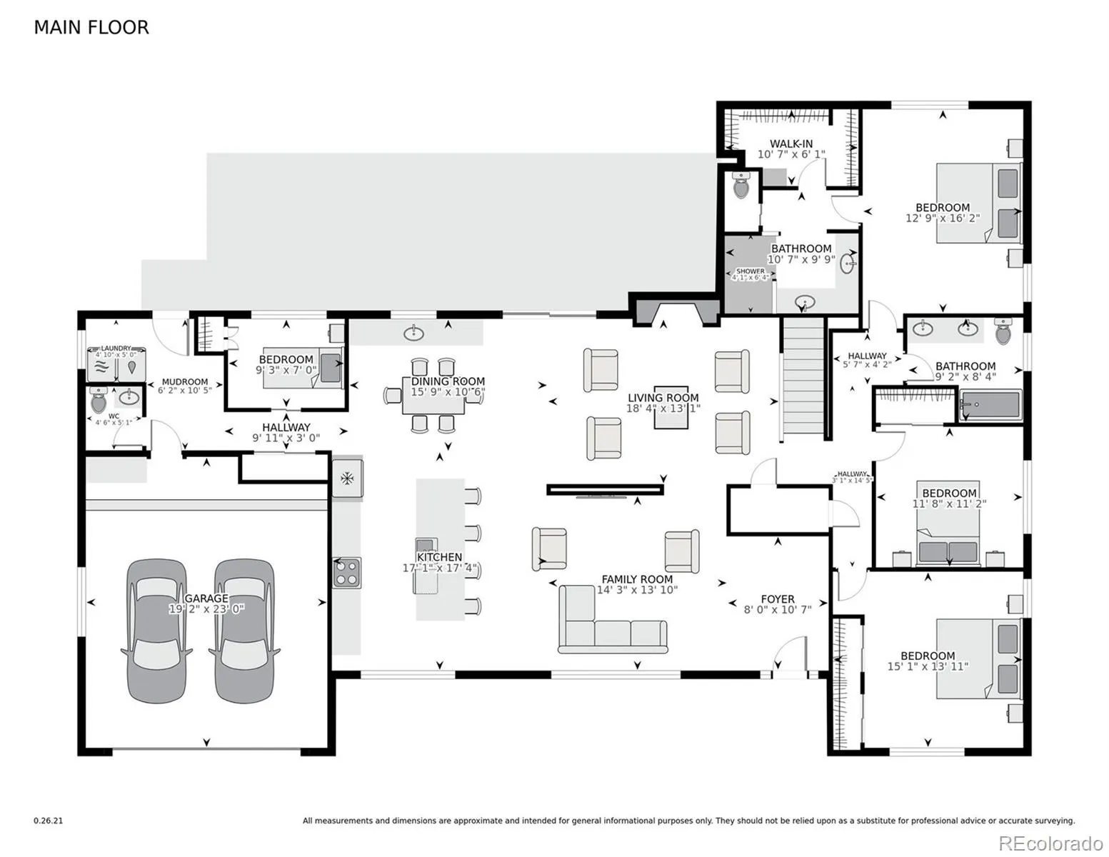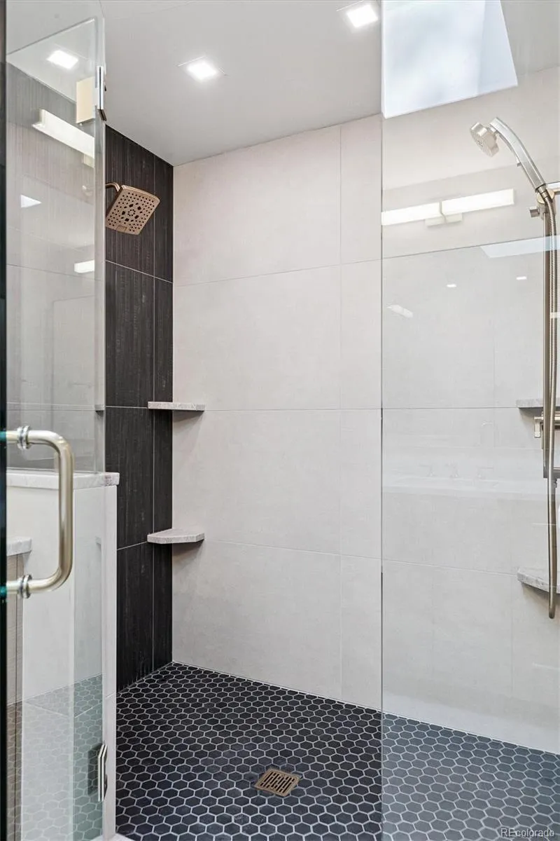 The primary suite offers a spa-like bath with a spacious double shower and Taj Mahal quartzite counters. Two additional bedrooms and a full bath are also on the main level, along with a powder bath and a fifth bedroom that serves ideally as a study or home office, completing the main level.