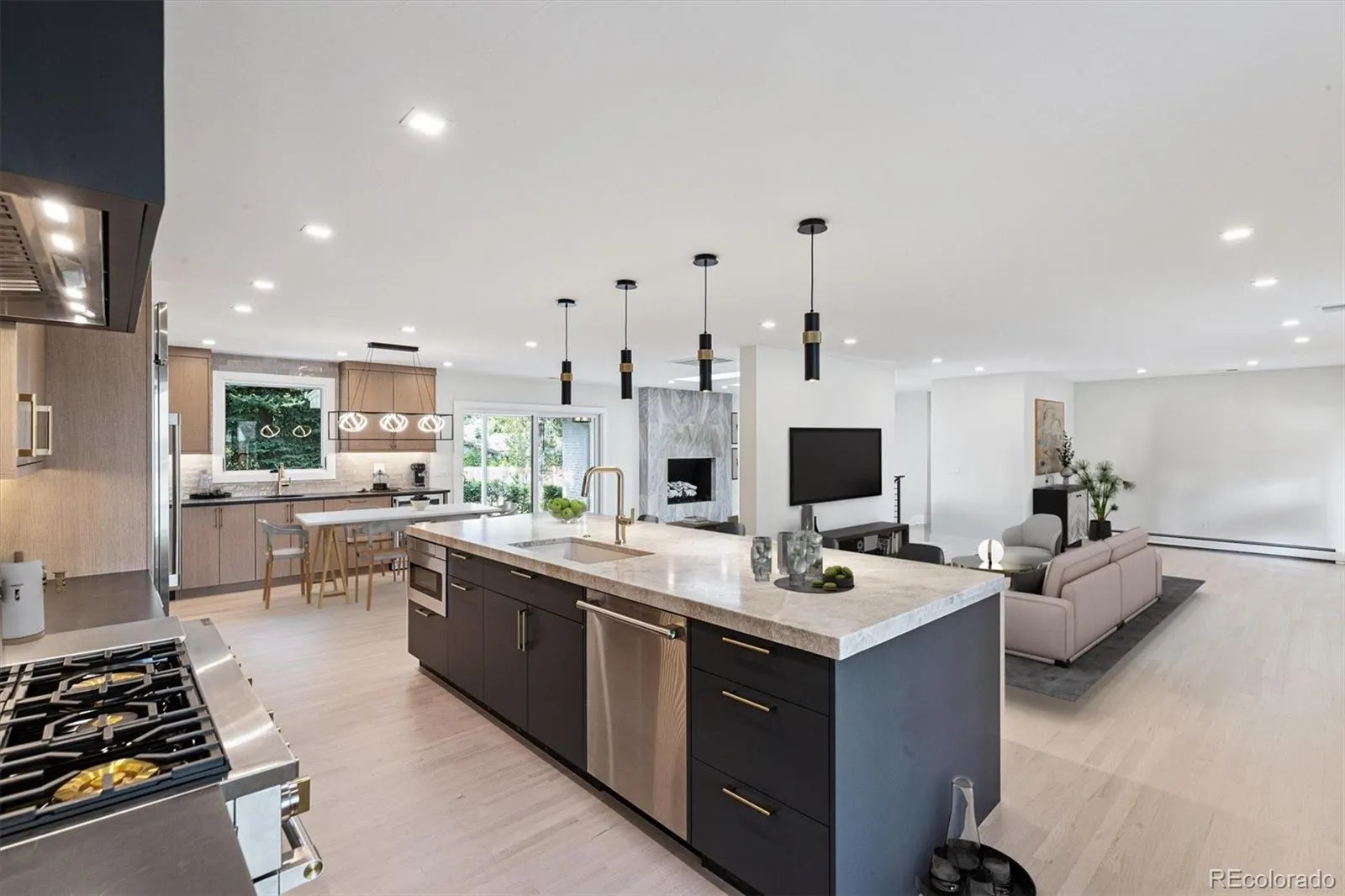 Adjacent to the dining room, a sitting area anchored by a large custom marble tile and gas log fireplace creates an inviting spot for conversation and gatherings.