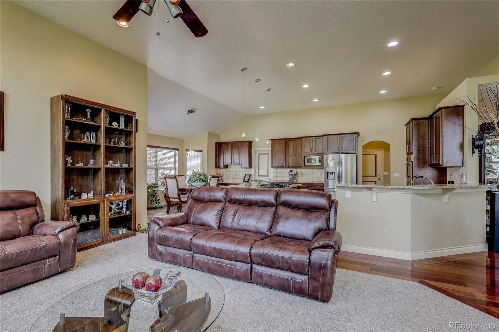 Gorgeous home in Poudre River Ranch—ready for you! This thoughtfully designed ranch home offers over 3,000 sq. ft. on the main level, showcasing elaborate finishes and attention to detail. The rich cabinetry and slab granite countertops showcase the home’s superb craftmanship and the quality of Martin Homes. The main level is designed for both everyday living and entertaining. Highlights include formal and informal living areas, a dedicated home office, and a luxurious owner’s suite with a barrel-vaulted ceiling, dual walk-in closets, an attached laundry room, and a spa-like five-piece bath. The open kitchen offers stainless steel appliances, abundant cabinetry, a walk-in pantry, and easy access to the balcony overlooking the beautifully landscaped yard.