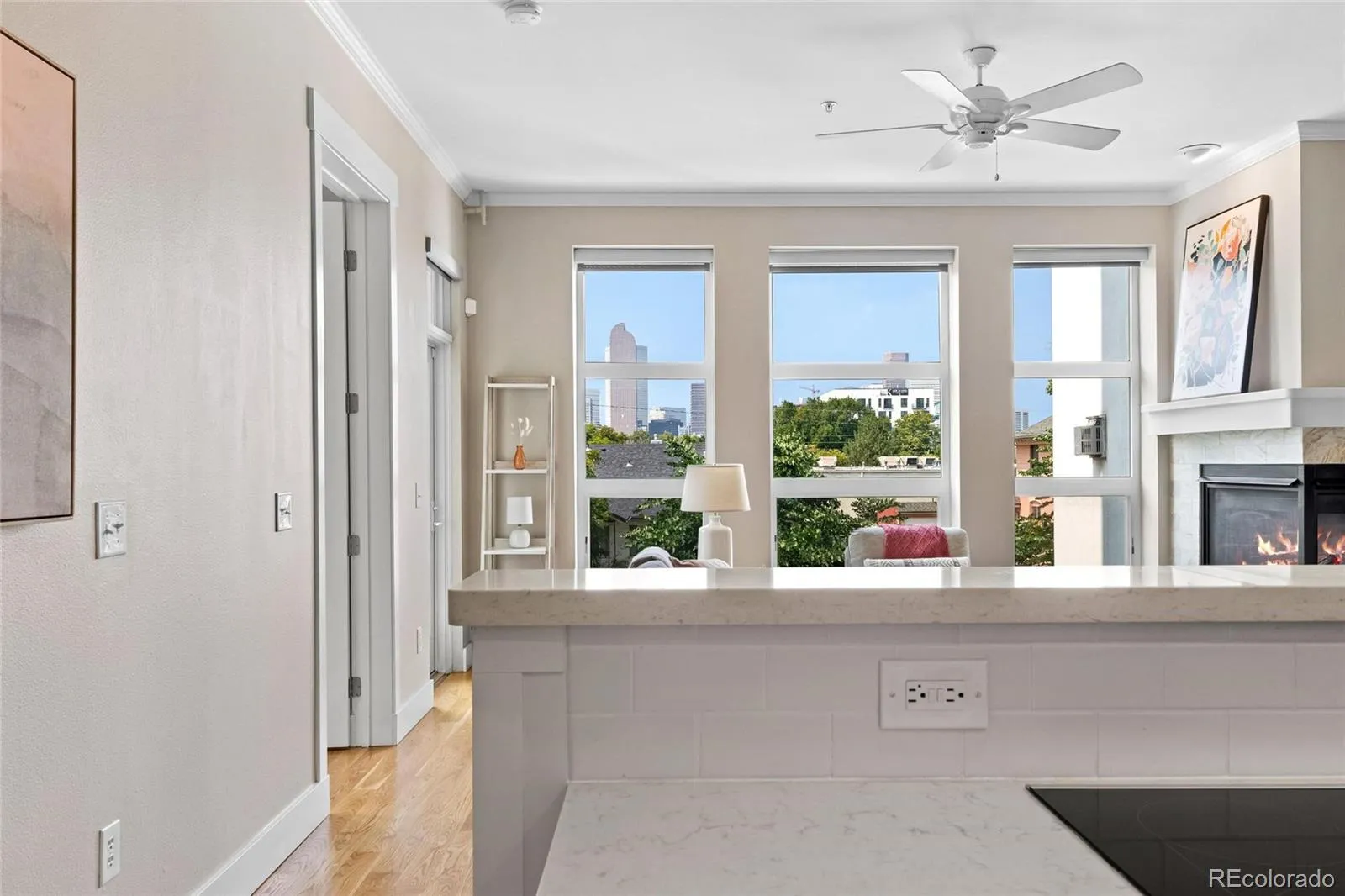 The Kitchen was recently remodeled, with no builder-grade finishes- including all new plumbing fixtures, dishwasher, microwave, stovetop, disposal, and quartz countertops. Both bathrooms have been remodeled, featuring new fixtures, toilets, bathtubs, showers, and floor tile. Enjoy City views at night and solar shades in the living room for privacy, as well as custom shutters in both bedrooms. Move-in ready with new washer/dryer, upgraded new custom solid-core doors throughout, including the closets. All the hard work of organization is done with Container Store shelving/drawers in every closet + laundry room. Relax by the gas fireplace, which boasts new marble fireplace trim. The floors have all been redone, featuring New white oak floors, new tile in bathrooms, and a laundry room. New HVAC (AC & heating) corner unit for privacy and a covered balcony with stunning views. Rare find with an HOA that has $ 500,000 in reserves after extensive work done to preserve the quality of the building. Secure Covered Parking (space #9)