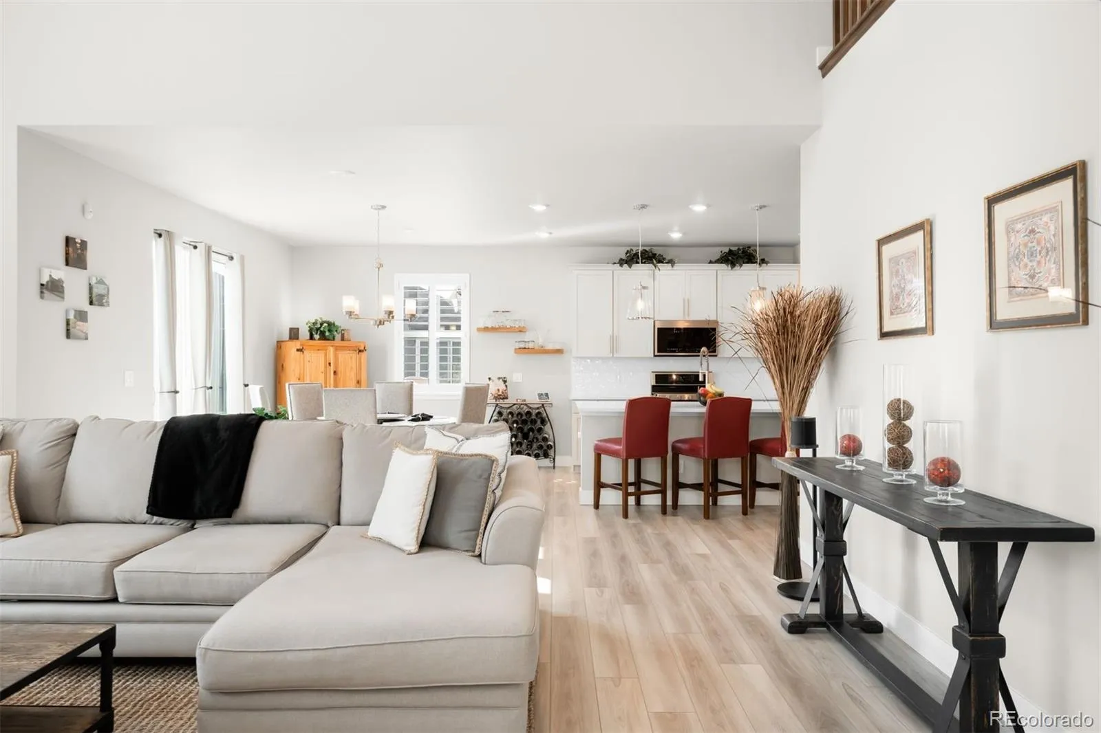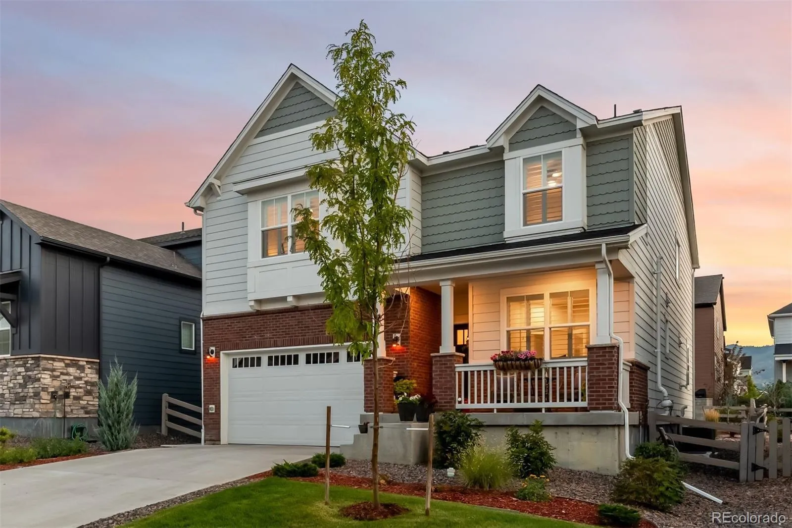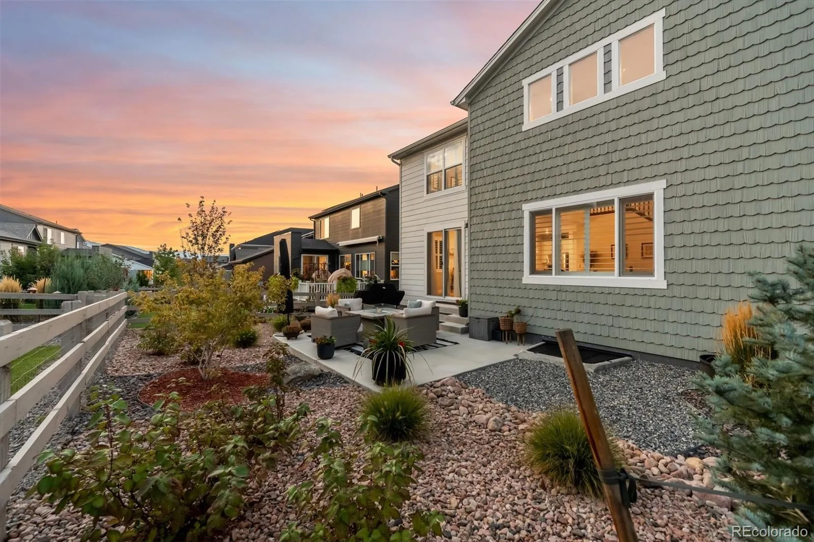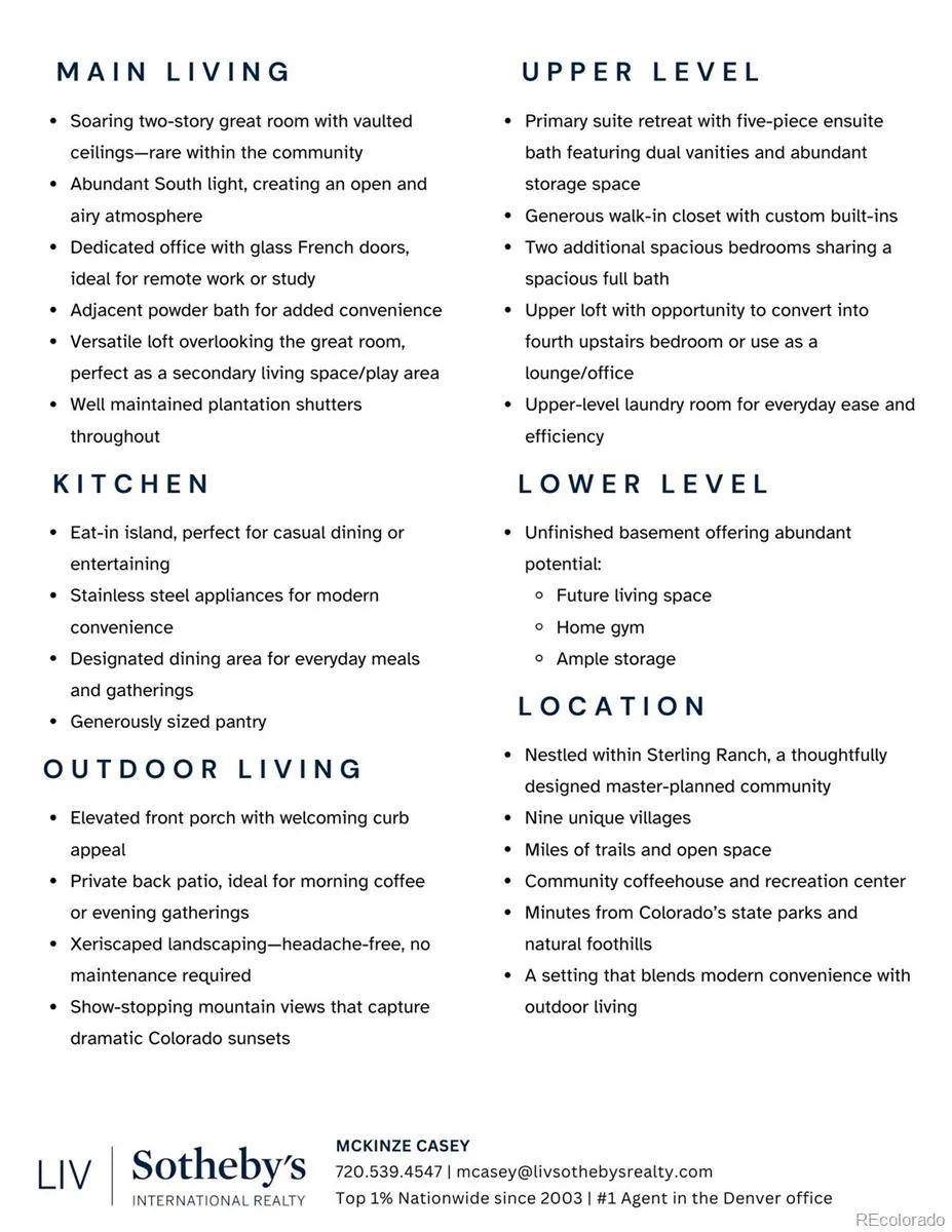 Ascend the welcoming, elevated front porch of 9780 Banner Peak and step into one of Sterling Ranch’s most coveted floorplans. Built in 2022 and meticulously maintained, this residence combines thoughtful design and everyday functionality. At its heart, a soaring two-story living room with vaulted ceilings creates an airy, light-filled gathering space, an uncommon feature within the community. The main level includes a dedicated office with glass French doors, ideal for remote work, as well as an adjacent powder bath for added convenience. Upstairs, a versatile loft overlooks the great room, complementing three spacious bedrooms. The primary suite offers a serene retreat with an ensuite bath featuring dual vanities, a soaking tub, and a separate shower, along with a generous walk-in closet. Two additional bedrooms share a full bath. An upper-level laundry room enhances everyday ease. The unfinished basement offers abundant potential, whether envisioned as future living space, a home gym, or simply ample storage. The outdoor space is designed for effortless enjoyment. Professionally xeriscaped landscaping means no maintenance is required, simply step outside and enjoy the setting without lifting a finger. A private patio provides the perfect backdrop for morning coffee, evening gatherings, or relaxed weekends, all framed by west-facing mountain views that capture Colorado’s dramatic sunsets. Nestled within Sterling Ranch, a master-planned community in Douglas County, this home provides access to nine villages, miles of trails, open space, and thoughtful amenities, from a community coffeehouse to a recreation center. Perfectly situated near Colorado’s state parks and natural foothills, the setting blends modern convenience with outdoor living.
