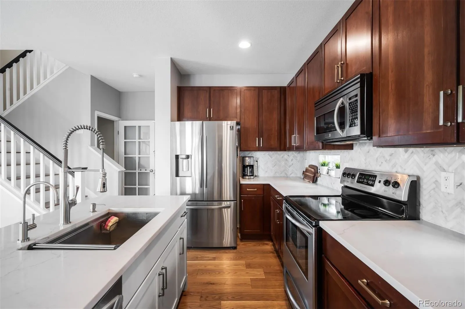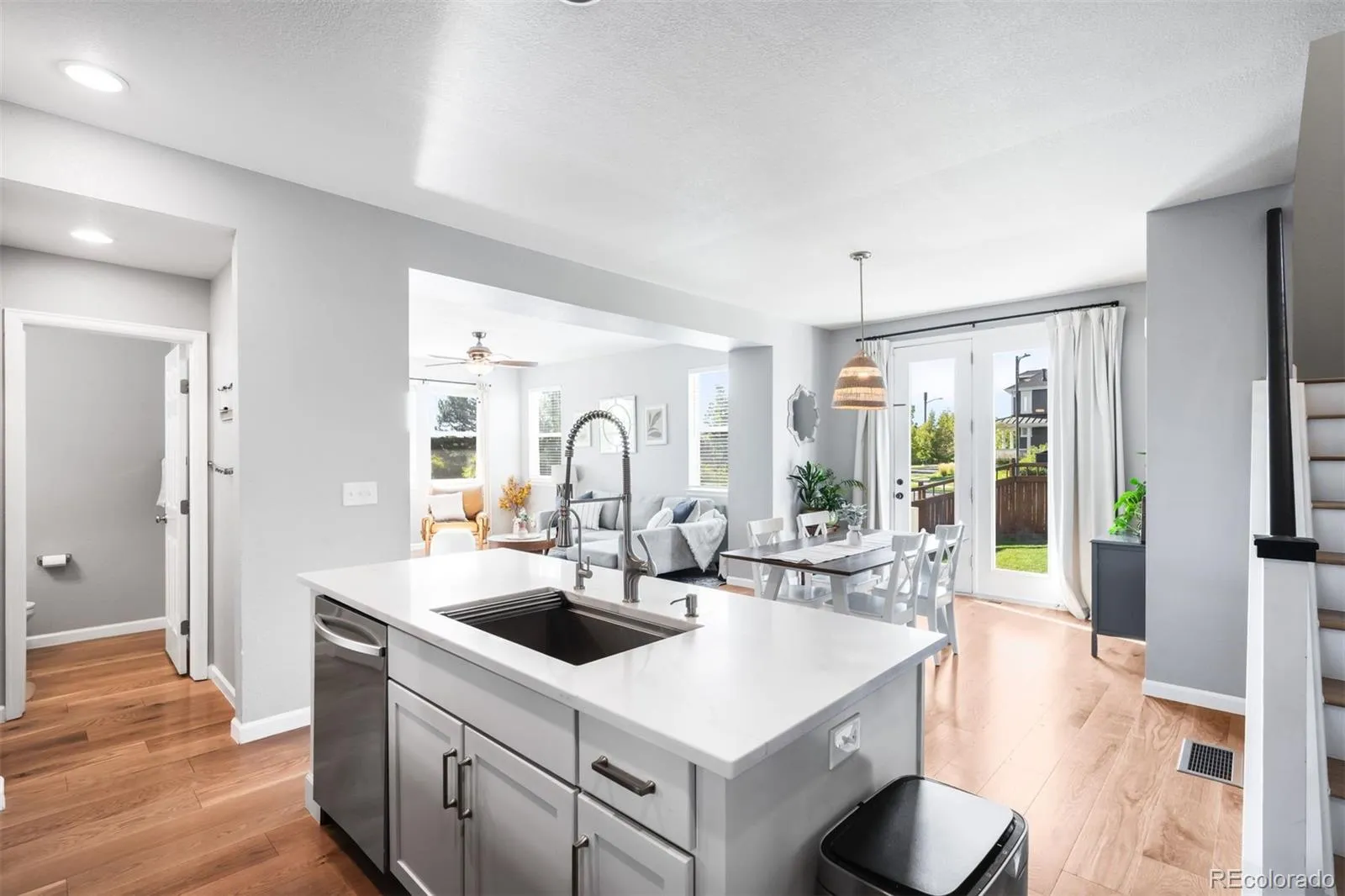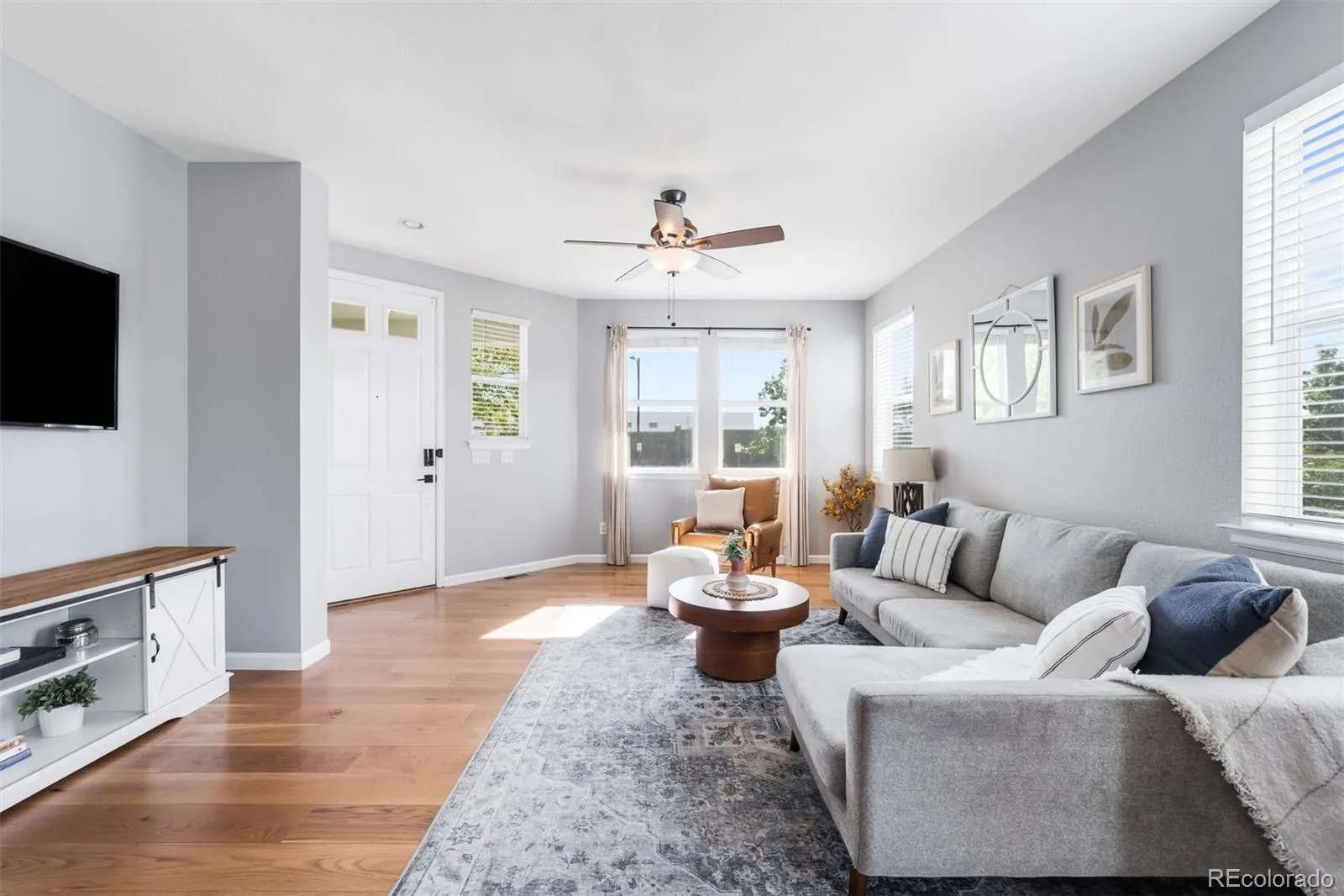 Set on a landscaped corner lot in the heart of Central Park, this beautifully updated home blends timeless comfort with modern style. A welcoming front porch leads into a sunlit living room with hardwood floors and effortless indoor and outdoor connection. The dining area opens through French doors into one of the neighborhood’s most coveted oversized backyards, a rare retreat offering space for entertaining, play, and quiet relaxation. At the center of the home, the chef’s kitchen showcases rich cabinetry, quartz countertops, a striking herringbone backsplash, stainless steel appliances, a reverse osmosis system, and a generous island that invites gathering. Upstairs, the primary suite offers a spacious closet and spa-like bath, joined by two additional bedrooms, a shared full bath, and a conveniently located laundry room. The finished basement expands the living space with a large family room, a versatile bedroom, and an additional full bath. Outdoor living is elevated with both a covered front porch and a private backyard patio framed by the oversized lot, while the attached two-car garage adds everyday ease. Beyond the home, the lifestyle is exceptional. Enjoy 80 acres of parkland, wildlife trails at Westerly Creek, the Central Park Rec Center and community pool, and Stanley Marketplace just minutes away. In the heart of Central Park, you are steps from Sprouts, the 29th Avenue Town Center, seasonal farmers markets, live music on the green, and a variety of shops, restaurants, and top-rated schools.