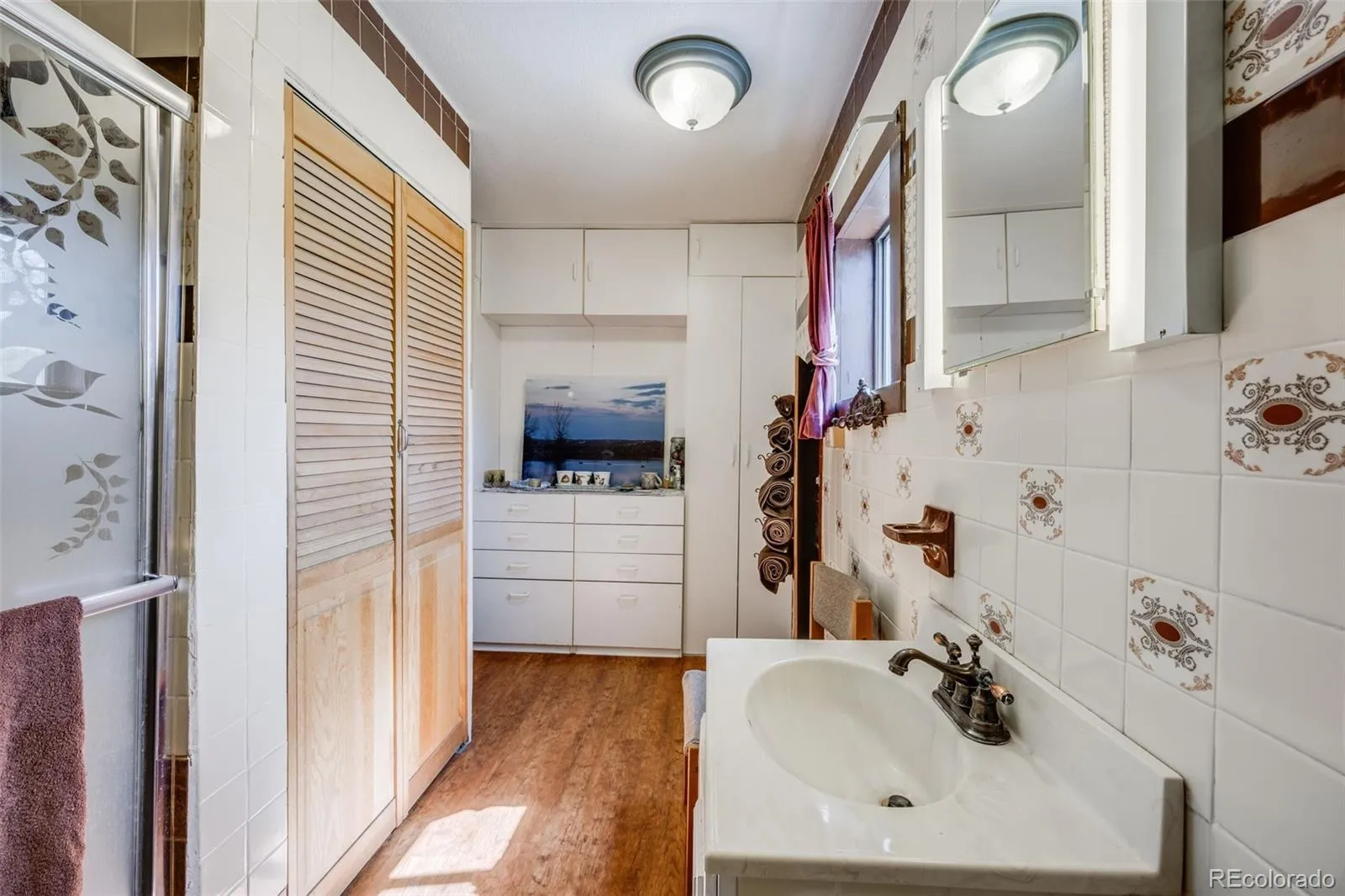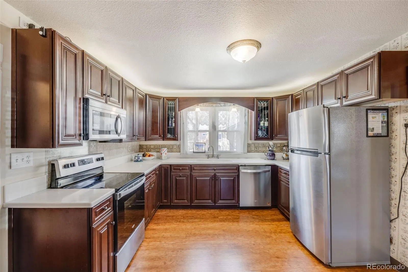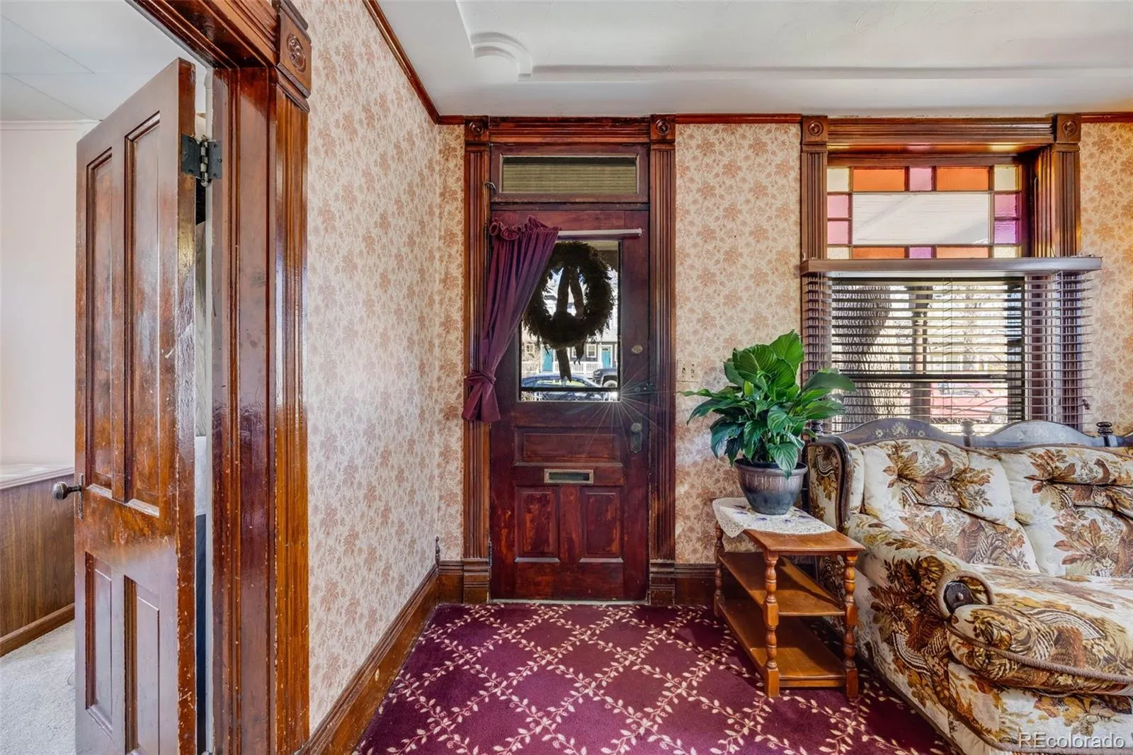 wallpaper, and distinctive architectural touches. The kitchen has been tastefully updated with cherry-toned cabinetry and