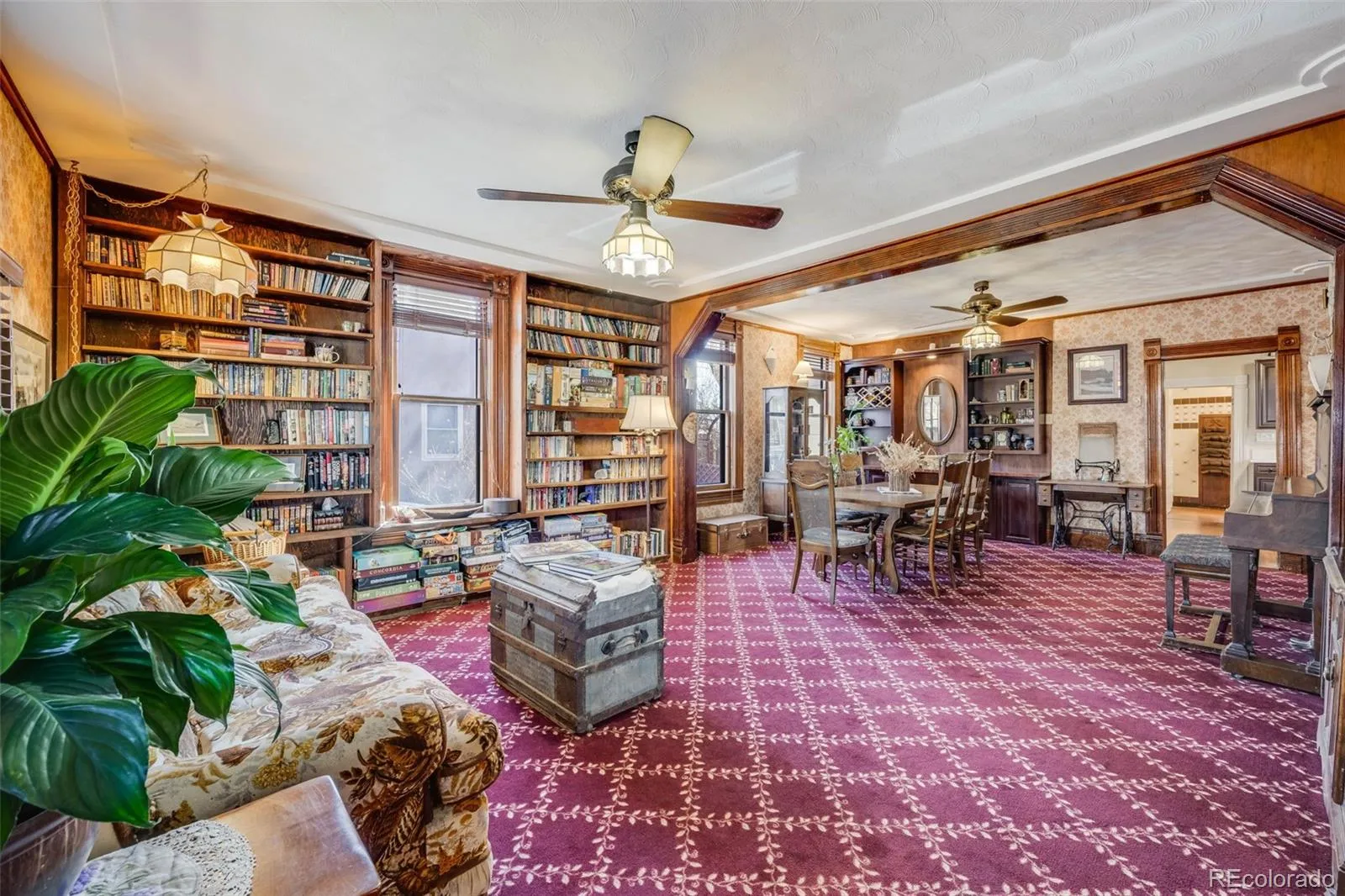 reflect the home’s historic integrity. The spacious living and dining areas are accented by built-in bookshelves, vintage
