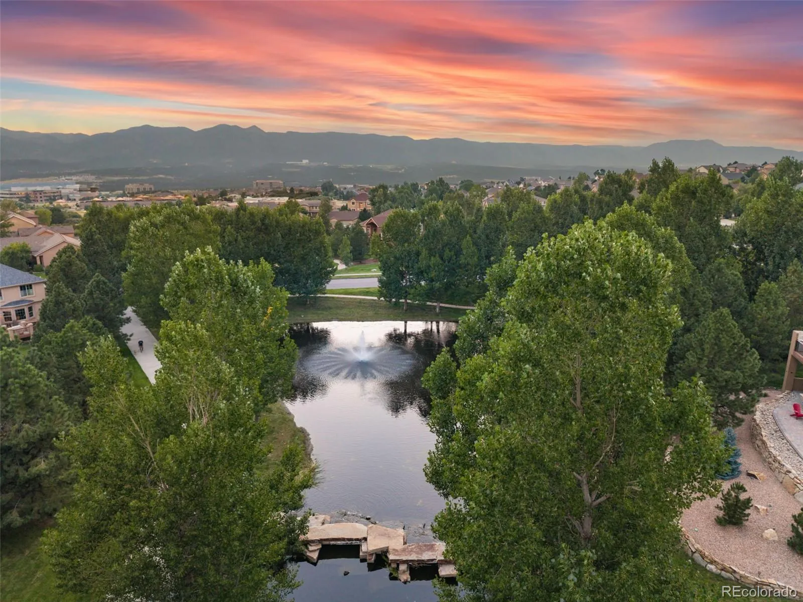 Welcome to this stunning 6-bedroom, 5-bathroom home with over 4,500 sq ft and a spacious 3-car oversized garage, perfectly situated in the highly desirable Stone Crossing neighborhood. Surrounded by community amenities including an outdoor amphitheater, scenic pond, and trails, this home offers a true Colorado lifestyle near schools, shopping, and the Air Force Academy. The beautifully manicured front yard and covered porch invite you inside, where hardwood floors and a vaulted ceiling create a grand entrance accented by modern lighting. The formal dining room is ideal for family gatherings. Adjacent, the formal living room offers a cozy tile fireplace and plush carpet, creating the perfect space to unwind or entertain. A convenient powder room with tile counters and storage is just steps away. Continue into the hearth room with hardwood floors, stone fireplace, and custom built-ins. The gourmet kitchen boasts granite countertops, hardwood flooring, stainless sink, gas cooktop, walk-in pantry with wood shelving, appliance storage closet, and a large eat-in island. The breakfast nook opens to a spacious deck, with mature trees lining the backyard. Upstairs, the luxurious primary suite offers a sitting area, tile fireplace, 5-piece bath with soaking tub, and a generous walk-in closet with center island. The second bedroom has an en-suite full bath, while the third and fourth bedrooms share a Jack-and-Jill bath with private vanities, walk-in closets, and Pikes Peak views. The finished basement includes two additional bedrooms, a bathroom with a shower, a large family room with slate fireplace, and a wet bar with granite counters, copper sink, wine cooler, and beverage fridge. The dedicated theater room features six plush chairs for a cozy viewing experience. With access to District 20 schools, proximity to the Air Force Academy, this home is ideally located!