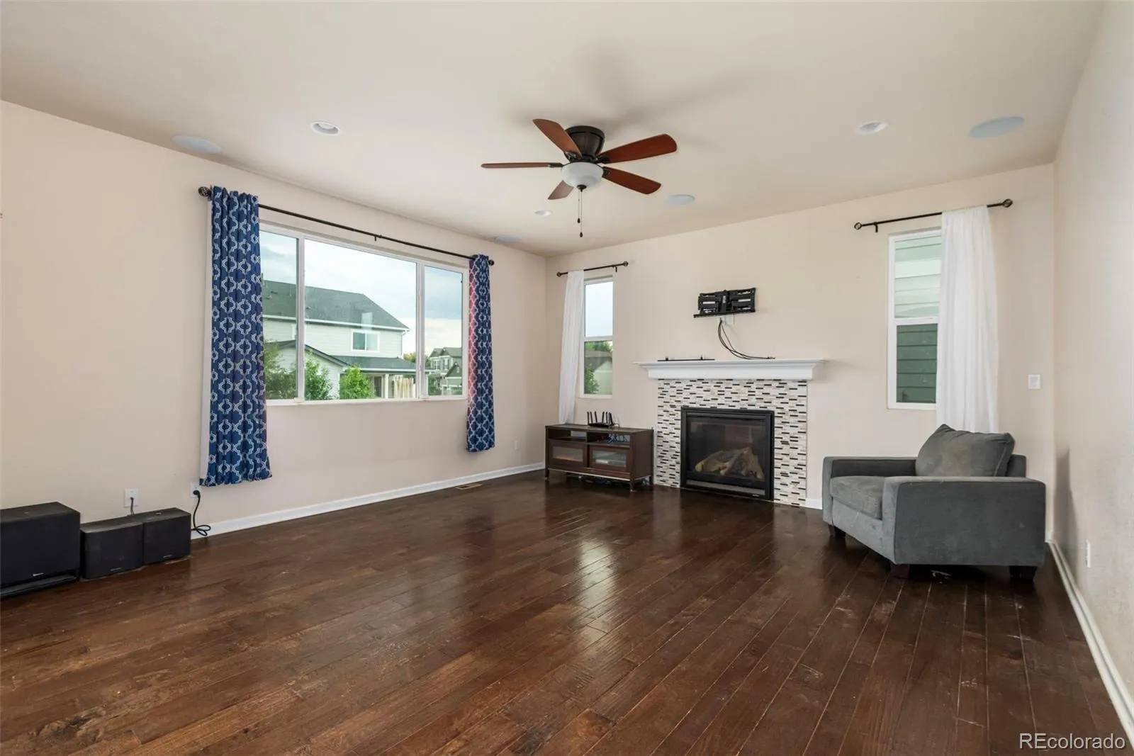 The living room is open and has built in 5.1 Surround sound with a cozy fireplace.