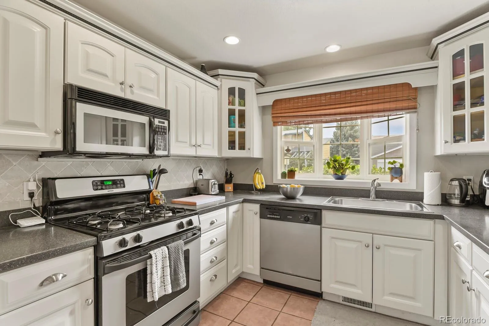 Welcome to this warm and inviting multi-level home! Step into the entryway and informal breakfast area to soaring ceilings, with a dramatic view up to the main living level above. The beautifully updated kitchen gets tons of light from a sunny bay window above the sink and features stainless steel appliances and lots of cabinets. Access the side patio and backyard through a sliding glass door at this level. Up the partial flight of stairs you’ll find an expansive open living and dining space with vaulted ceiling, anchored by a cozy wood burning fireplace and hardwood floors. French doors lead out to a large deck overlooking the backyard. Continue up to the top level where the hardwood flooring flows into the primary bedroom with updated en-suite bath, along with two other bedrooms and a full bath off the hallway. Down just a half flight of stairs from the entry level, the basement provides additional living space as well as a combined laundry room and half bath. The spacious backyard has easy care artificial turf. New furnace and AC, as well as a new roof, were installed in 2023. Convenient location near US 36 and Wadsworth Pkwy, and walkable to shopping and dining. Don’t miss this fantastic opportunity!
