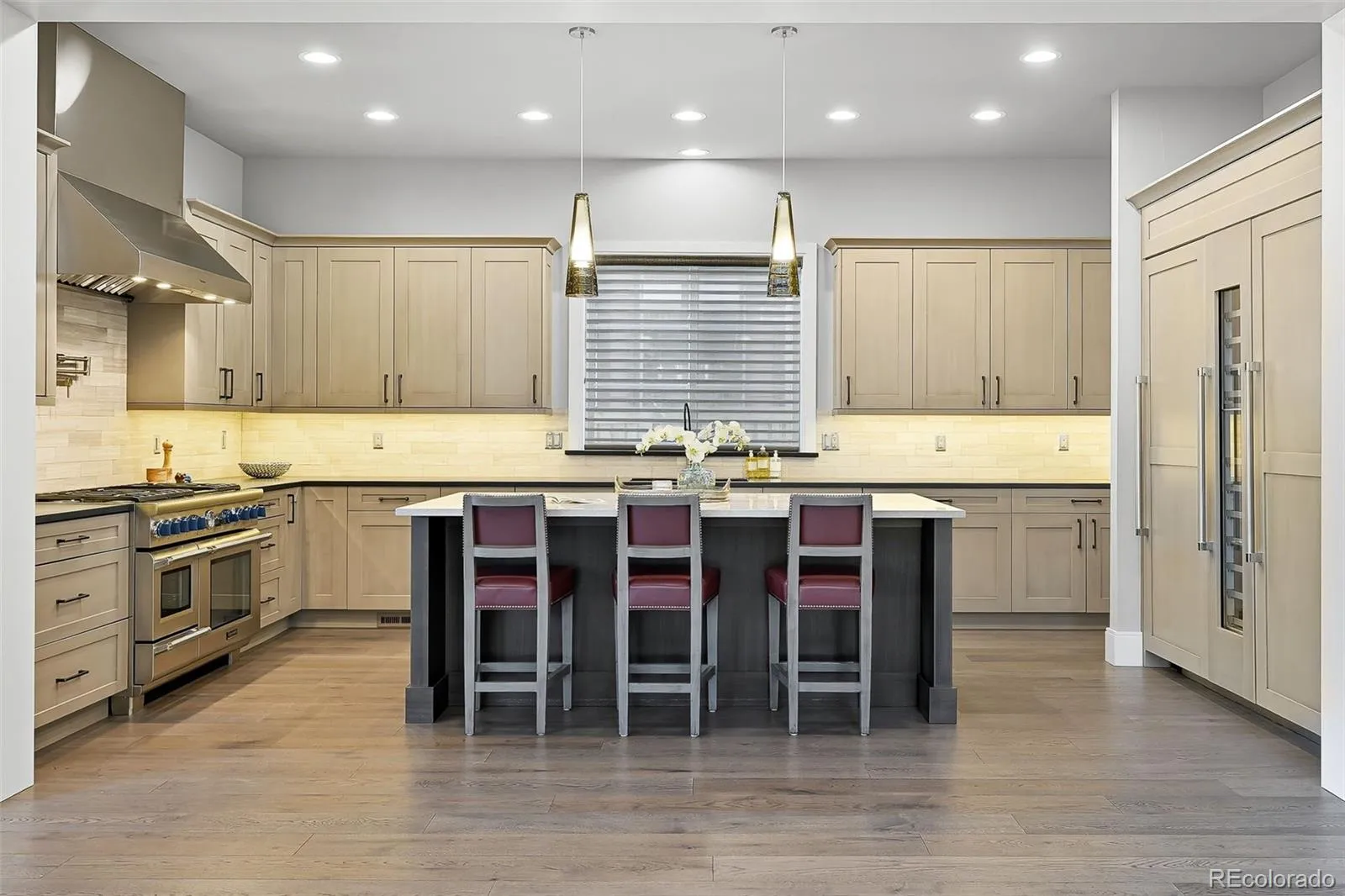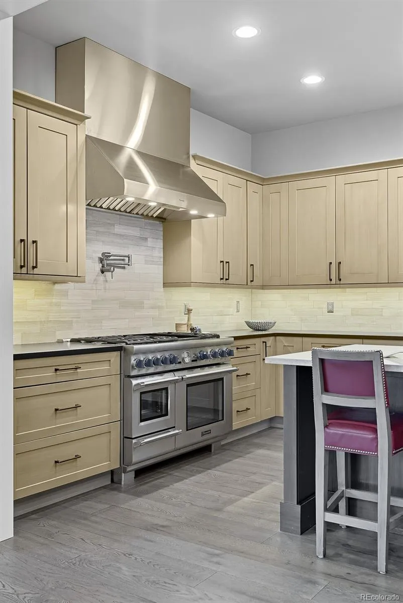 The main floor is designed with both everyday living and entertaining in mind. At its center, the chef’s kitchen features an oversized island, built-in Thermador refrigerator and freezer, wine refrigerator, 48-inch Thermador range with water spout, and two dishwashers. The pantry provides added storage, while the adjacent formal dining area is ideal for gatherings. The open-concept family room with gas fireplace flows into a private office with custom built-ins, a stylish powder bath, and a functional mudroom with laundry and utility sink.