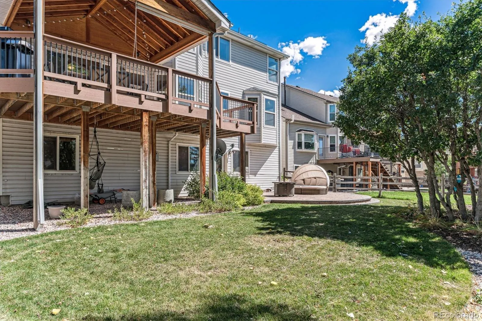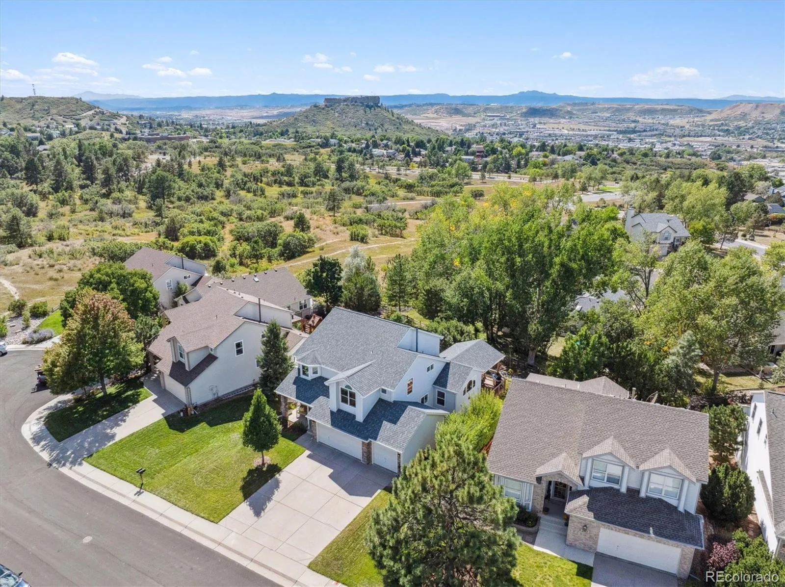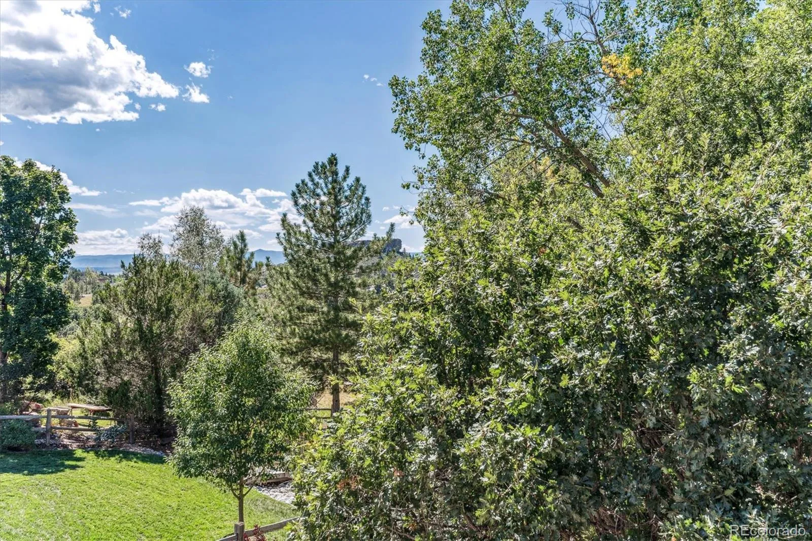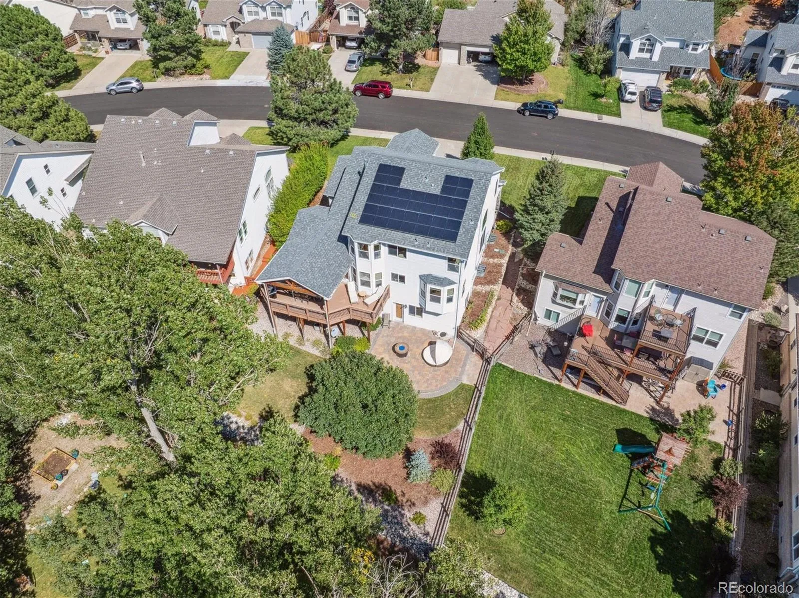 Full of Charm and nestled in a cul-de-sac in the established Woodlands neighborhood where mature trees and a big lot come together to make this your next stop to call home. With 5-bedrooms, 4-bath, this home blends timeless character with modern updates and unforgettable outdoor living. A curved staircase makes a striking first impression, while arched entryways, bay windows, vaulted ceilings, and gleaming hardwood floors add warmth and style throughout. The main floor study offers a quiet retreat or versatile work-from-home space, while the formal living and dining rooms are perfect for gatherings both large and small. The heart of the home is the fully remodeled kitchen (August 2025), showcasing sleek finishes, induction gas cooktop, updated cabinetry, and a designer backsplash. Upstairs, the primary suite is set apart for privacy, while the finished walkout basement feels like an extension of the main level with higher ceilings, a private bedroom with ensuite bath, kitchenette, exercise room with mirrored walls, and built-in speakers for movie or game nights. Outdoor living is equally impressive with a backyard full of mature pines and a custom pavilion-covered deck designed for year-round entertaining. Solar panels are included and fully paid off, offering energy efficiency and long-term savings for the new homeowner. The 3-car garage comes complete with an EV charging station, adding everyday convenience to the lifestyle. From this central yet tucked-away location, you’ll enjoy serene trails through the Woodlands Bowl and Woodlands Park—both surrounded by trees with no houses in sight—while being just minutes from downtown Castle Rock’s shopping, dining, and community events, plus the Rec Center and Colorado Front Range Trail system right at your backdoor. This rare combination of privacy, updates, and convenience makes it a home you won’t want to miss.