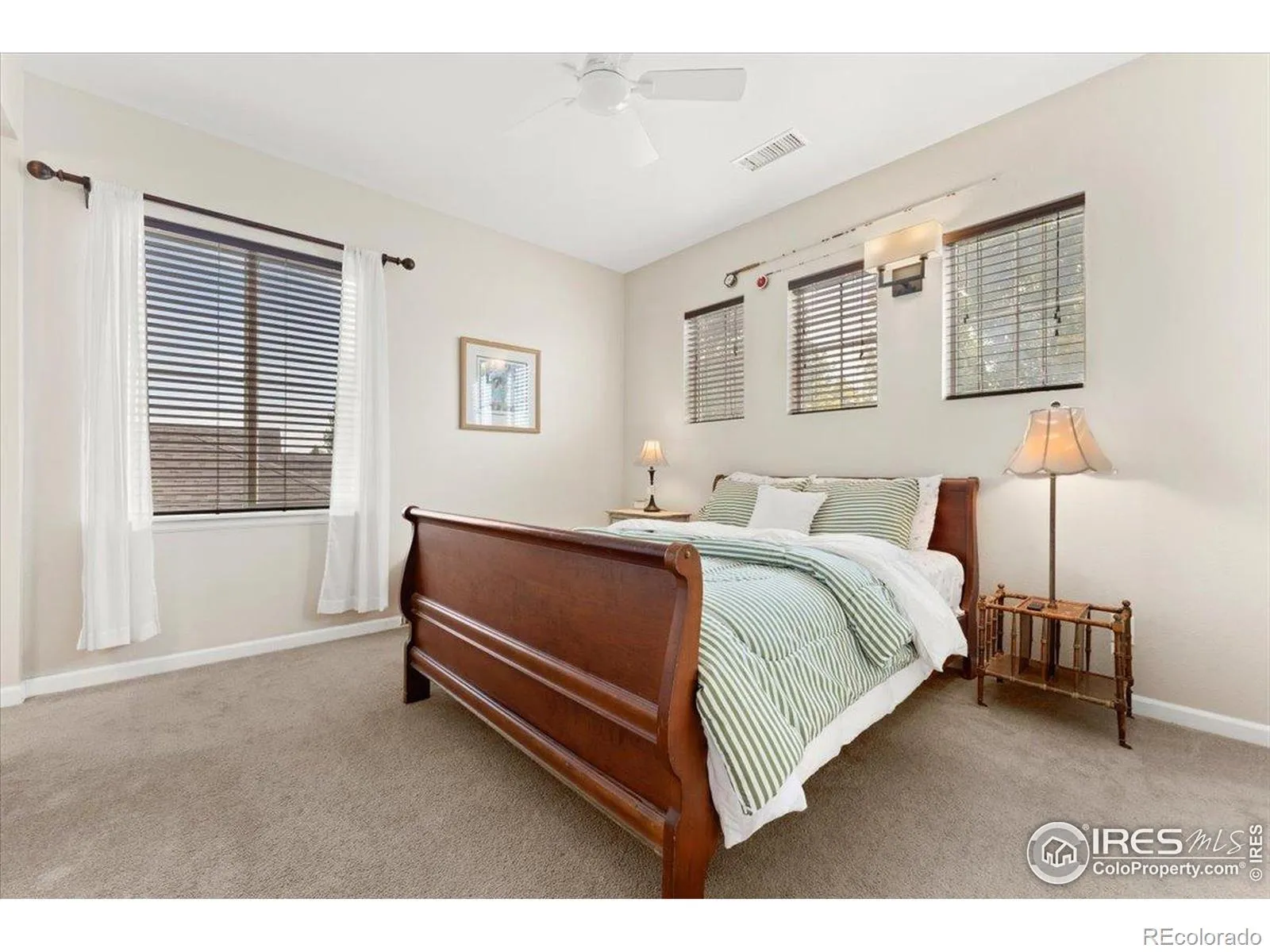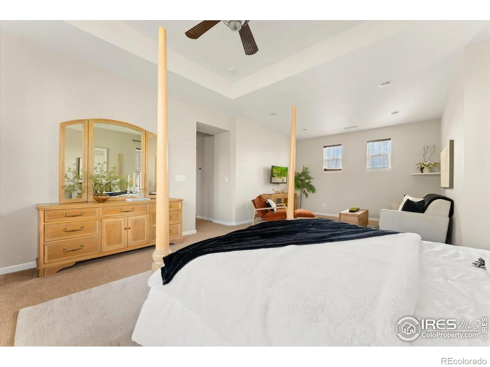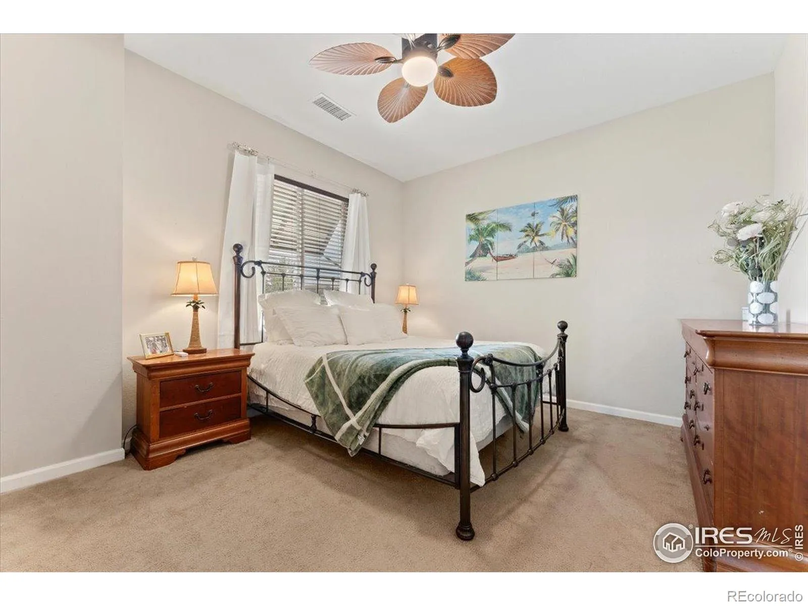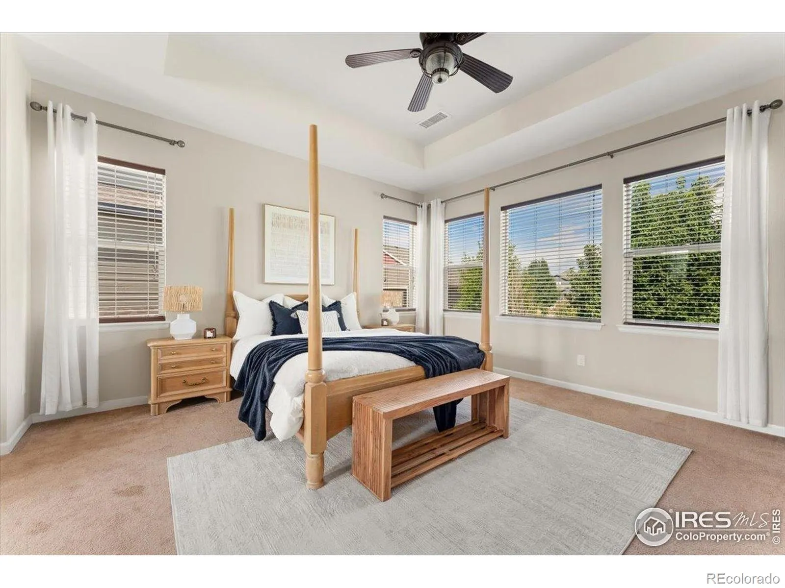 Step inside to discover a spacious, light-filled layout featuring an inviting living room centered around a modern gas fireplace with stone surround and a white wood mantel. The gourmet kitchen is a chef’s dream with granite countertops, 42″ cabinets, double ovens, gas cooktop with vent hood, full tile backsplash, and a brand-new Samsung refrigerator. A main-floor bedroom and adjacent 3/4 bath offer the perfect setup for guests or a home office. Upstairs, retreat to the expansive primary suite with coffered ceilings, a luxurious 4-piece bath, and large walk-in closet. Each additional bedroom offers its own bath access, ensuring comfort and privacy for everyone. The outdoor living space is truly a private backyard oasis-complete with a covered patio, maintenance-free Trex deck, relaxing hot tub, stone patio, and low-maintenance landscaping surrounded by colorful blooms. Enjoy all the perks of the Lakes at Centerra lifestyle, featuring two scenic lakes, miles of walking trails, and opportunities for kayaking and canoeing right in your neighborhood. Conveniently located near shopping, dining, and I-25, this home offers both serenity and accessibility. Bonus: This home offers includes a VA assumable loan!