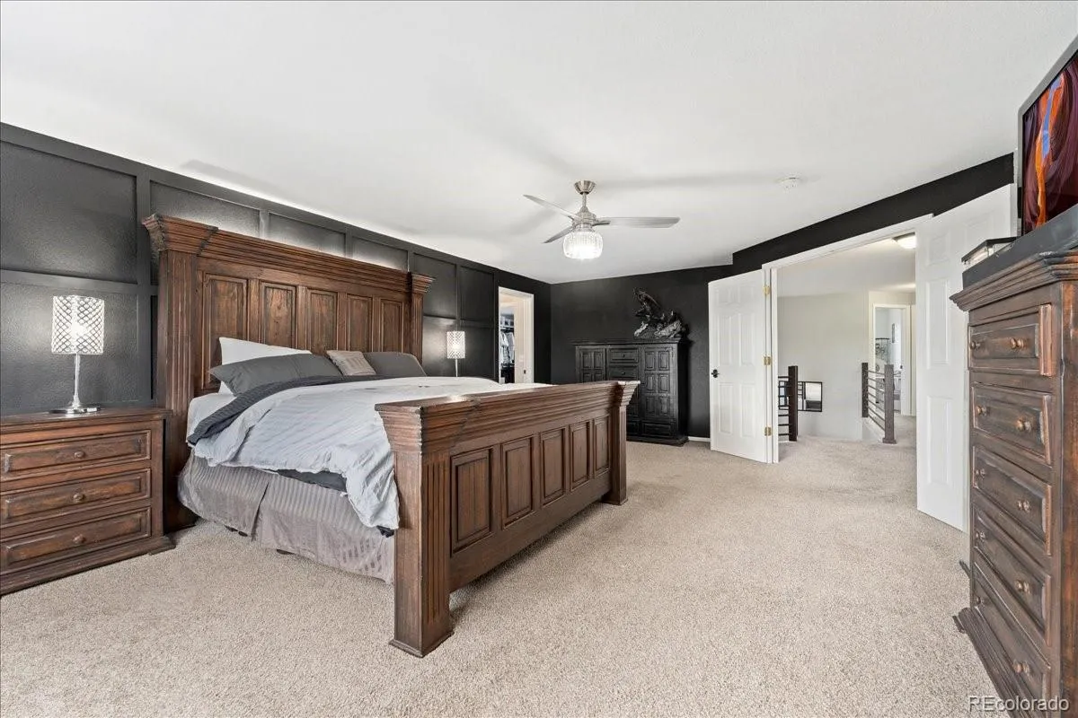 Upstairs, the primary suite is a true retreat and one of the highlights of the home. The bedroom itself is spacious, offering mountain views and plenty of room to relax. The massive walk-in closet, complete with its own washer and dryer, makes organization effortless—the perfect place to unwind and hang up your cape after a long day. The luxurious five-piece bath features dual vanities, a soaking tub, a separate shower, and elegant finishes that create a spa-like experience. Four additional bedrooms and a full bath round out the upper level.