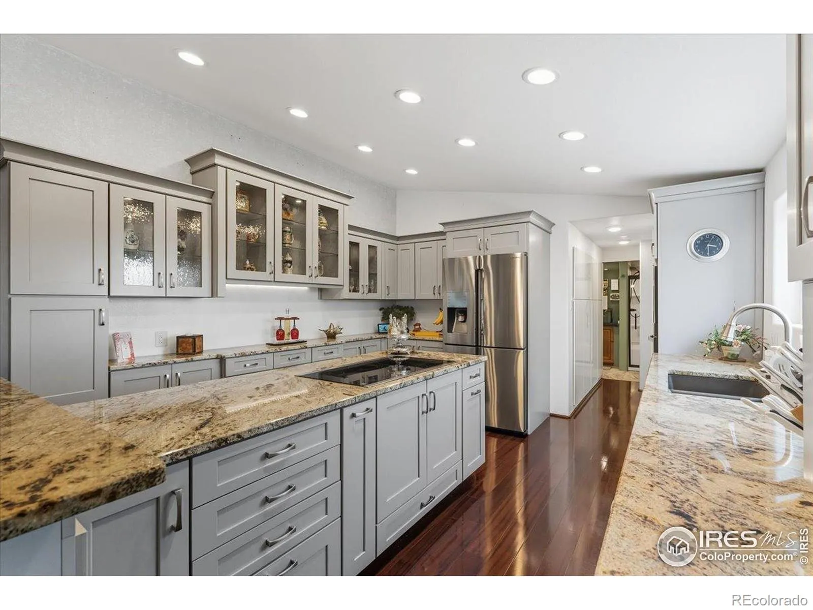Experience the rare combination of sweeping mountain views and in-town convenience with this one-of-a-kind property, just 10 minutes from Downtown Fort Collins and around the corner from the new Glade Reservoir. Parking and storage are abundant: an oversized attached 3-car garage, detached 2-car garage, carport, and an impressive 3000 sq ft detached PARADISE shop with huge 400 sq ft attached tool room. The income potential is unmatched! Shop sits on a slab poured with over 6″ of reinforced concrete-strong enough to support 5 charter buses, & includes full electricity. This property has 200 amp electrical service & the shop alone has 125 amp. Perfect for business use, heavy equipment, or serious hobbyists. 50/30 amp RV plugs, and 220 plug for air compressor. Full RV site complete with water, sewer & electric. Set on a spacious lot with mature landscaping and a tranquil pond, the outdoor spaces are designed for both beauty and functionality. The home is built to last, featuring a durable steel roof and updated windows. Inside, the main level shines with LifeProof luxury flooring-stylish, durable, and low maintenance. Easy rise stairs for maximum accessibility. The remodeled kitchen features custom cabinetry w/ pull-out shelves, abundant pantry space, appliance garage, granite countertops, five-burner inset cooktop on island, and above-cabinet lighting. It flows into a bright living room with framed mountain views and a built-in water feature. The primary suite offers a west-facing picture window, walk-in closet, and custom built-ins. The terrace-level basement is ideal for multi-gen living with separate, private entrance, courtyard, pellet stove, wet bar, 2 bedrooms, laundry hook ups and full bath. Enjoy covered patio(s), a dog run, and 2 fenced yards perfect for play, gardening, or relaxing. Smart features like sprinkler timers & smart plug waterfall add ease to everyday life. A rare opportunity! Please reference additional property remarks document in MLS.