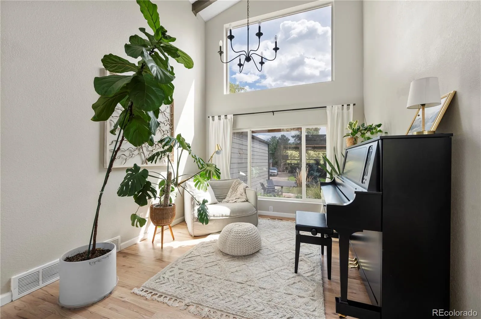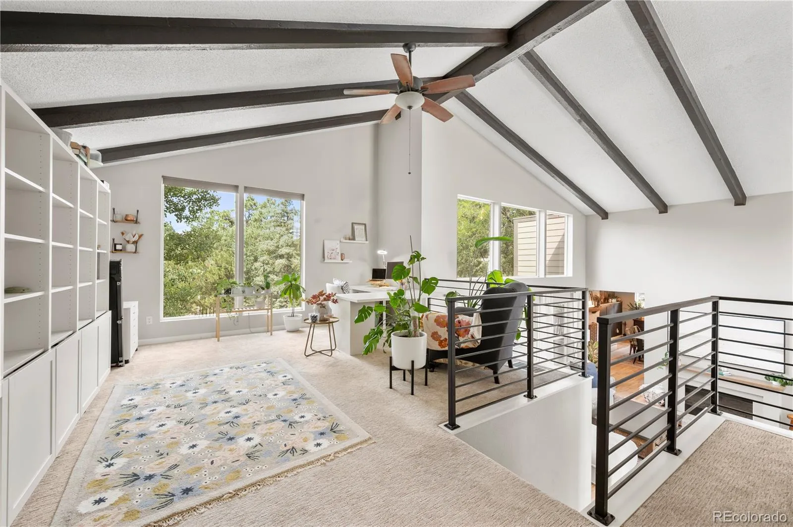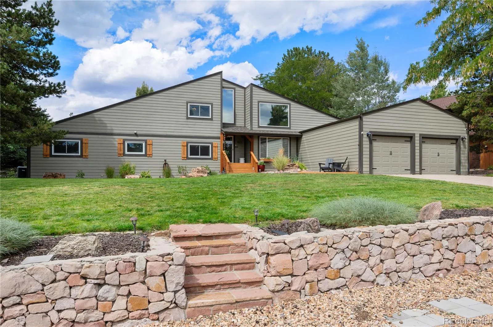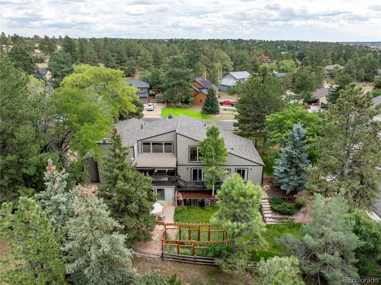This home in The Pinery stands out with striking expressionist architecture, defined by its angular exterior and expansive windows that invite the outdoors in. Wildlife is part of the experience here, with deer often wandering through the property. Step inside to a vaulted living room where exposed beams and soaring ceilings create an impressive first impression. A new electric fireplace and walls of glass make it a wonderful place to hang out with family or friends. The main level features refinished hardwood floors and an updated kitchen with quartz countertops, a Café refrigerator and dishwasher, and a bar fridge. A wood-burning fireplace brings warmth to the dining room with access to the upper covered deck. The laundry room, mud room and a half-bath as conveniently located as you enter the home from the garage. Upstairs, a loft area offers space for an office or guest room along with a half bath with custom iron railings. The lower level is home to a generous primary suite with a walk-in closet of your dreams, along with a five-piece ensuite that includes a soaking tub and a large enclosed shower. Two additional light and bright bedrooms on this level share a bathroom with a dual vanity. The finished basement adds even more possibilities with a bedroom and ensuite bath, a flexible room that can serve as a theater or craft space, and a large recreation room with a bar. A sunroom extends off the walk-out basement and creates an ideal setting for plant collections. Outside, raised garden beds are fully fenced to protect your veggies from wildlife, a hot tub invites year-round relaxation, and multiple decks connect the living spaces to the outdoors. The primary has a sliding glass door with access to the lower deck, creating an indoor-outdoor connection. Class IV impact resistant roof was installed in 2023. Set on a third of an acre, this property offers an uncommon combination of architectural character, thoughtful updates, and a natural setting within The Pinery.