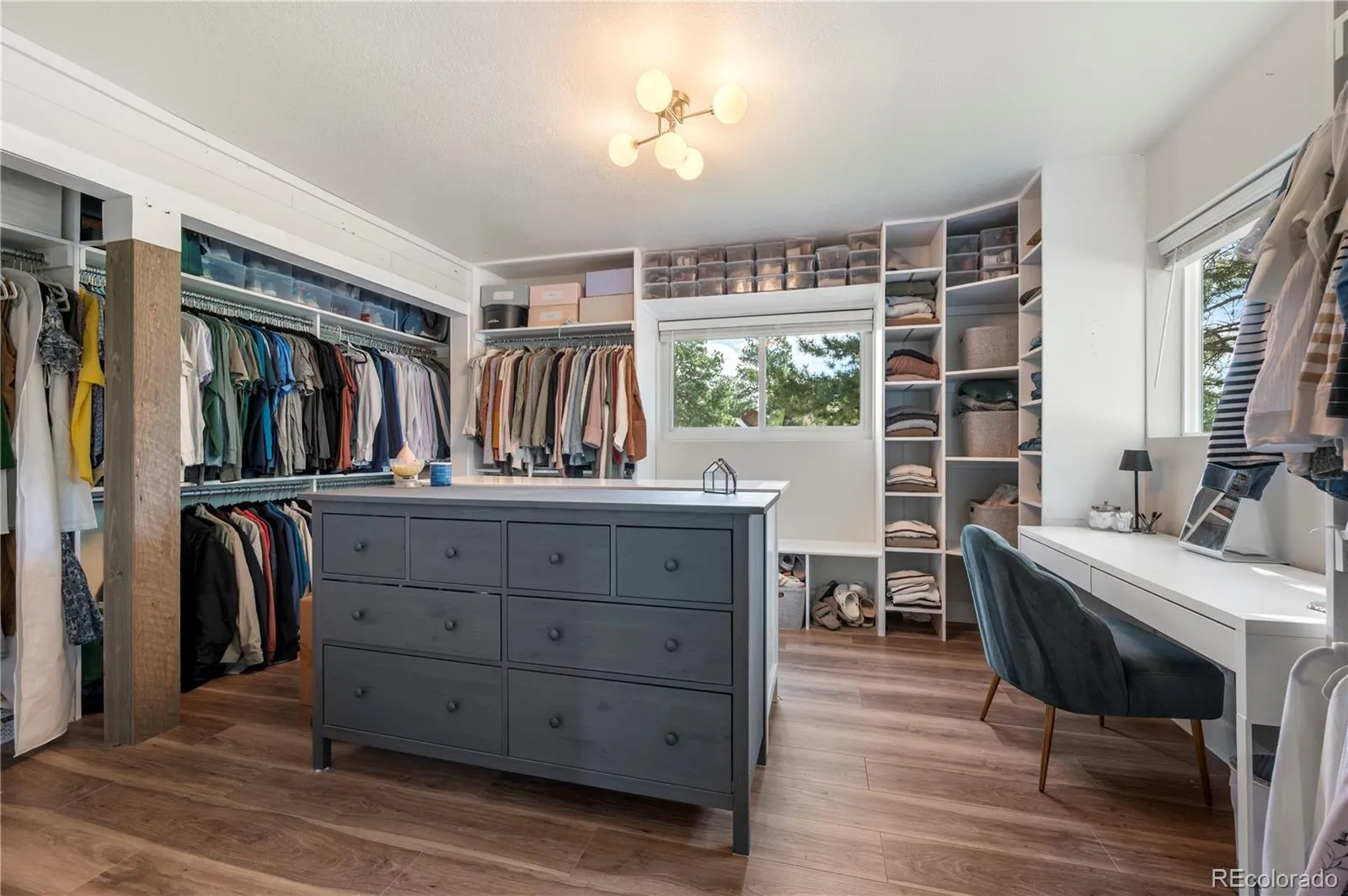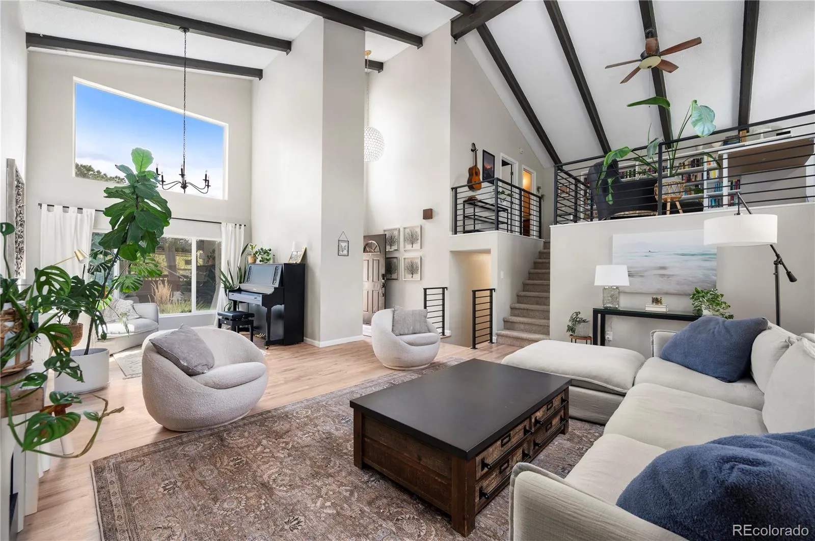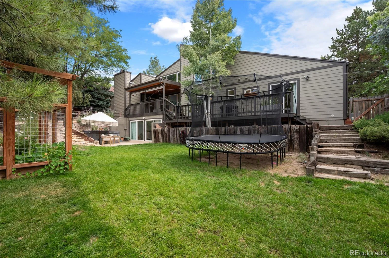 This home in The Pinery stands out with striking expressionist architecture, defined by its angular exterior and expansive windows that invite the outdoors in. Wildlife is part of the experience here, with deer often wandering through the property. Step inside to a vaulted living room where exposed beams and soaring ceilings create an impressive first impression. A new electric fireplace and walls of glass make it a wonderful place to hang out with family or friends. The main level features refinished hardwood floors and an updated kitchen with quartz countertops, a Café refrigerator and dishwasher, and a bar fridge. A wood-burning fireplace brings warmth to the dining room with access to the upper covered deck. The laundry room, mud room and a half-bath as conveniently located as you enter the home from the garage. Upstairs, a loft area offers space for an office or guest room along with a half bath with custom iron railings. The lower level is home to a generous primary suite with a walk-in closet of your dreams, along with a five-piece ensuite that includes a soaking tub and a large enclosed shower. Two additional light and bright bedrooms on this level share a bathroom with a dual vanity. The finished basement adds even more possibilities with a bedroom and ensuite bath, a flexible room that can serve as a theater or craft space, and a large recreation room with a bar. A sunroom extends off the walk-out basement and creates an ideal setting for plant collections. Outside, raised garden beds are fully fenced to protect your veggies from wildlife, a hot tub invites year-round relaxation, and multiple decks connect the living spaces to the outdoors. The primary has a sliding glass door with access to the lower deck, creating an indoor-outdoor connection. Class IV impact resistant roof was installed in 2023. Set on a third of an acre, this property offers an uncommon combination of architectural character, thoughtful updates, and a natural setting within The Pinery.