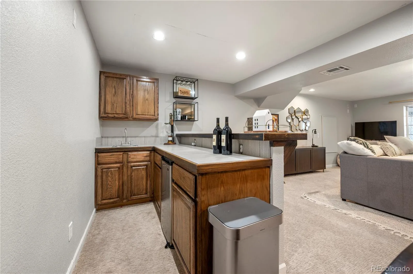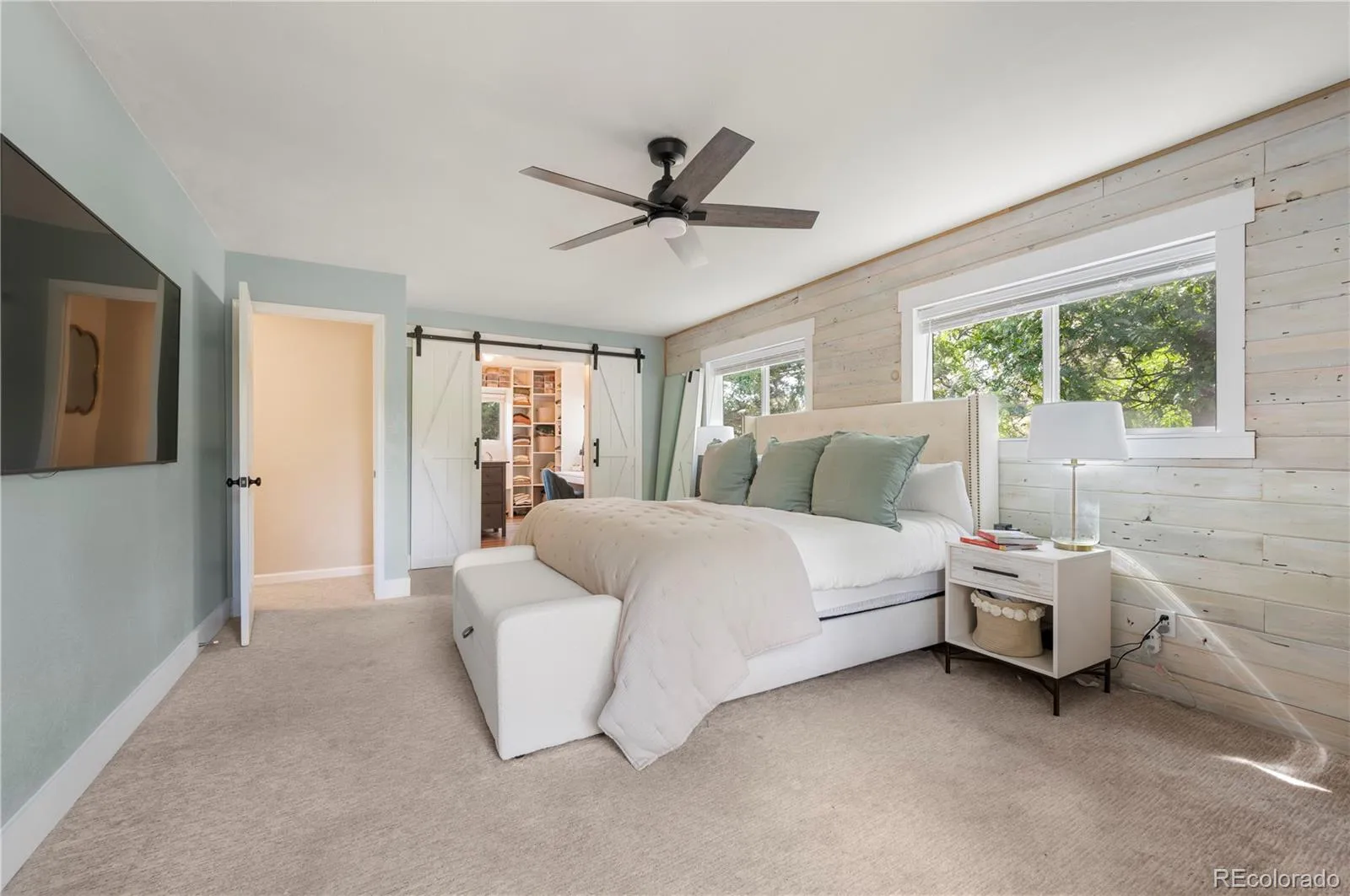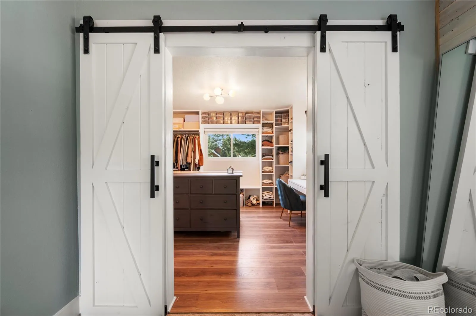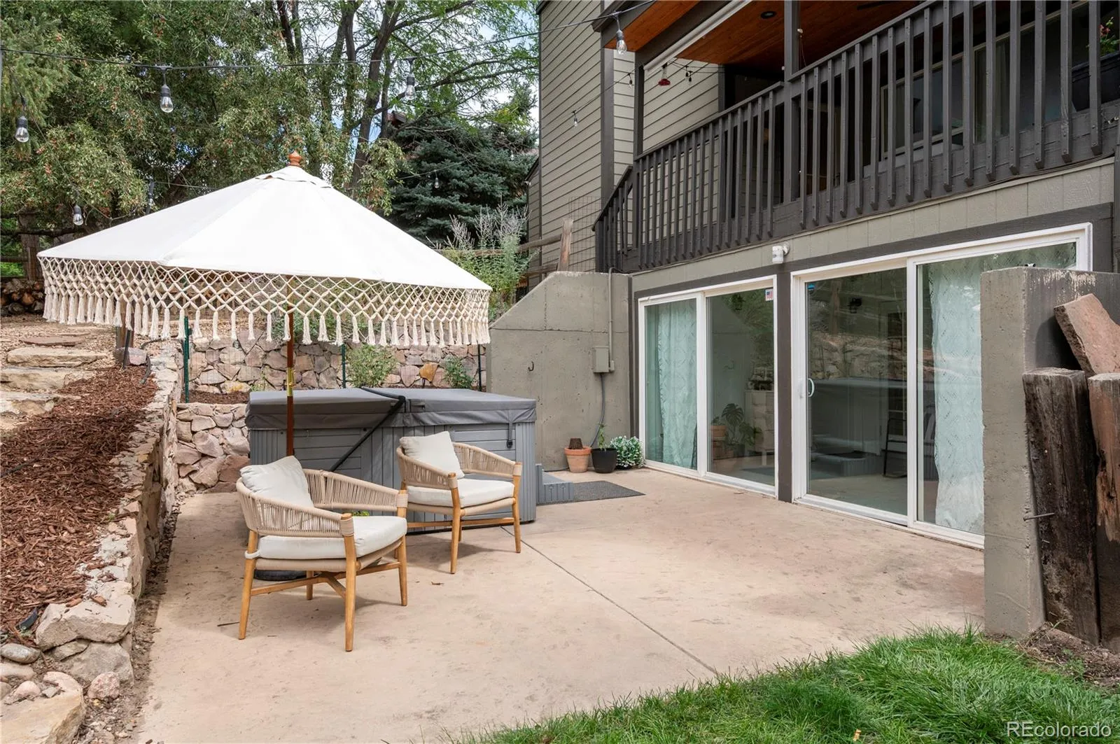 This home in The Pinery stands out with striking expressionist architecture, defined by its angular exterior and expansive windows that invite the outdoors in. Wildlife is part of the experience here, with deer often wandering through the property. Step inside to a vaulted living room where exposed beams and soaring ceilings create an impressive first impression. A new electric fireplace and walls of glass make it a wonderful place to hang out with family or friends. The main level features refinished hardwood floors and an updated kitchen with quartz countertops, a Café refrigerator and dishwasher, and a bar fridge. A wood-burning fireplace brings warmth to the dining room with access to the upper covered deck. The laundry room, mud room and a half-bath as conveniently located as you enter the home from the garage. Upstairs, a loft area offers space for an office or guest room along with a half bath with custom iron railings. The lower level is home to a generous primary suite with a walk-in closet of your dreams, along with a five-piece ensuite that includes a soaking tub and a large enclosed shower. Two additional light and bright bedrooms on this level share a bathroom with a dual vanity. The finished basement adds even more possibilities with a bedroom and ensuite bath, a flexible room that can serve as a theater or craft space, and a large recreation room with a bar. A sunroom extends off the walk-out basement and creates an ideal setting for plant collections. Outside, raised garden beds are fully fenced to protect your veggies from wildlife, a hot tub invites year-round relaxation, and multiple decks connect the living spaces to the outdoors. The primary has a sliding glass door with access to the lower deck, creating an indoor-outdoor connection. Class IV impact resistant roof was installed in 2023. Set on a third of an acre, this property offers an uncommon combination of architectural character, thoughtful updates, and a natural setting within The Pinery.