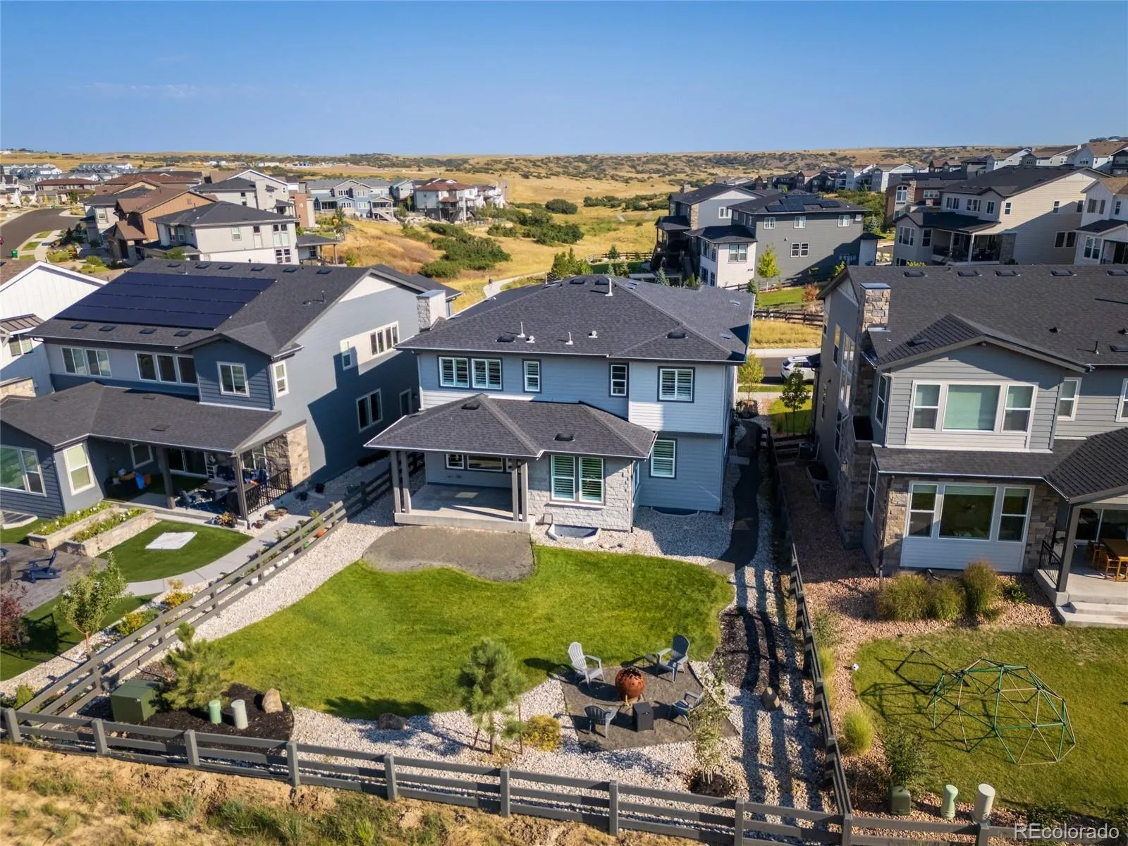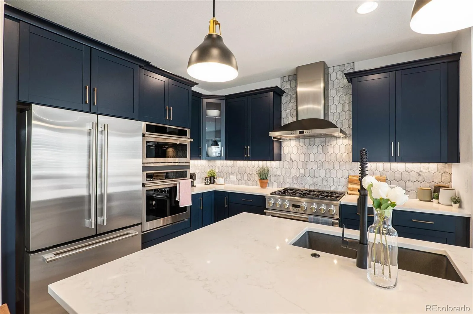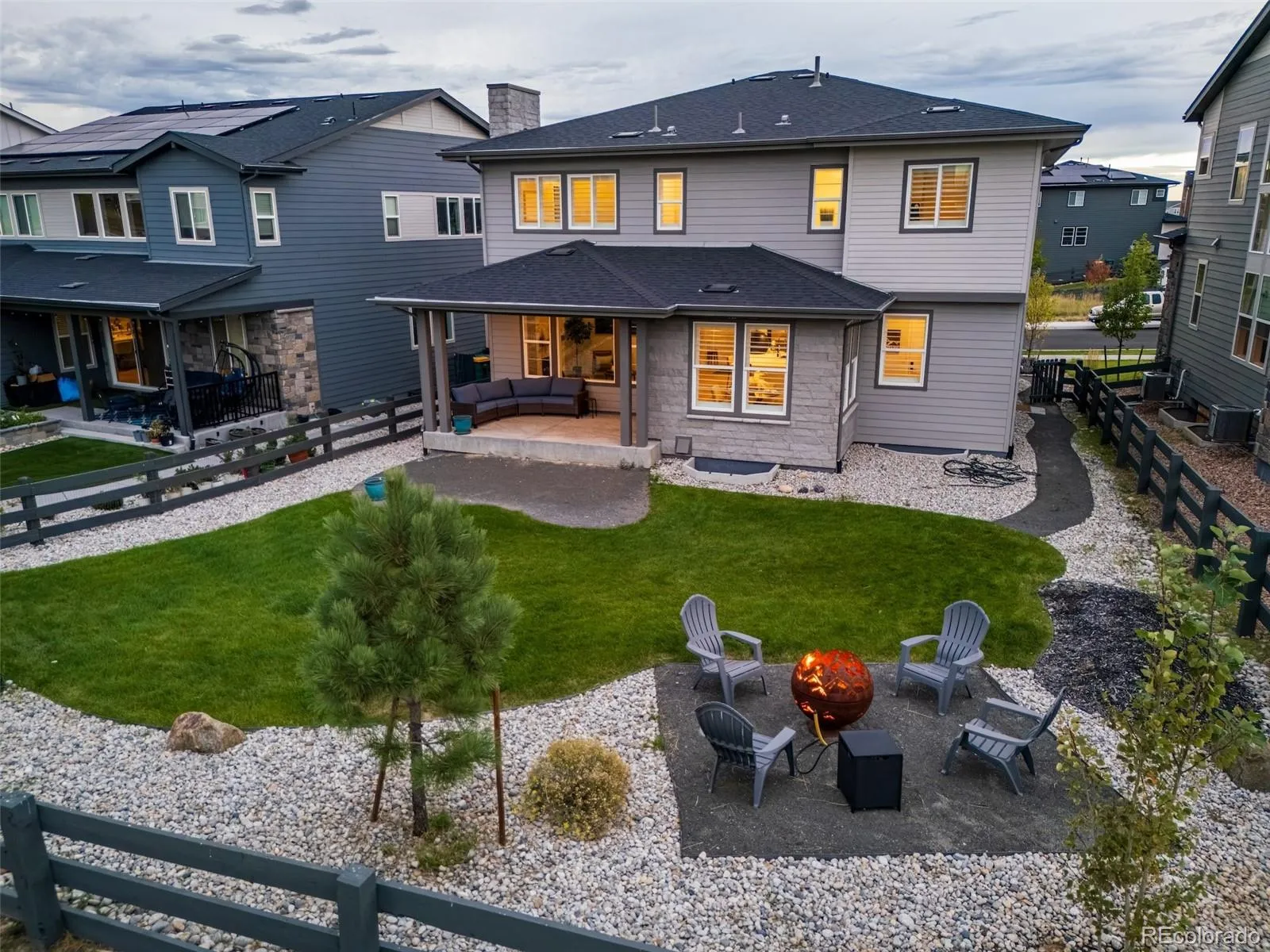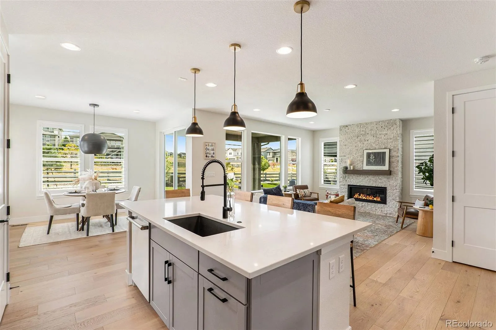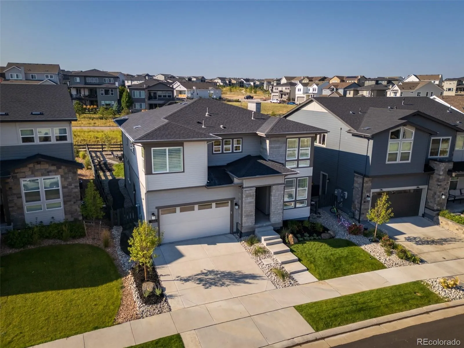 Step inside and you’ll immediately notice the difference: 9” wide plank hardwood floors throughout the whole home, soaring 9’ ceilings with 8’ solid-core doors, and tons of natural light streaming through over 40 windows. The gourmet kitchen is designed for everyday joy and serious entertaining alike, with three ovens, quartz counters, top-end appliances, and an oversized island. A floor-to-ceiling quartz fireplace anchors the great room, venting warmth throughout the space on crisp Colorado evenings.