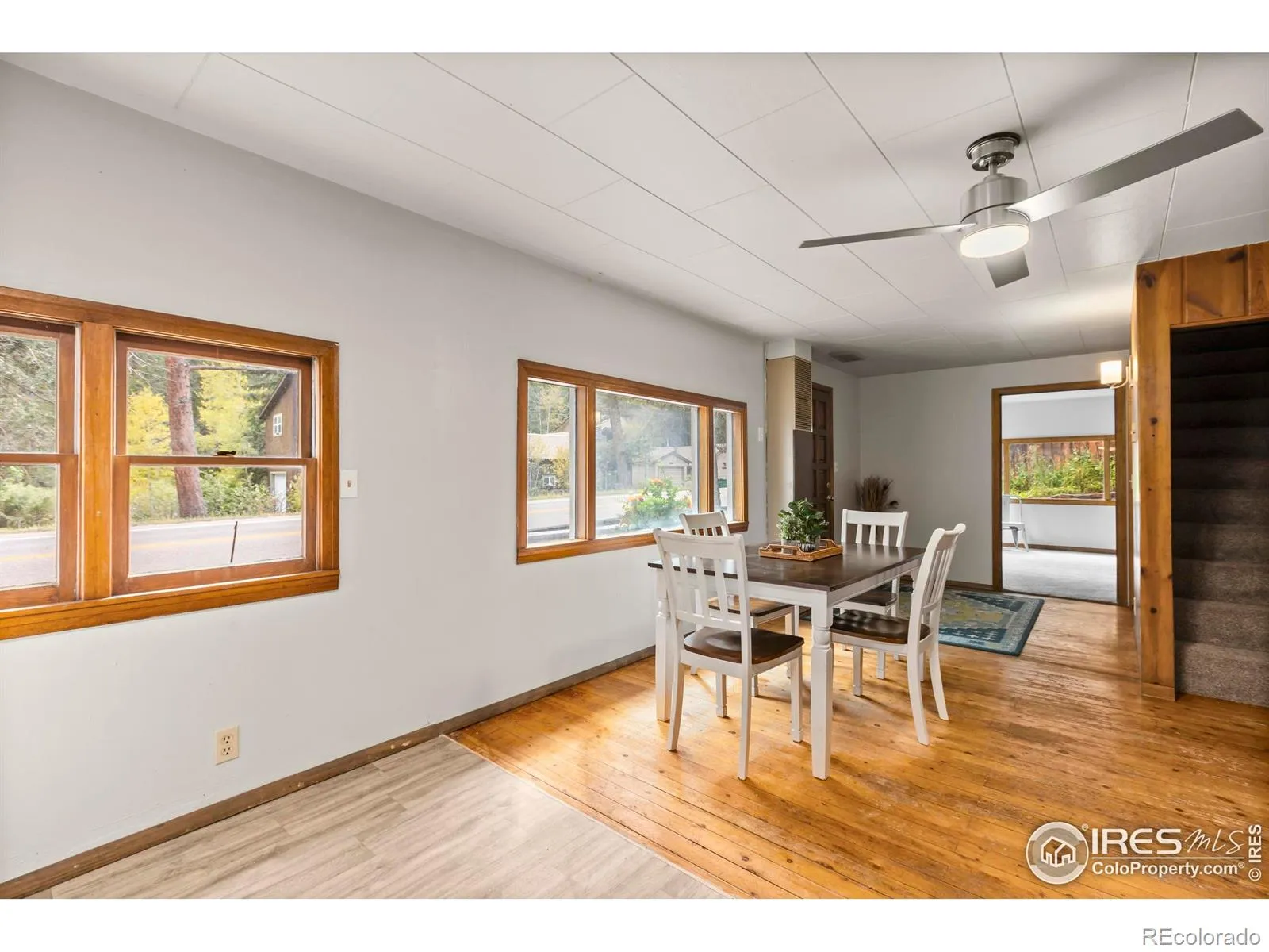 Discover this charming mountain cabin steps from world class fishing and minutes to Estes Park. This cozy 1415 SF cabin features a massive 1,500 SF detached shop, providing ample space for storage or hobbies. Recent updates include new appliances, roof, bath, paint, and carpet. Enjoy the warmth of vintage knotty pine paneling accents along with a cozy wood burning fireplace in the inviting living room. Don’t miss your chance to own this mountain paradise!