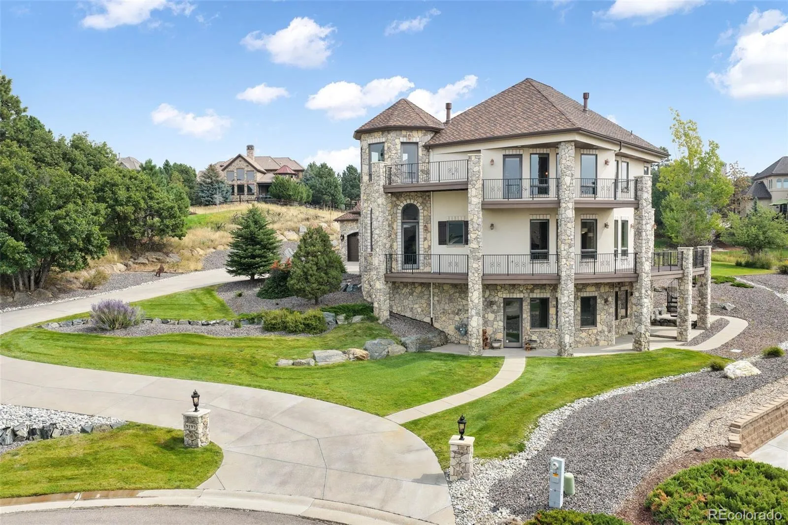 This stunning 7,828 sq. ft. custom home sits privately at the end of a cul-de-sac on a .58-acre lot, offering four bedrooms, six bathrooms, and a three-car garage. Its stone and stucco exterior, multiple decks, and striking architecture create incredible curb appeal. A grand covered stone entry and custom wood door welcome you inside.