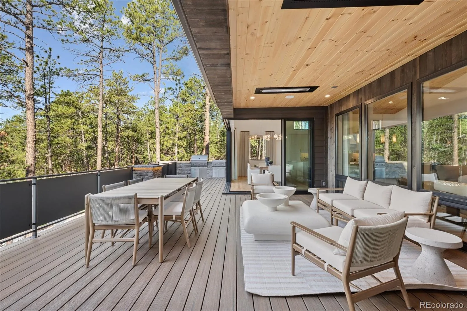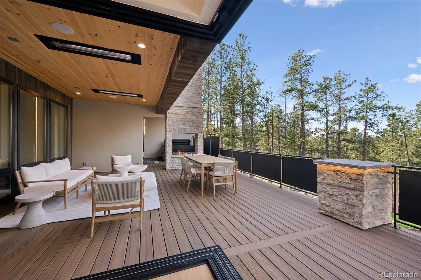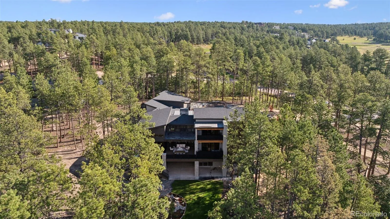 This exquisite custom home blends modern elegance with timeless warm organic design, offering a spacious and functional open layout that seamlessly integrates style and comfort. The heart of the home features a large, chef-inspired kitchen while the lower level features a sleek wet bar with a climate-controlled wine room, perfect for entertaining. A dedicated fitness room with a infrared sauna adds a touch of wellness, while a three-stop elevator provides effortless access to every floor. The sky loft, with its covered deck, offers breathtaking views of the Air Force Academy and Pikes Peak and a serene escape for stargazing. The five bedrooms and four full and two half baths provide ample space for family and guests. Corner patio doors open to the outside into the outdoor BBQ area, blurring the lines between indoor and outdoor living, making the most of Colorado’s natural beauty. Custom detailing throughout elevates every corner of this home, creating a TIMELESS luxurious and functional living space designed for both relaxation and entertainment. The foyer’s striking 60” see-through fireplace, encased by four sides of marble tile, immediately sets the tone for the home, while framing the stunning Pikes Peak and mountain views beyond. As you step further inside, a seamless blend of transitional and modern luxury defines the space. Subtle nods to midcentury modern can be found, especially in wood wall and ceiling features, introducing textures that balance beautifully with the clean lines and smooth surfaces. Mixed metals from polished nickel to soft golds, unique tile details, and carefully selected lighting elevate every room. The custom landscaping WOW!