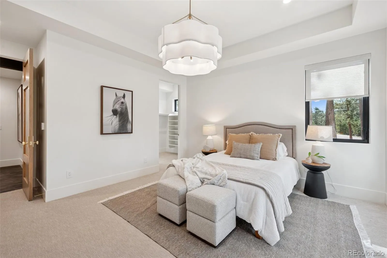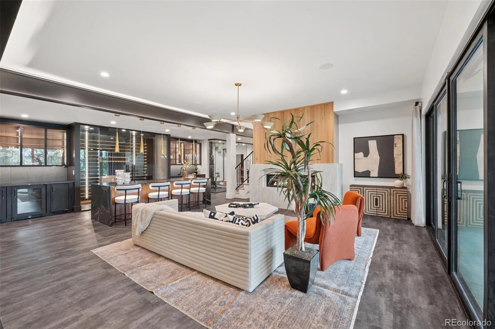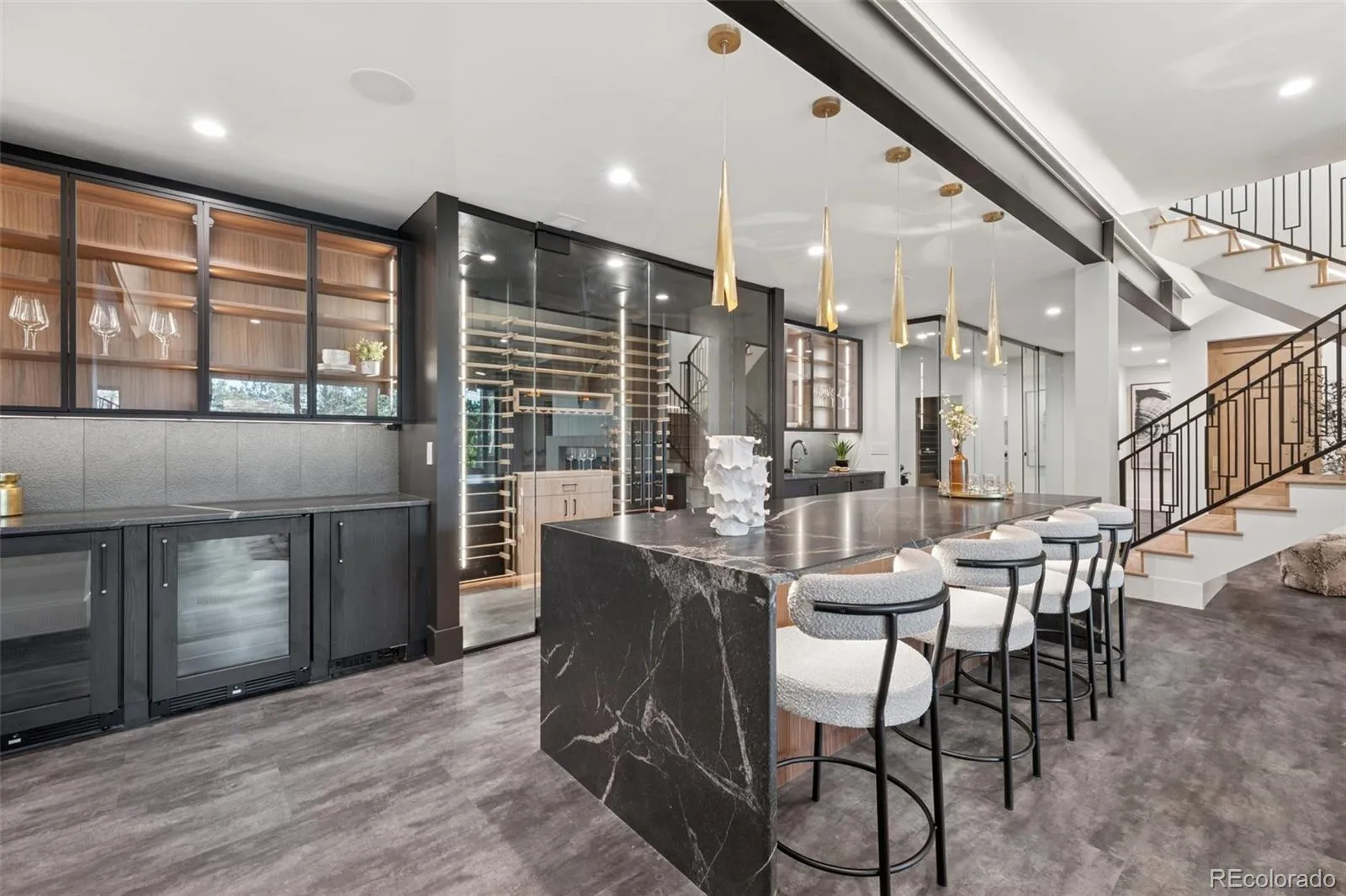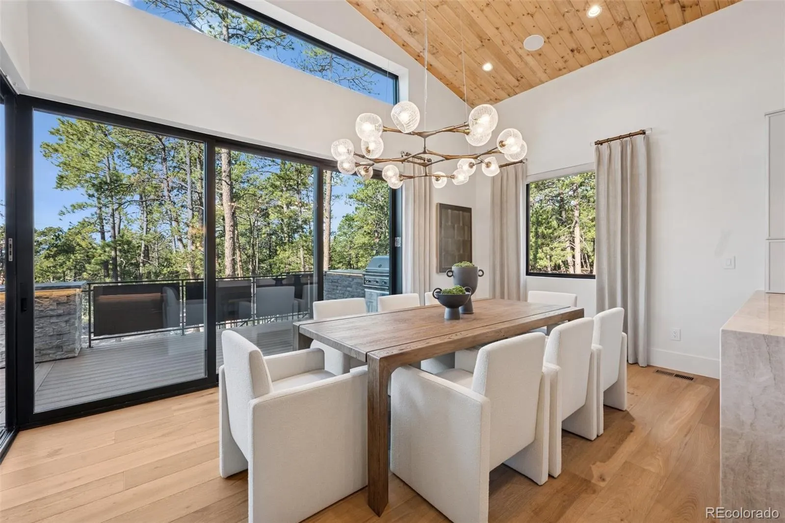 This exquisite custom home blends modern elegance with timeless warm organic design, offering a spacious and functional open layout that seamlessly integrates style and comfort. The heart of the home features a large, chef-inspired kitchen while the lower level features a sleek wet bar with a climate-controlled wine room, perfect for entertaining. A dedicated fitness room with a infrared sauna adds a touch of wellness, while a three-stop elevator provides effortless access to every floor. The sky loft, with its covered deck, offers breathtaking views of the Air Force Academy and Pikes Peak and a serene escape for stargazing. The five bedrooms and four full and two half baths provide ample space for family and guests. Corner patio doors open to the outside into the outdoor BBQ area, blurring the lines between indoor and outdoor living, making the most of Colorado’s natural beauty. Custom detailing throughout elevates every corner of this home, creating a TIMELESS luxurious and functional living space designed for both relaxation and entertainment. The foyer’s striking 60” see-through fireplace, encased by four sides of marble tile, immediately sets the tone for the home, while framing the stunning Pikes Peak and mountain views beyond. As you step further inside, a seamless blend of transitional and modern luxury defines the space. Subtle nods to midcentury modern can be found, especially in wood wall and ceiling features, introducing textures that balance beautifully with the clean lines and smooth surfaces. Mixed metals from polished nickel to soft golds, unique tile details, and carefully selected lighting elevate every room. The custom landscaping WOW!