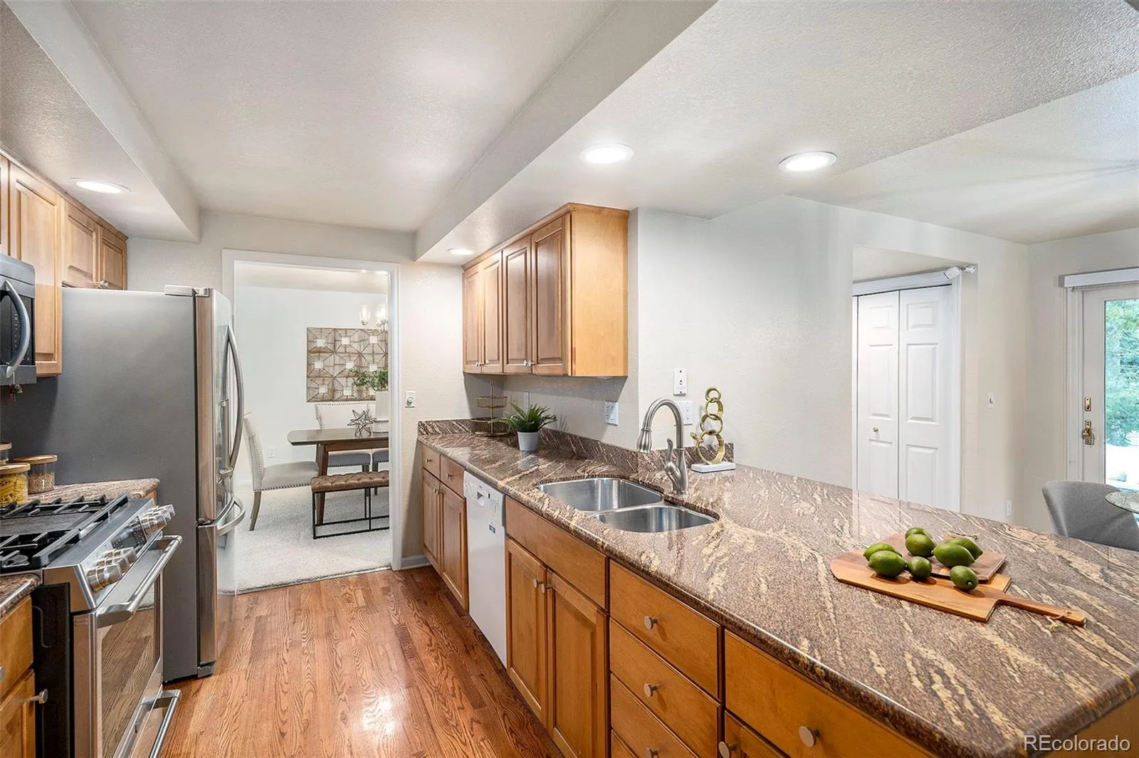 Welcome to this beautiful, immaculately maintained home in the highly sought-after DTC area. Located in award-winning Cherry Creek School District, a short walk to Heritage Elementary, this spacious residence offers exceptional value and space. The largest model in Heritage Place, boasting over 3,614 finished sq ft across four levels. Recent updates include fresh interior paint, new carpet, modern hardware, updated light fixtures. 5 bedrooms, 5 bathrooms, a finished basement, and an oversized two-car garage. Vaulted ceilings, a spacious living room and dining room, and an updated kitchen with granite countertops, maple cabinets with pull-outs, pantry, breakfast nook, and easy access to a large, covered stamped concrete patio—perfect for entertaining. The expansive lower-level family room is filled with natural light and features walk-out access to a second patio and a gorgeous backyard with mature trees. Custom wet bar with fridge, a stone direct vent gas fireplace, a guest suite/office with adjacent ¾ bath. Upstairs, the primary suite has a private, en-suite ¾ bath with heated floors, Toto bidet, and private balcony with mountain views. Bedrooms 2 and 3 have hardwood floors and share an updated full bathroom. The daylight basement has a media/rec room with custom-built media center, a bedroom with egress window and ample closets, and a convenient laundry room/half bath. Energy-efficient double-pane windows, lightweight tile roof, newer fencing, and a Rachio Smart sprinkler system. The home is ideally situated with a SW-facing driveway that gets sun in winter. Heritage Place is a master-planned community, featuring large lots, over 12 acres of greenbelts, lighted walking paths. Enjoy unbeatable access to DTC, light rail, AirPort Express, shopping, dining, outdoor recreation, all just minutes away. Great price, compare to recent neighborhood sales: 6389 S Monaco Ct (6/2, $1,000,000); 6488 S Heritage Pl E (7/18, $1,120,000); 7055 E Heritage Pl S (8/13, $989,000).