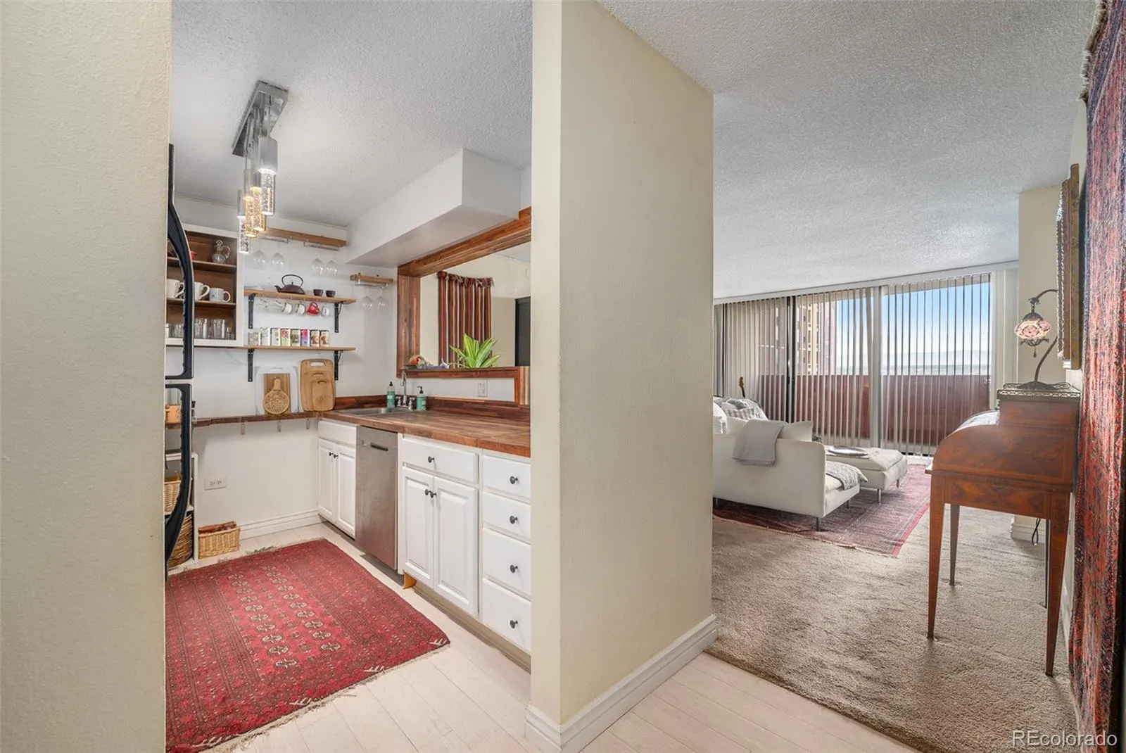 Step through your private entryway into a spacious, open-concept living area that flows beautifully into a well-appointed kitchen. With butcher block countertops, stainless steel appliances, tile flooring, and updated cabinetry, this kitchen isn’t just for show—it’s fully ready for everything from Sunday meal prep to spontaneous dinner parties. Modern lighting adds the perfect finishing touch.