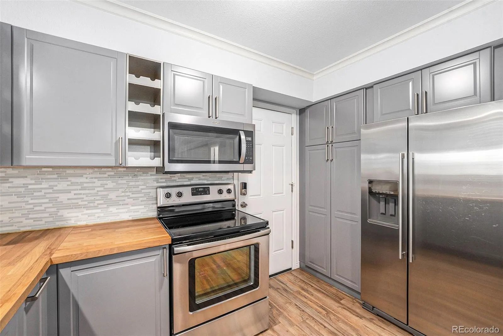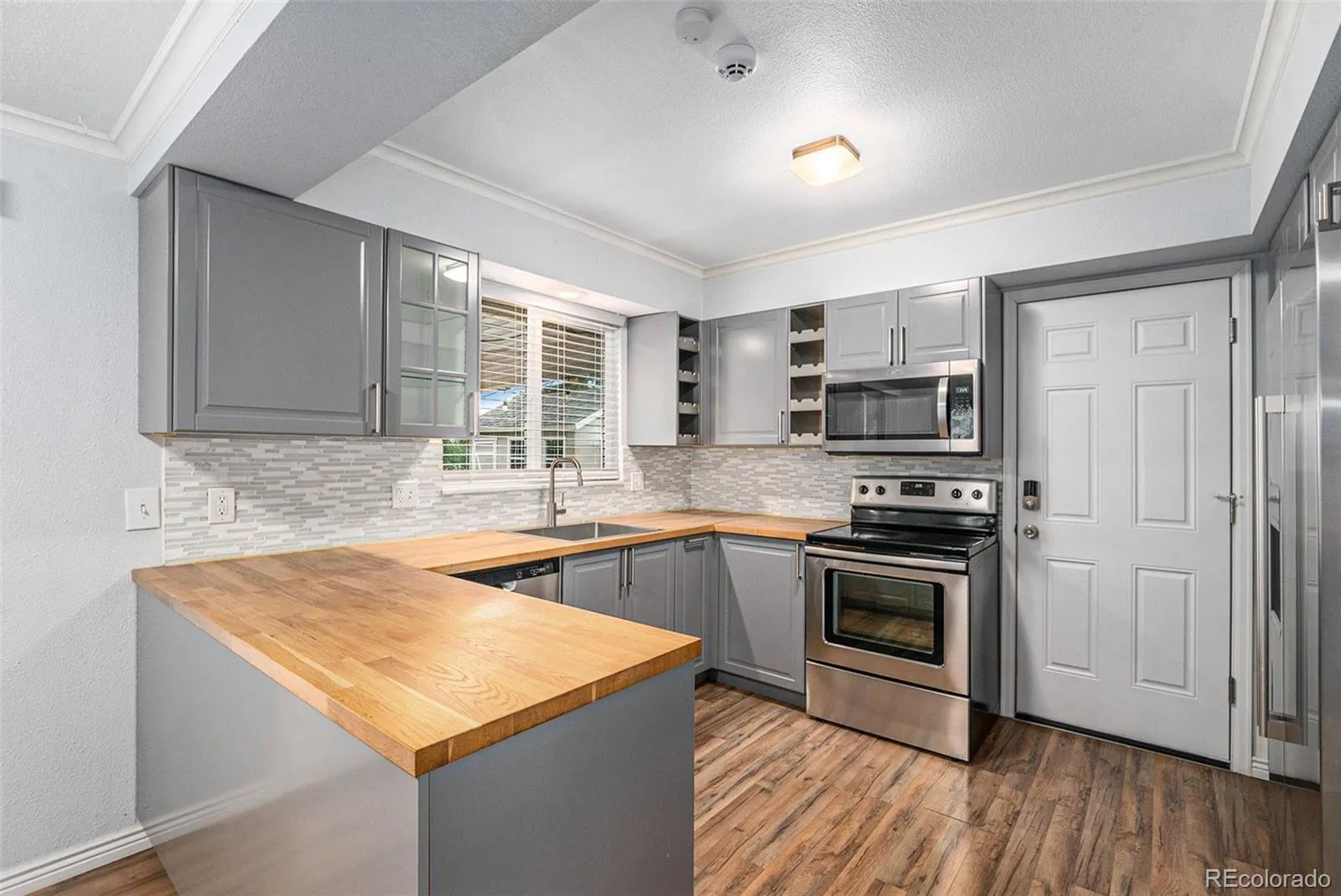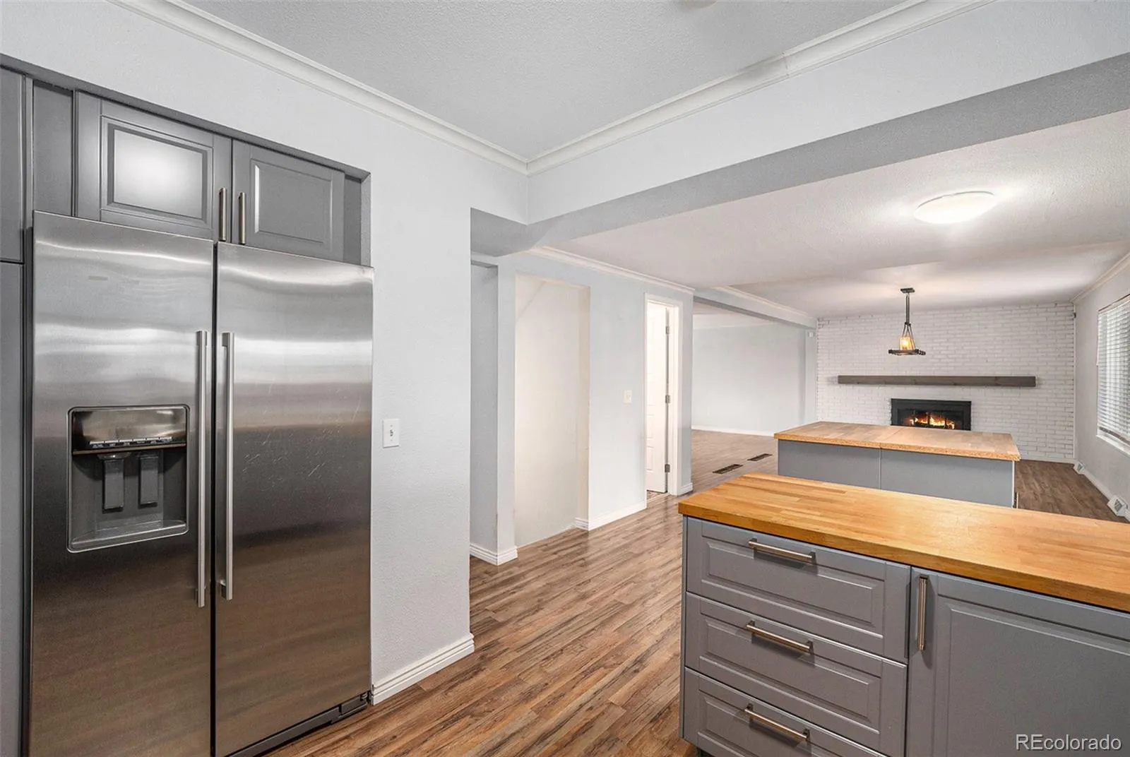 Step inside to an airy, open-concept main level filled with natural light, warm wood-style floors, and a cozy wood-burning fireplace. The remodeled kitchen shines with gray cabinetry, butcher block counters, stainless steel appliances, and a versatile rolling island — perfect for cooking, entertaining, or homework time.
