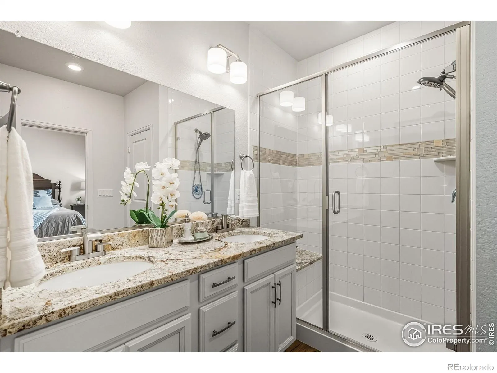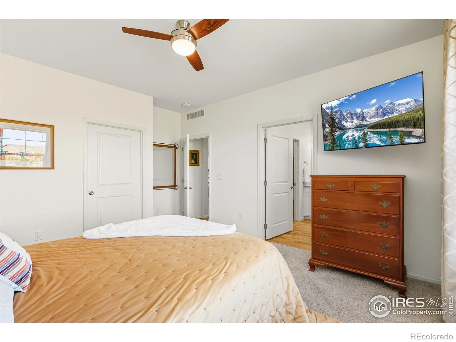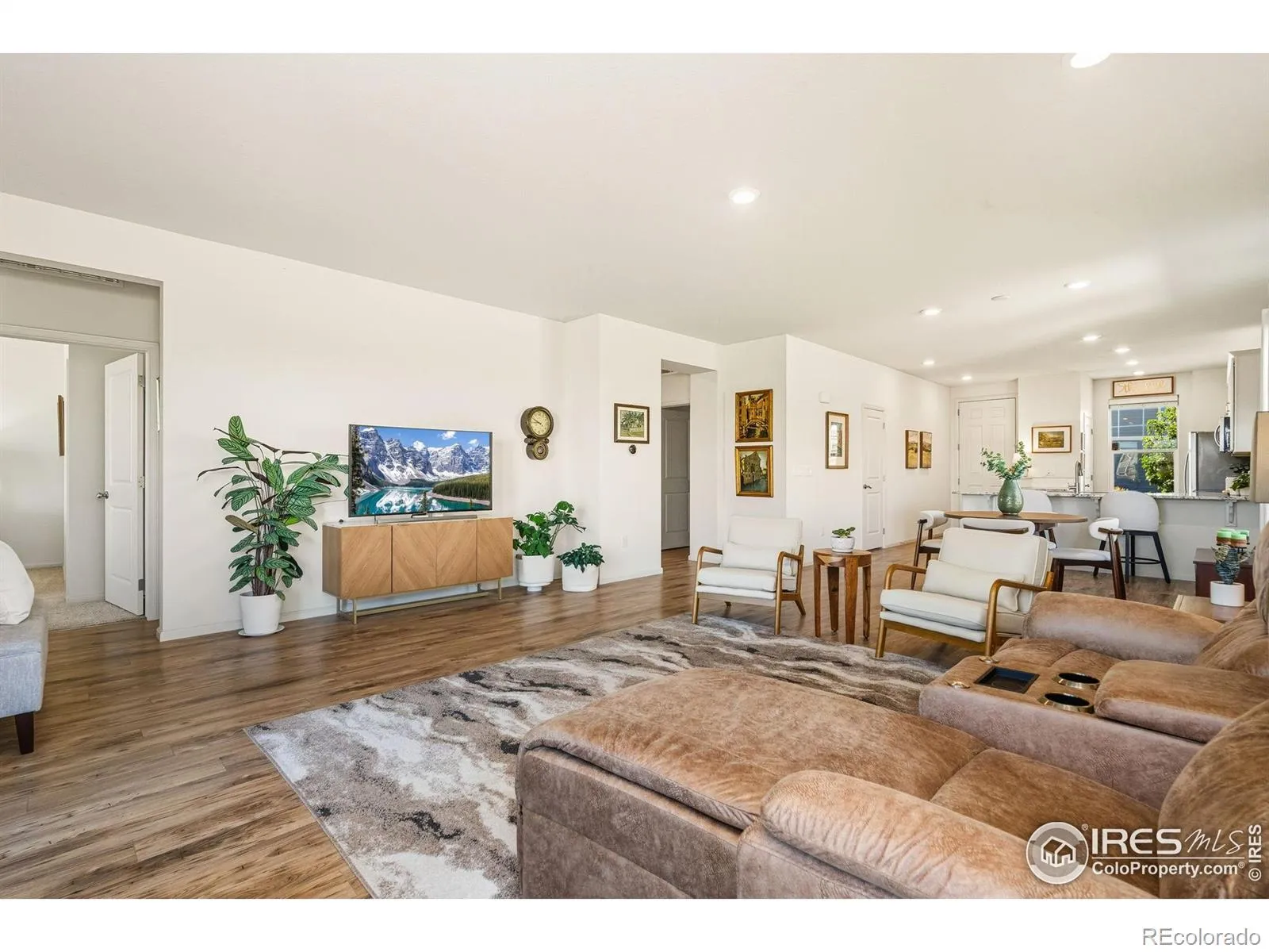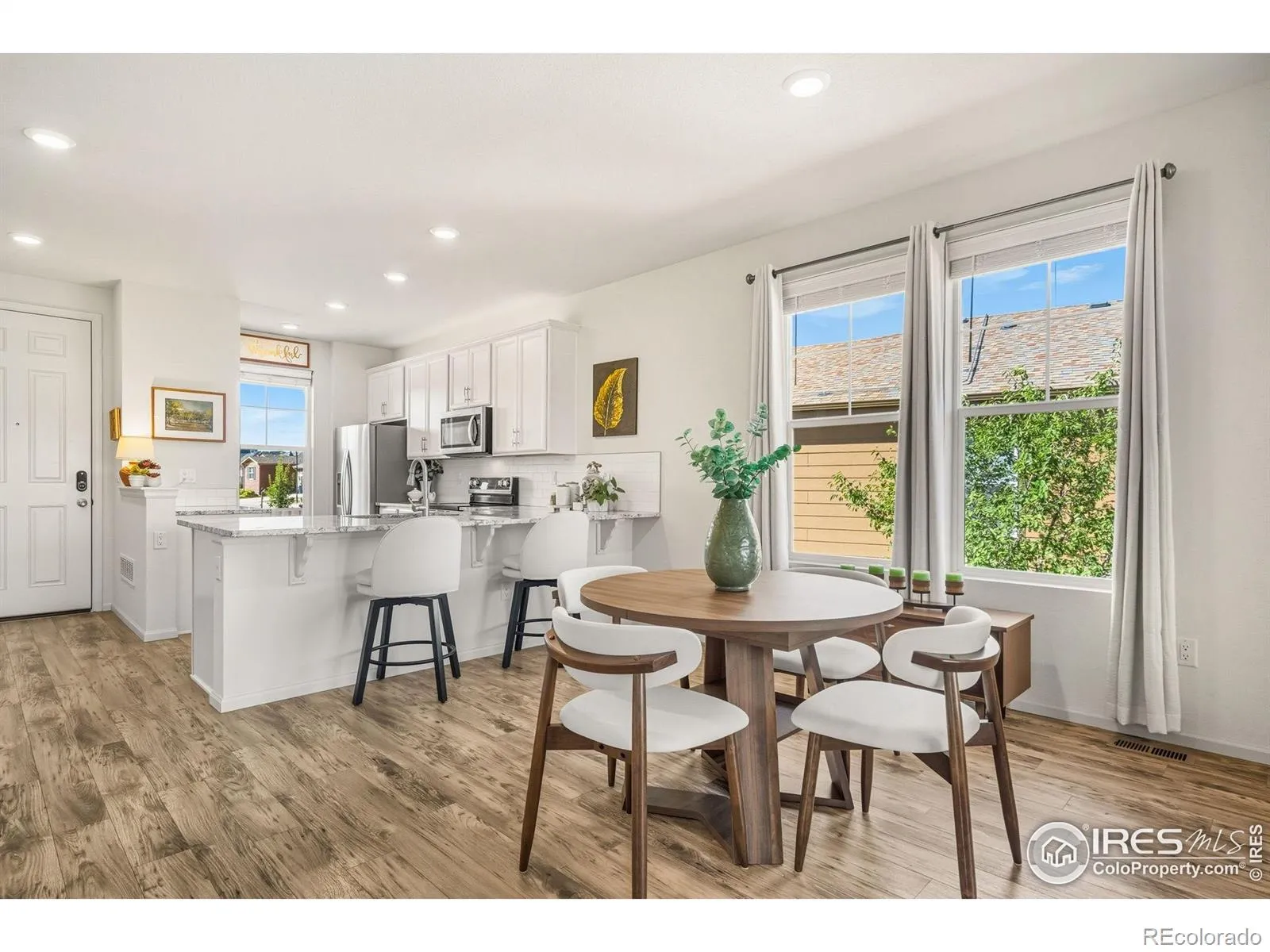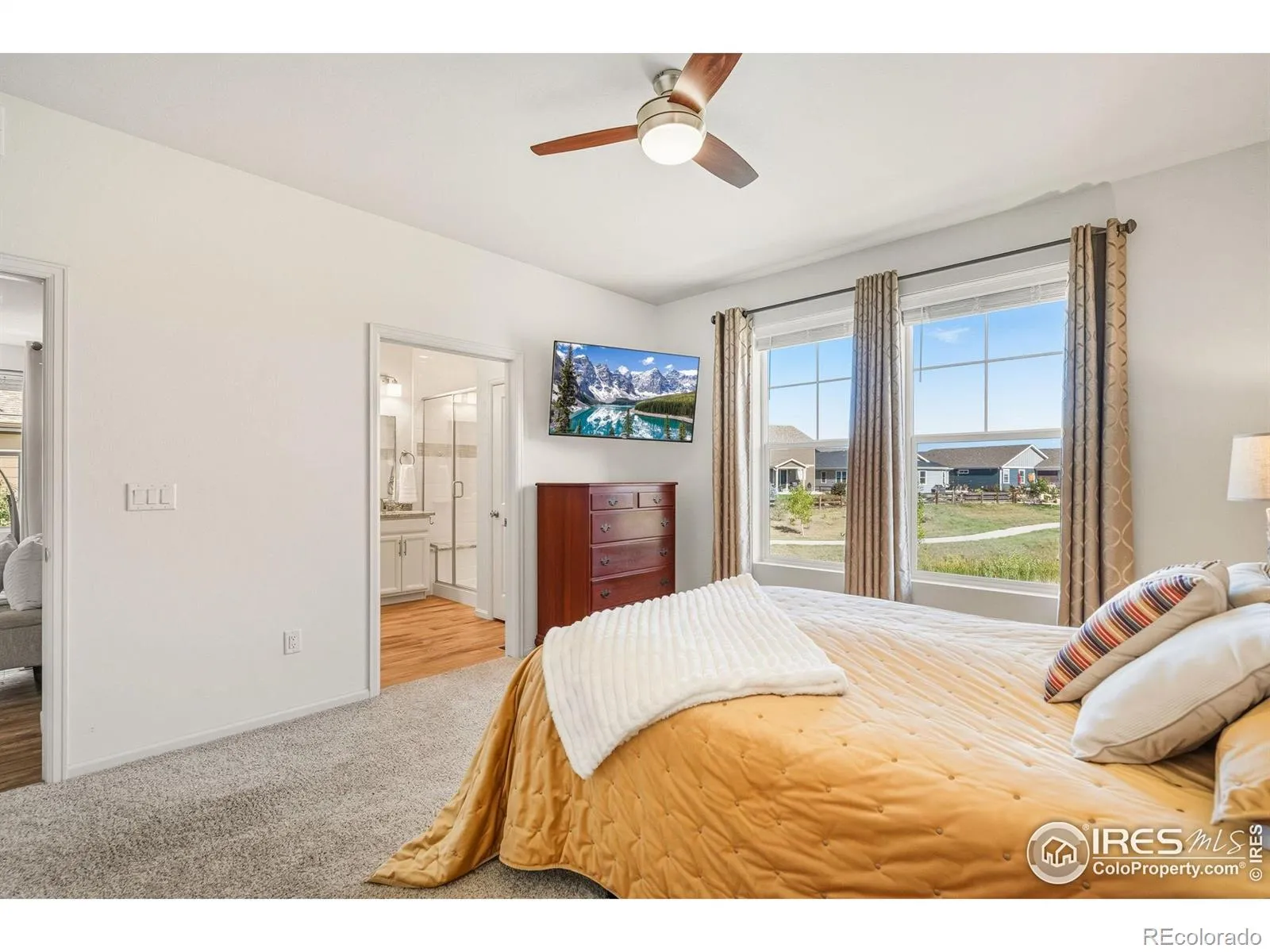 Nature right at your back door! This beautifully maintained single-level home backs to open space and sits just a stone’s throw from Houts Reservoir, offering a serene living environment with abundant outdoor activities right at your doorstep. Located in Loveland’s Lakes at Centerra neighborhood-Colorado’s only Certified Community Wildlife Habitat, you’ll enjoy hundreds of acres of open water for kayaking and fishing, along with miles of scenic trails for bird watching and tranquil walks. Inside, the 3-bedroom, 2-bath layout is open and inviting, enhanced by higher ceilings, oversized doors, and ADA-compliant spaces that provide both comfort and accessibility. The upgraded kitchen package features stainless steel appliances, gleaming granite countertops, a convenient pantry, and a breakfast bar with seating for casual dining or entertaining guests. The primary suite includes its own ensuite bathroom that has a wider door opening. Step outside to the landscaped backyard, where you’ll find a concrete patio equipped with a remote-controlled sunsetter awning, perfect for enjoying the outdoors in comfort. The raised garden beds provide an opportunity for gardening enthusiasts to cultivate their own plants. The extended 2-car garage not only fits vehicles with ease but also provides additional storage space for gear, tools, or hobbies. Perfectly situated, this home offers peaceful surroundings while keeping you close to shopping, dining, and Loveland’s best amenities, all within Centerra’s beautiful setting.